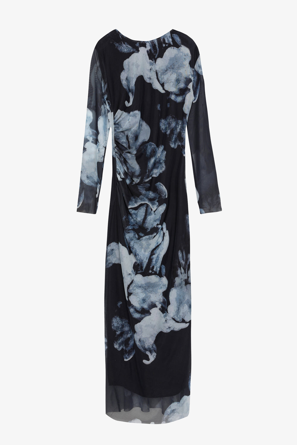 Sulu Boya Çiçek Desenli Drapeli Tül Elbise Lacivert