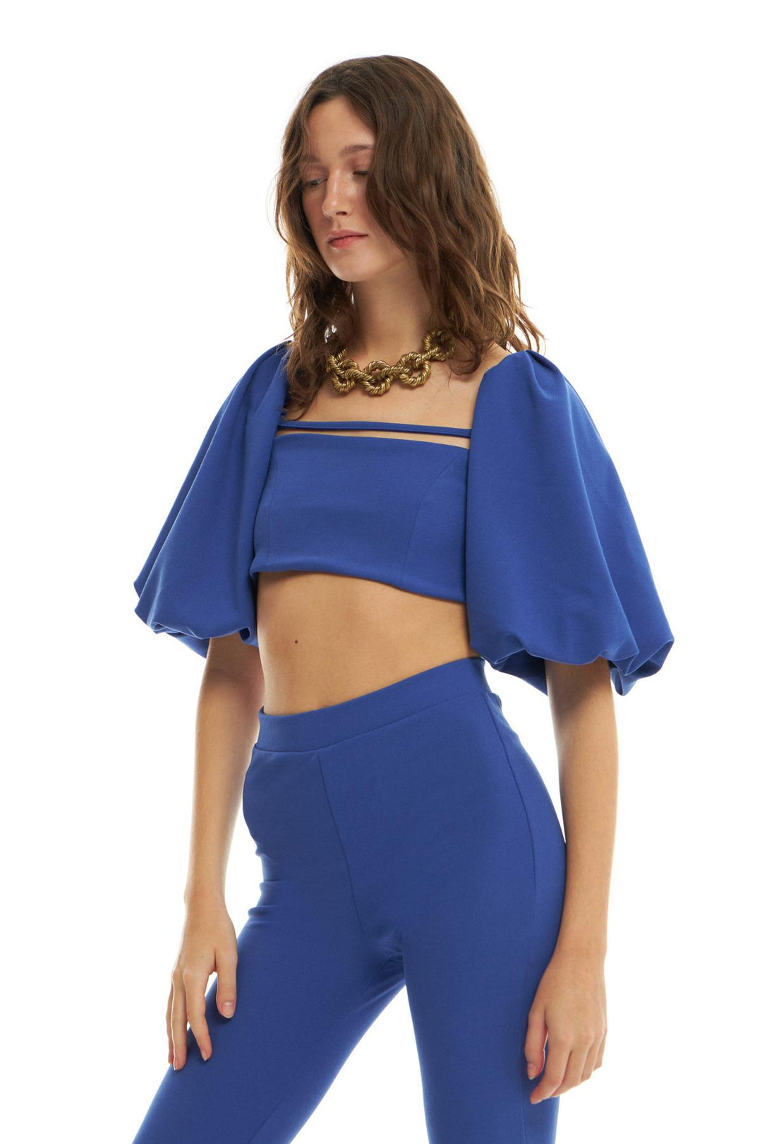 Kare yaka, arkası kancalı, crop kesim, arkası ipli bağlamalı, ipi ayarlanabilir, balon kol bluz.