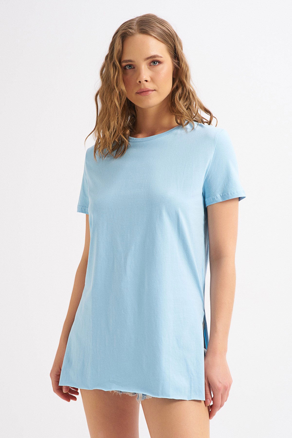 Bisiklet Yaka Yanı Yırtmaçlı Tişört Mavi