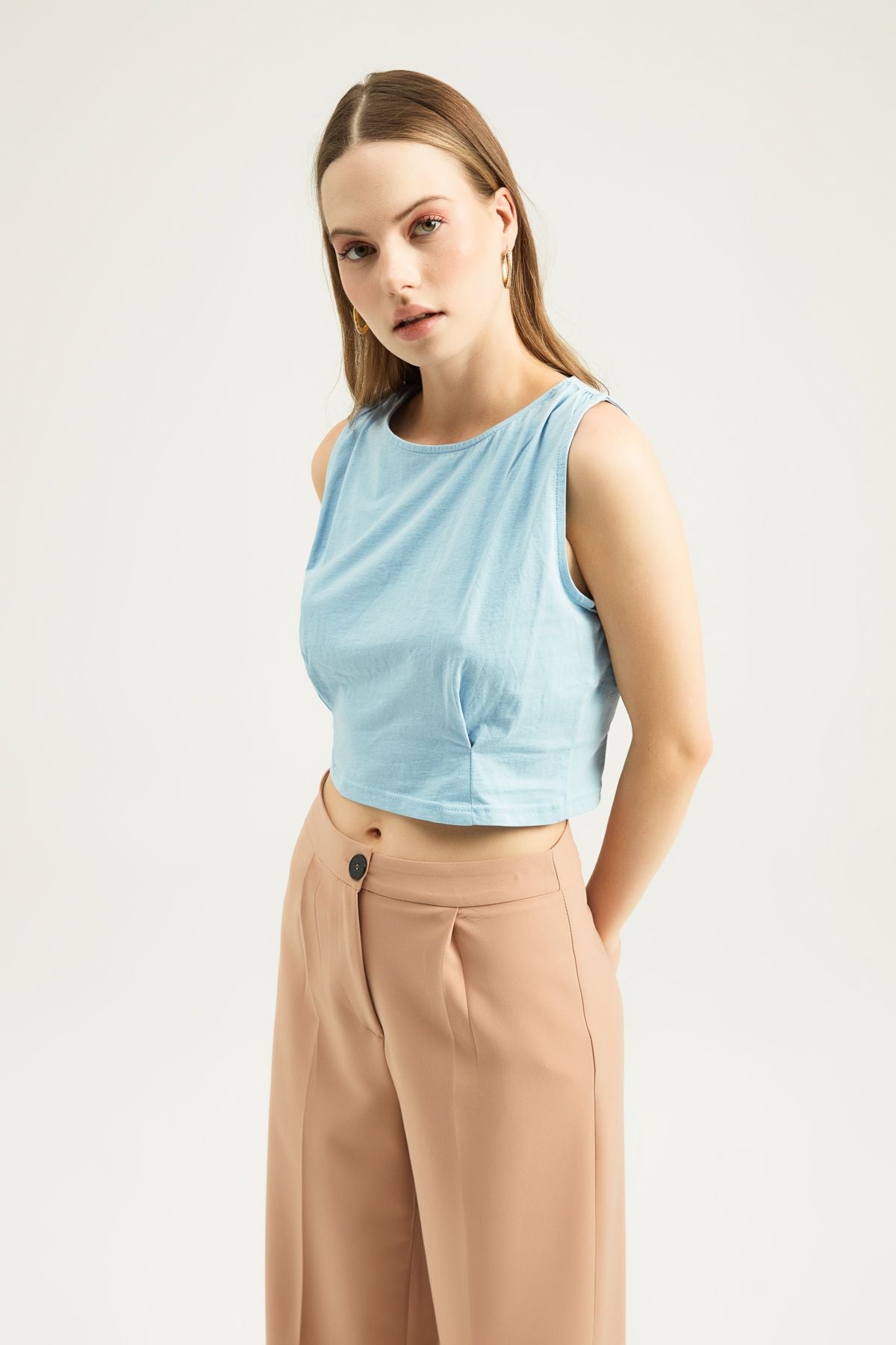 Kalın askılı ve omuz kısmında büzgü bulunan crop bluz,göğüs altında ve arka sırt kısmında pens bulunmaktadır.