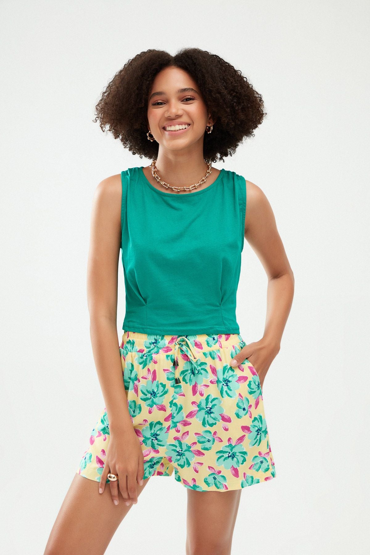 Kalın askılı ve omuz kısmında büzgü bulunan crop bluz,göğüs altında ve arka sırt kısmında pens bulunmaktadır.