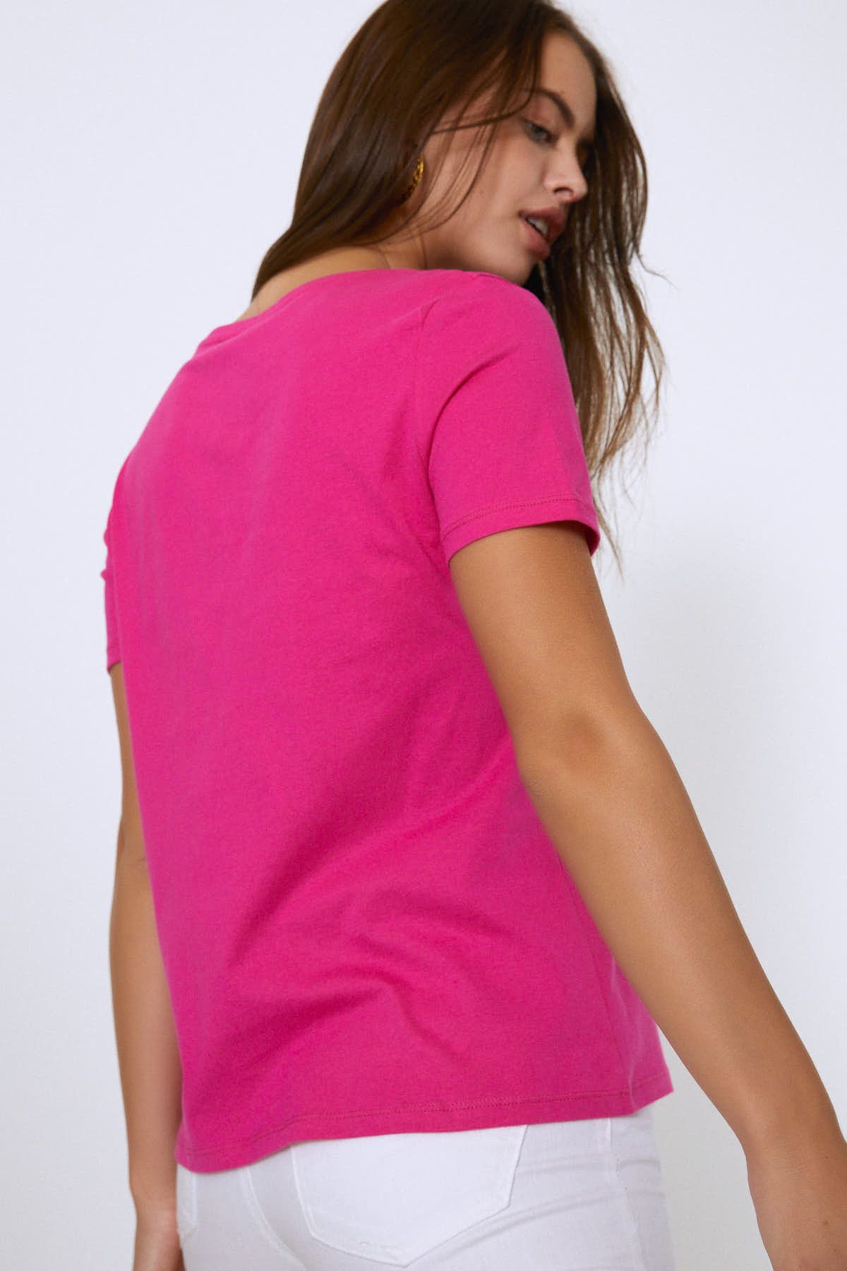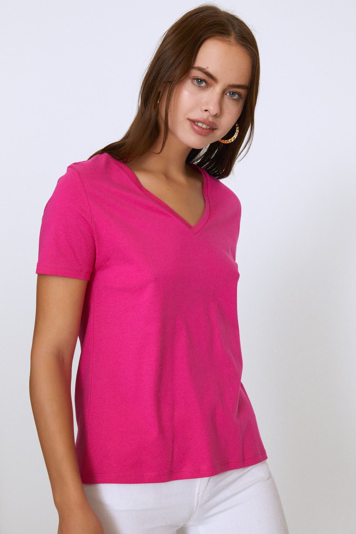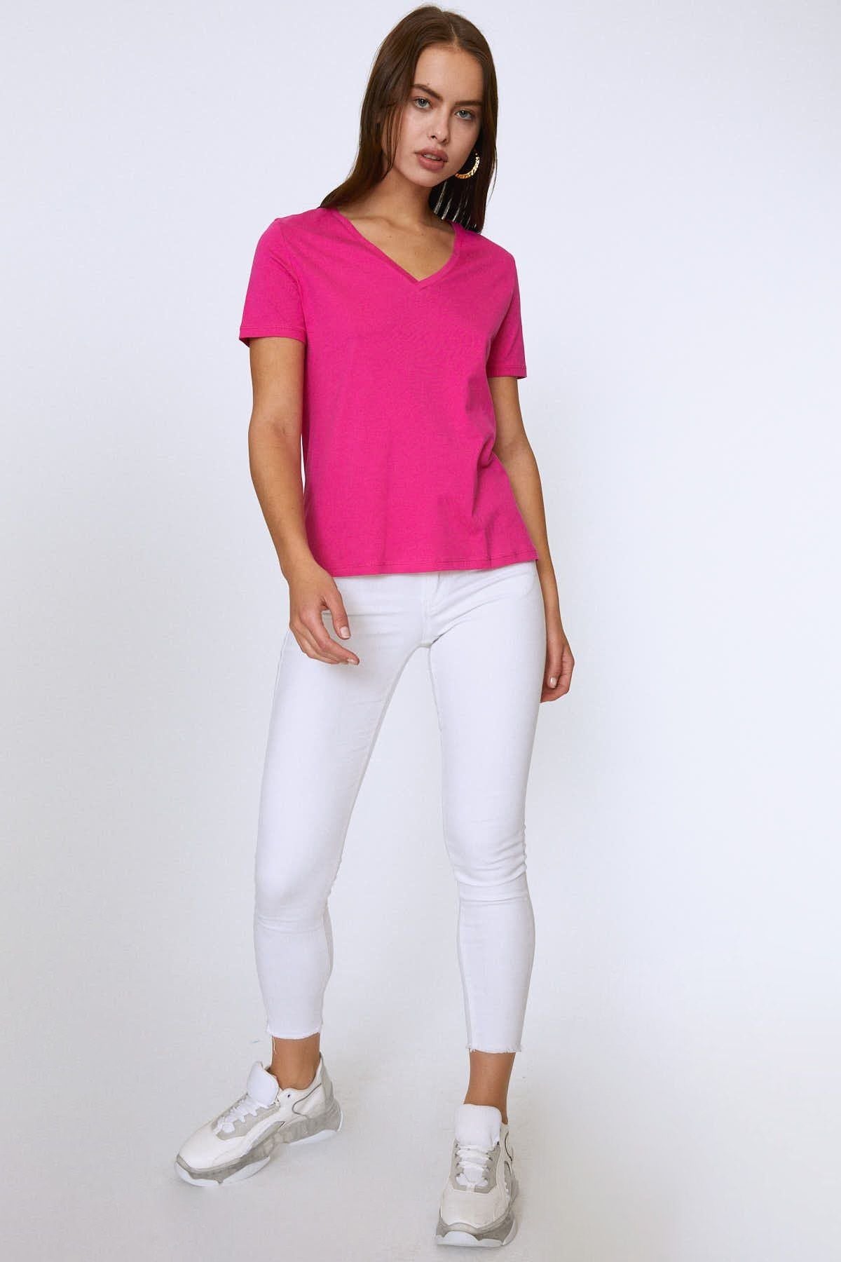 V Yaka Basic Tişört Fuşya