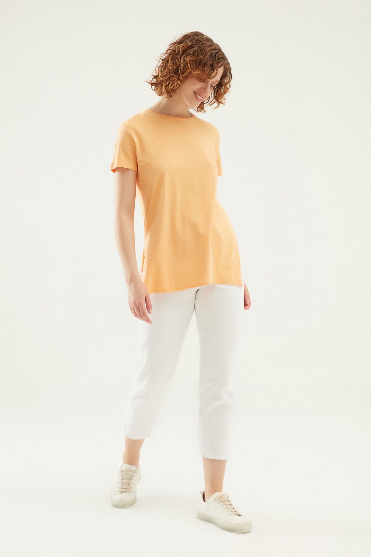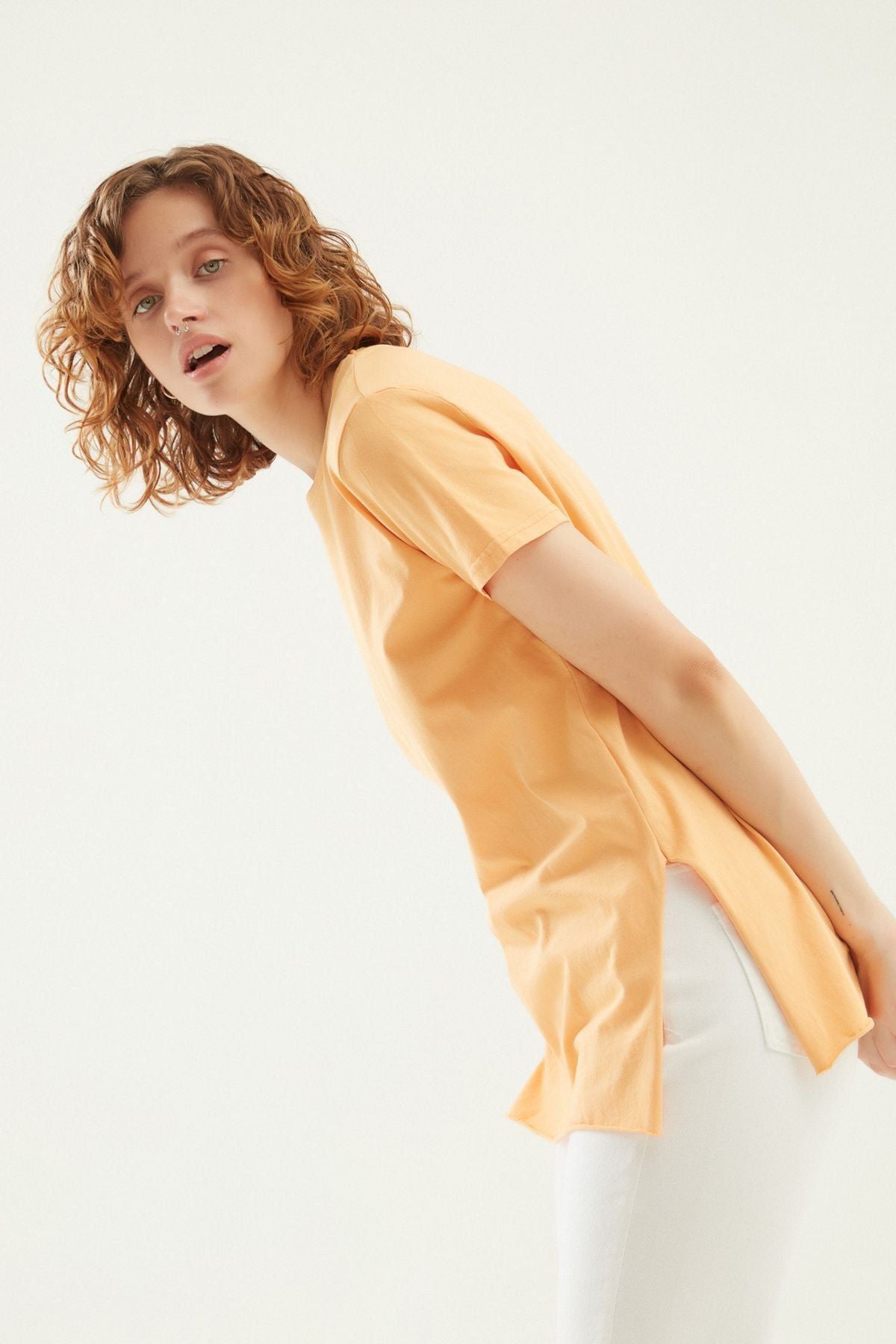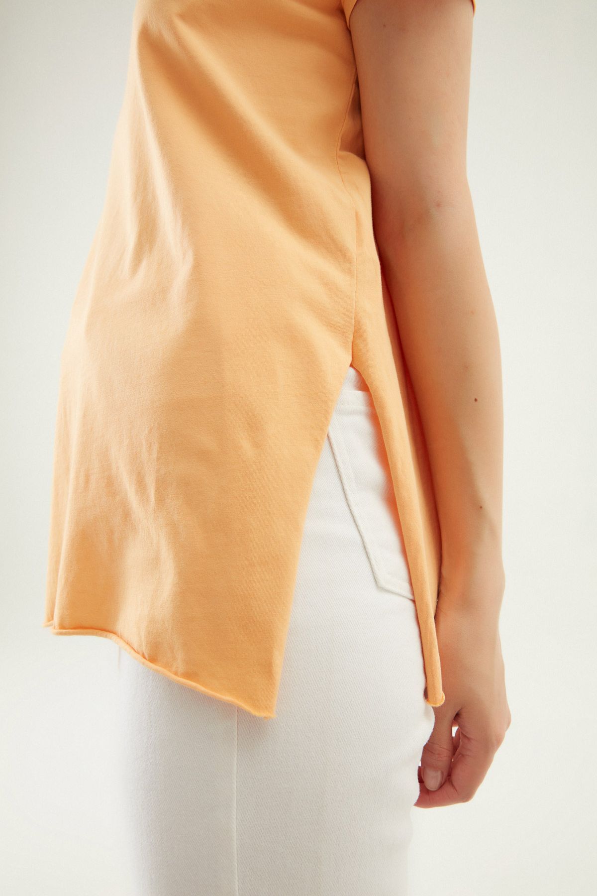 Yanı Yırtmaçlı Bisiklet Yaka Tişört Açık Oranj