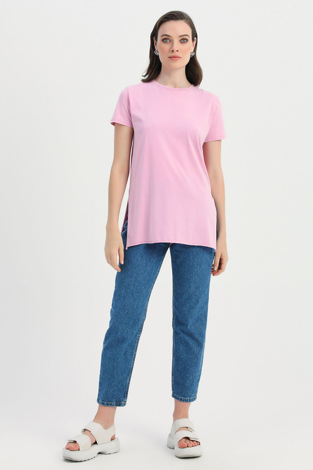 Yanı Yırtmaçlı Bisiklet Yaka Tişört Pembe