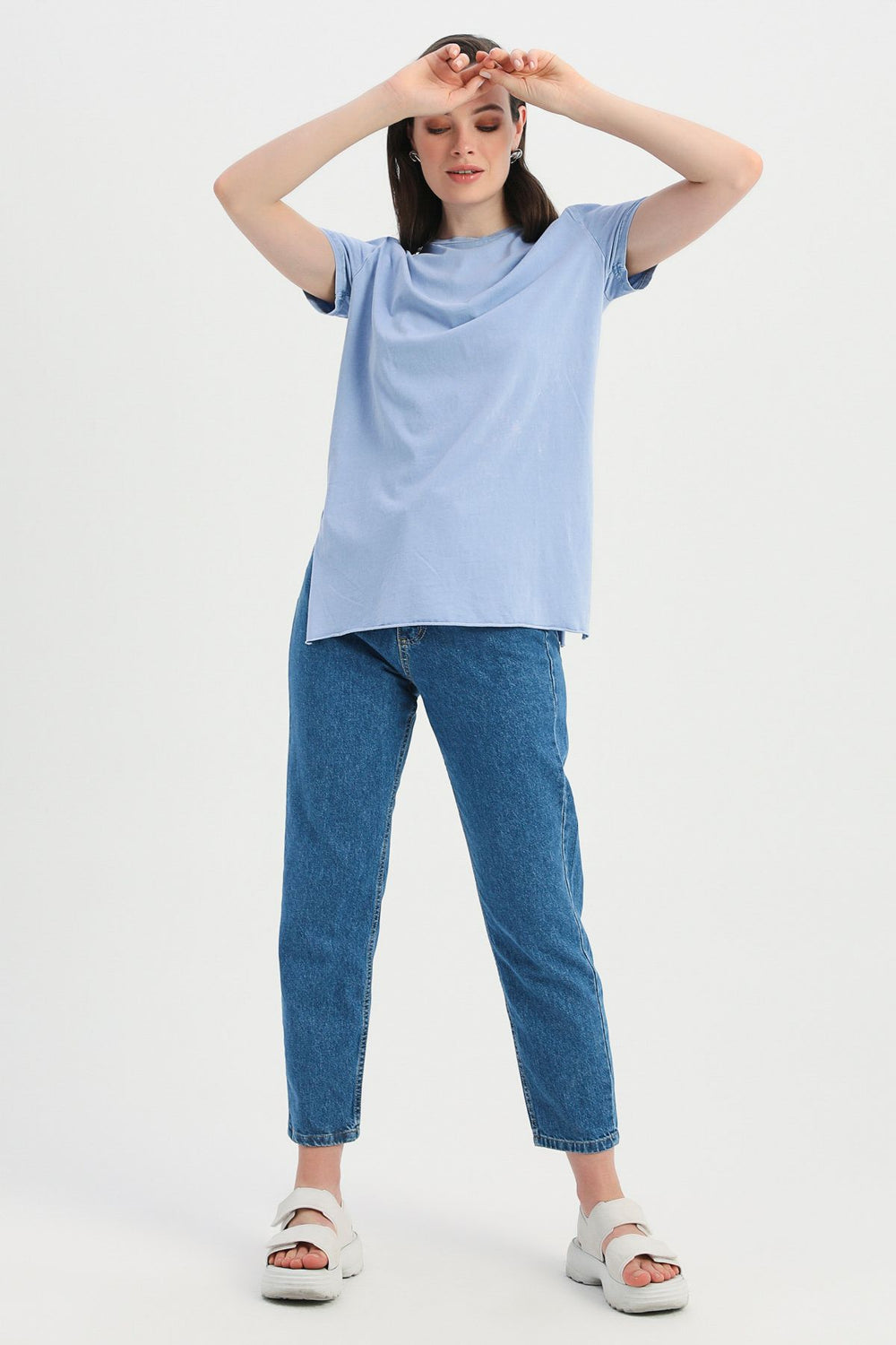 Yanı Yırtmaçlı Bisiklet Yaka Tişört Mavi