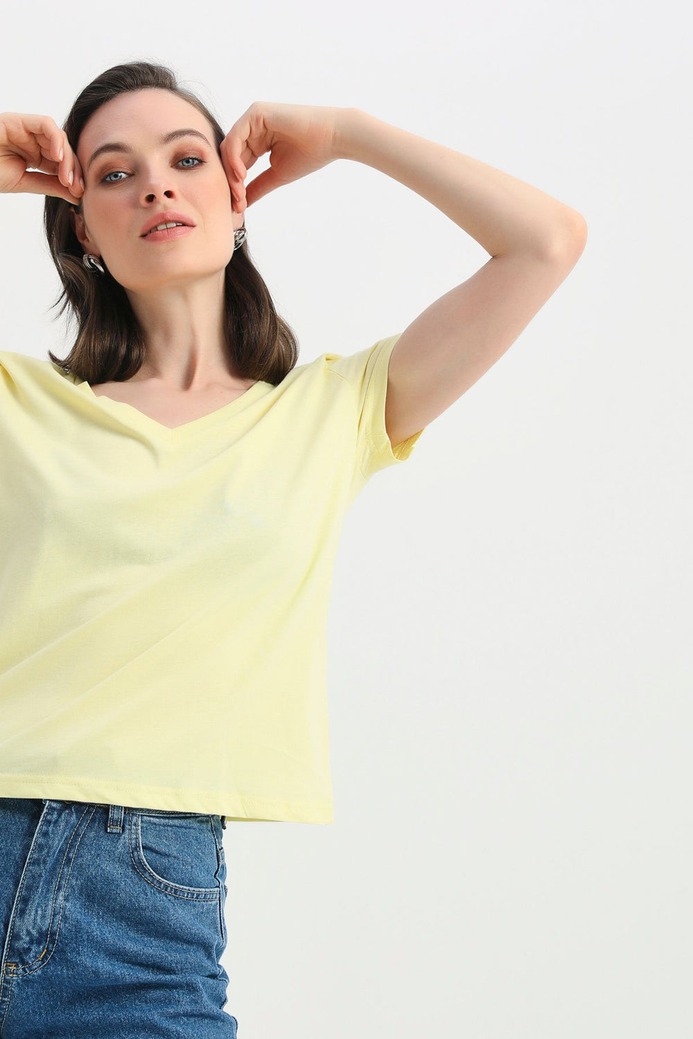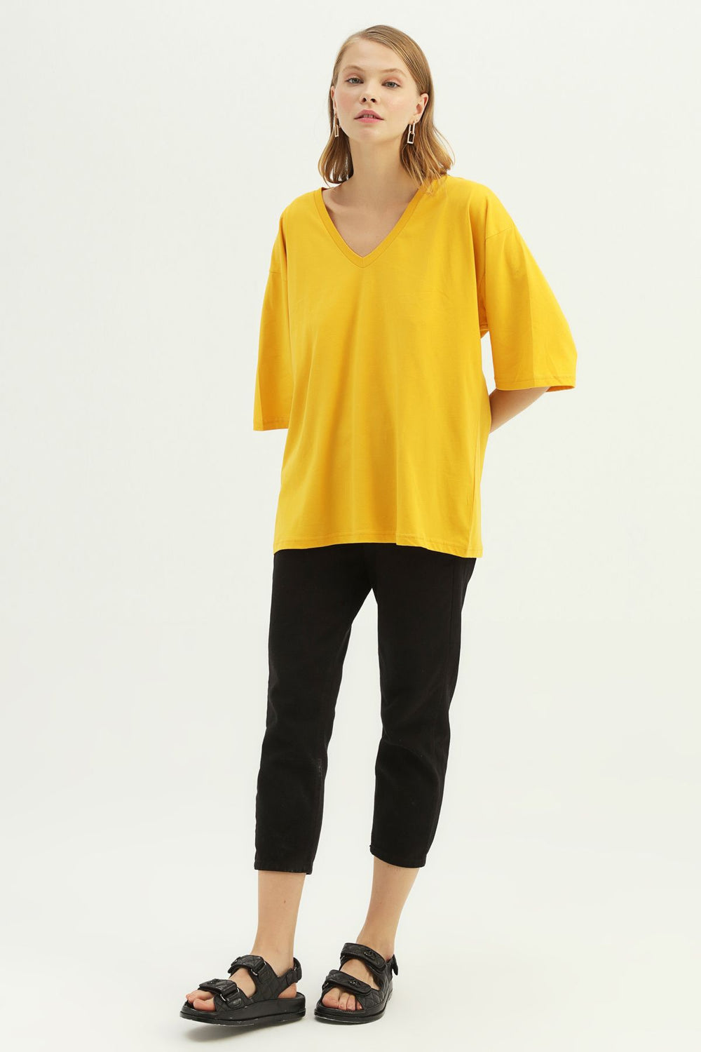 Vatkalı V Yaka Tişört Sarı