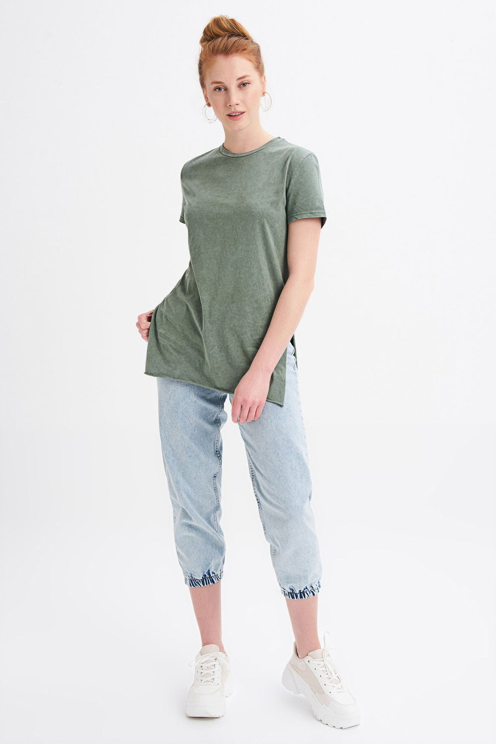 Yanı Yırtmaçlı Bisiklet Yaka Tişört Haki