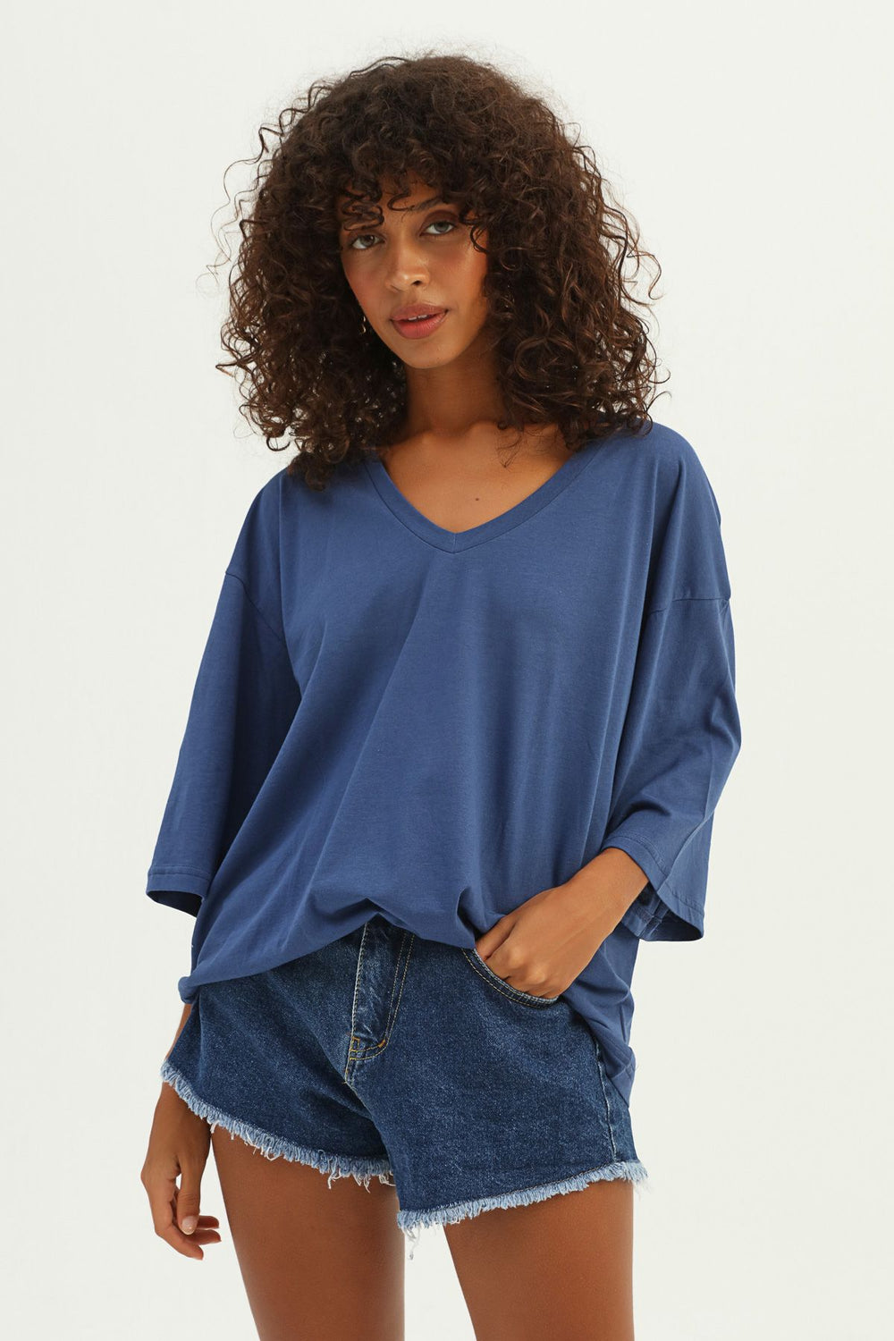 V Yaka Truvakar Kol Tişört İndigo