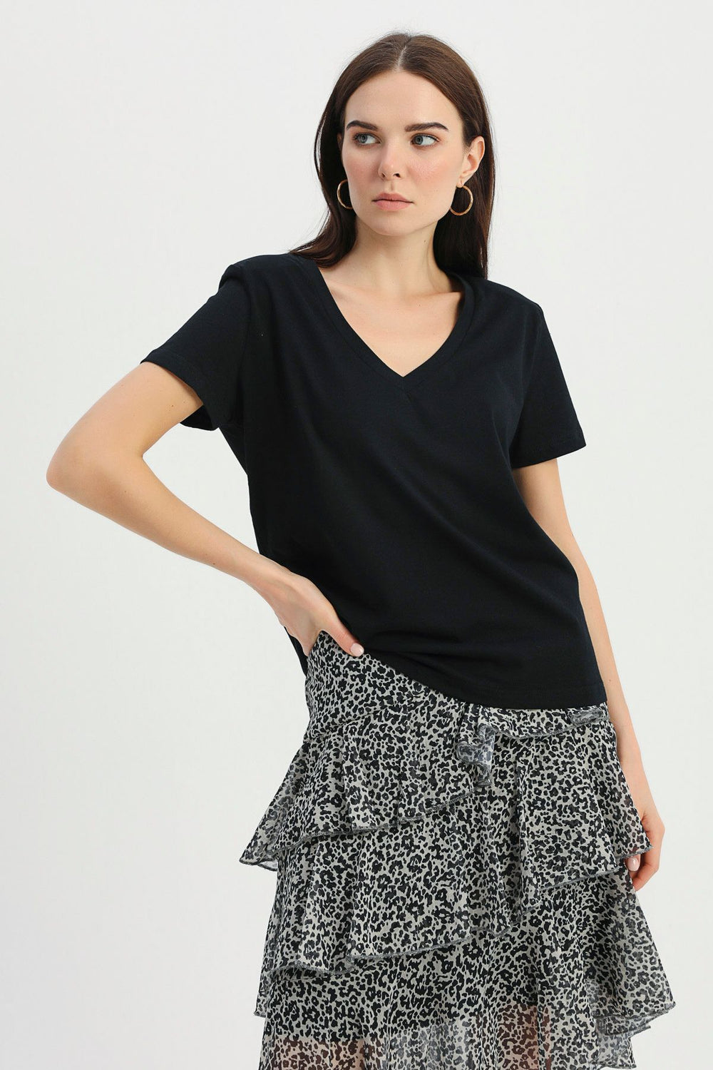 Vatkalı V Yaka Tişört Siyah