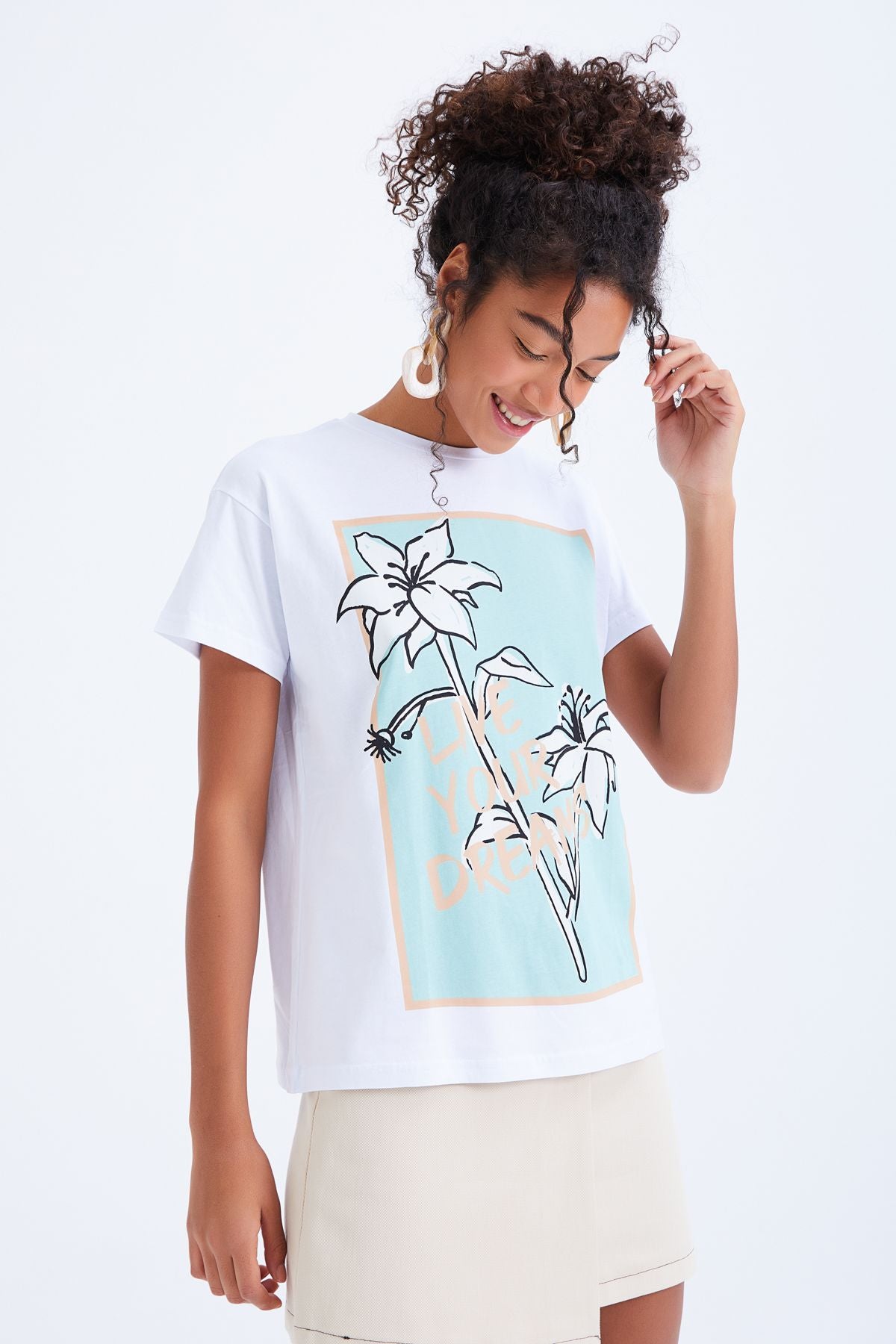 Baskısı ile bahar esintisini dolabına taşımaya hazırlanan t-shirt, bisiklet yakası ile klasik bir kesimin rahatlığını da sunuyor. T-shirtünü Quzu etekleri ile tamamlayarak daha ferah bir tarz yaratabilirsin.