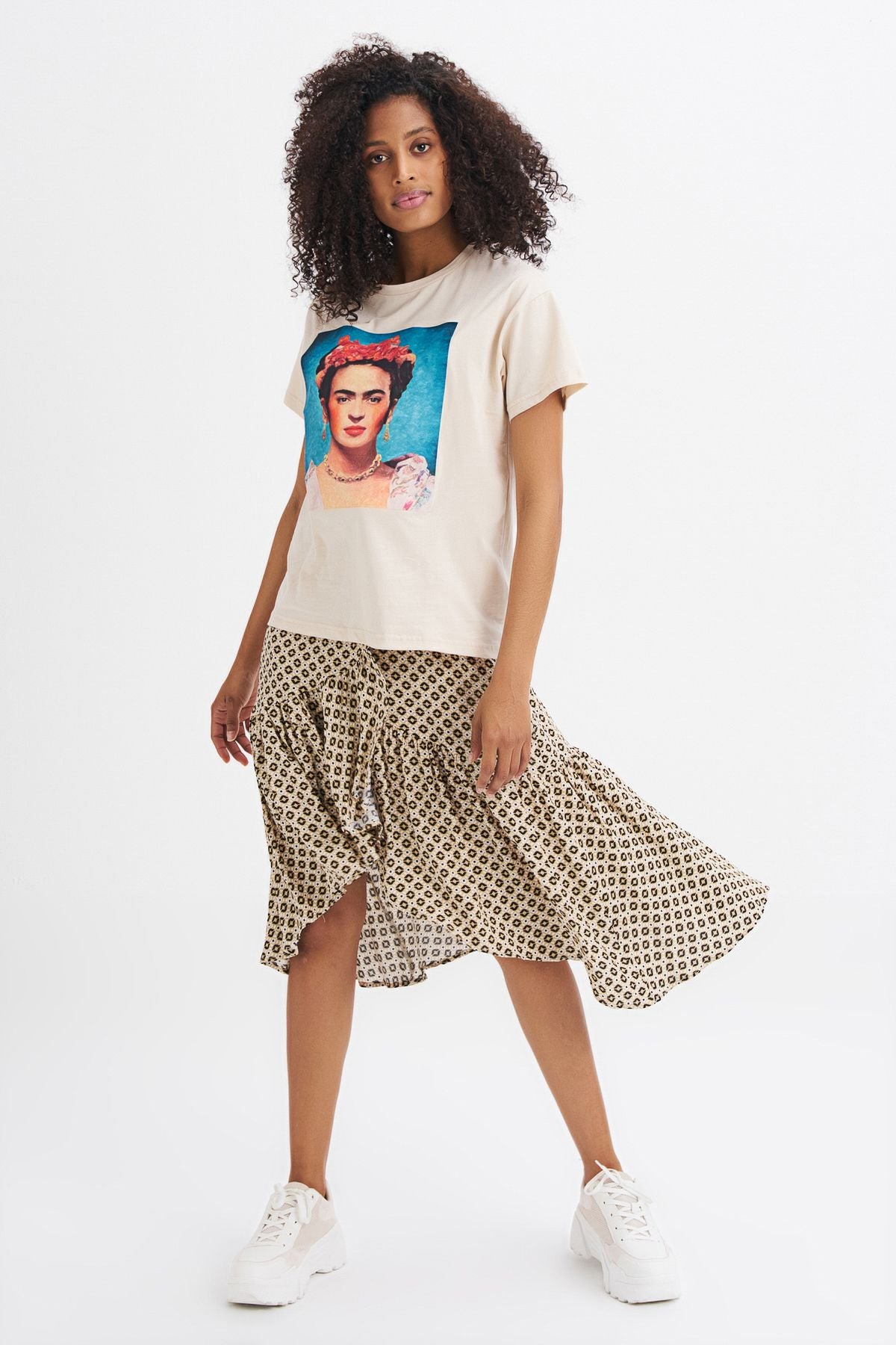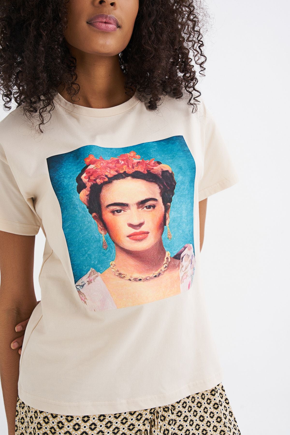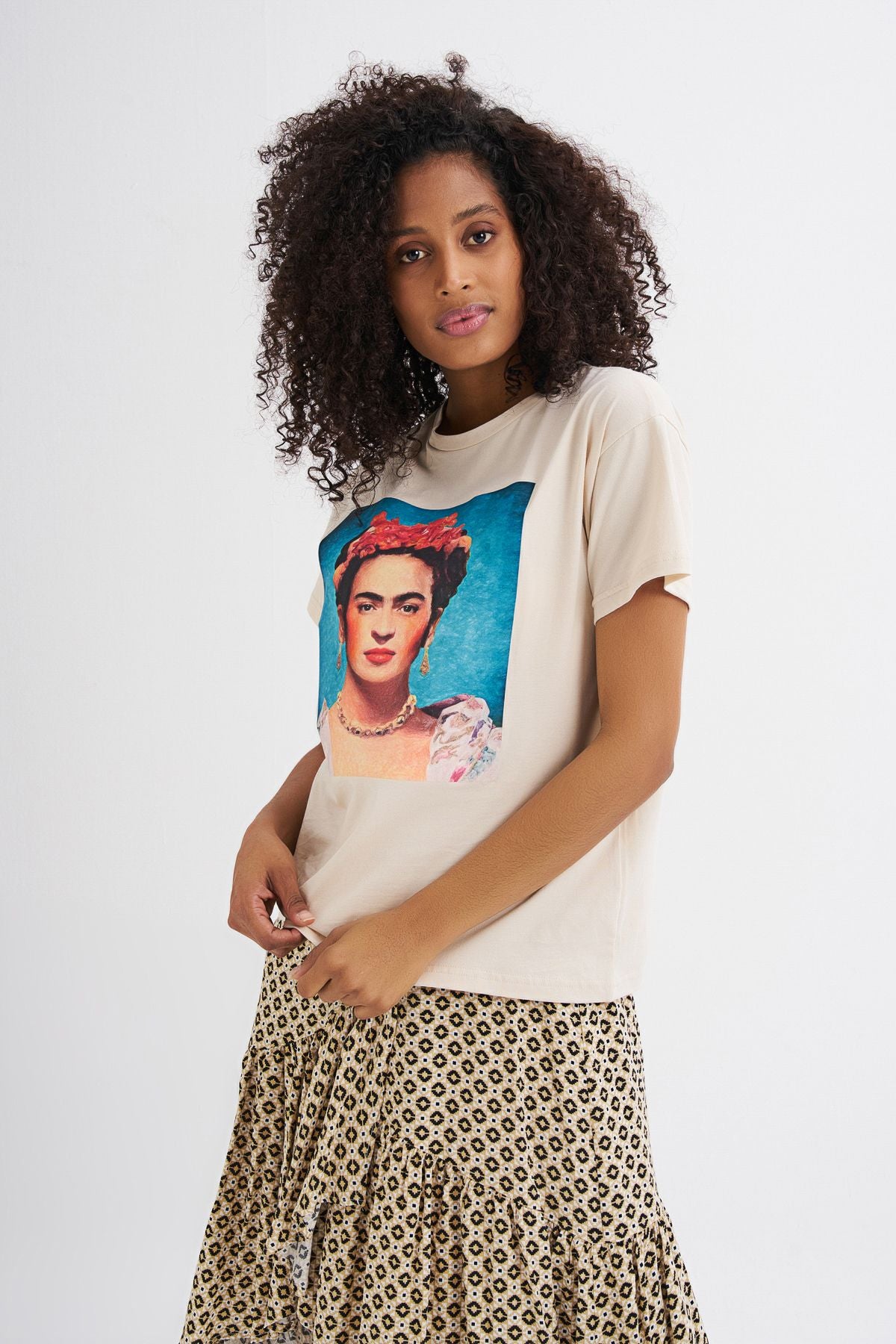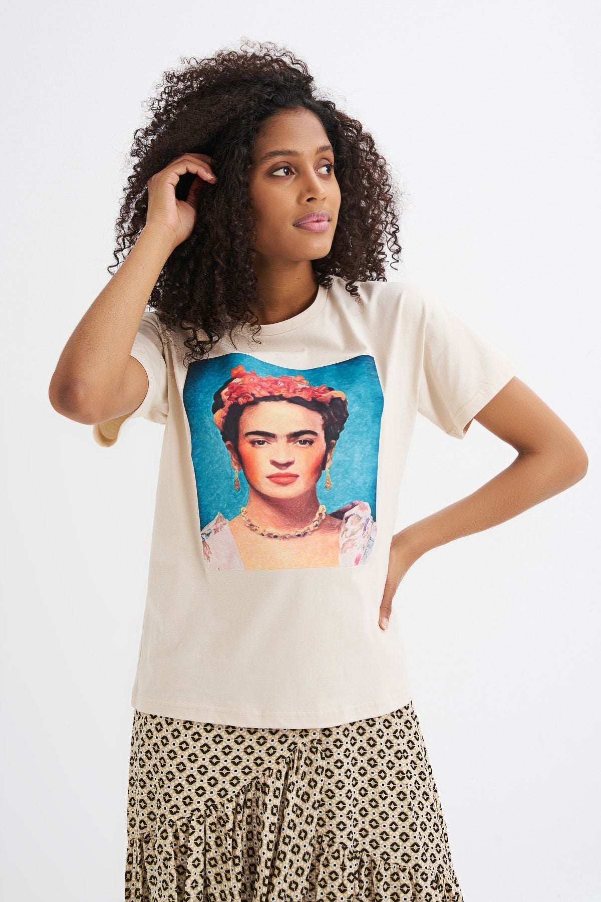 Viva la vida! Frida Kahlo baskılı %100 pamuklu tişört, feminen kombinlerinin vazgeçilmez bir parçası haline gelecek.