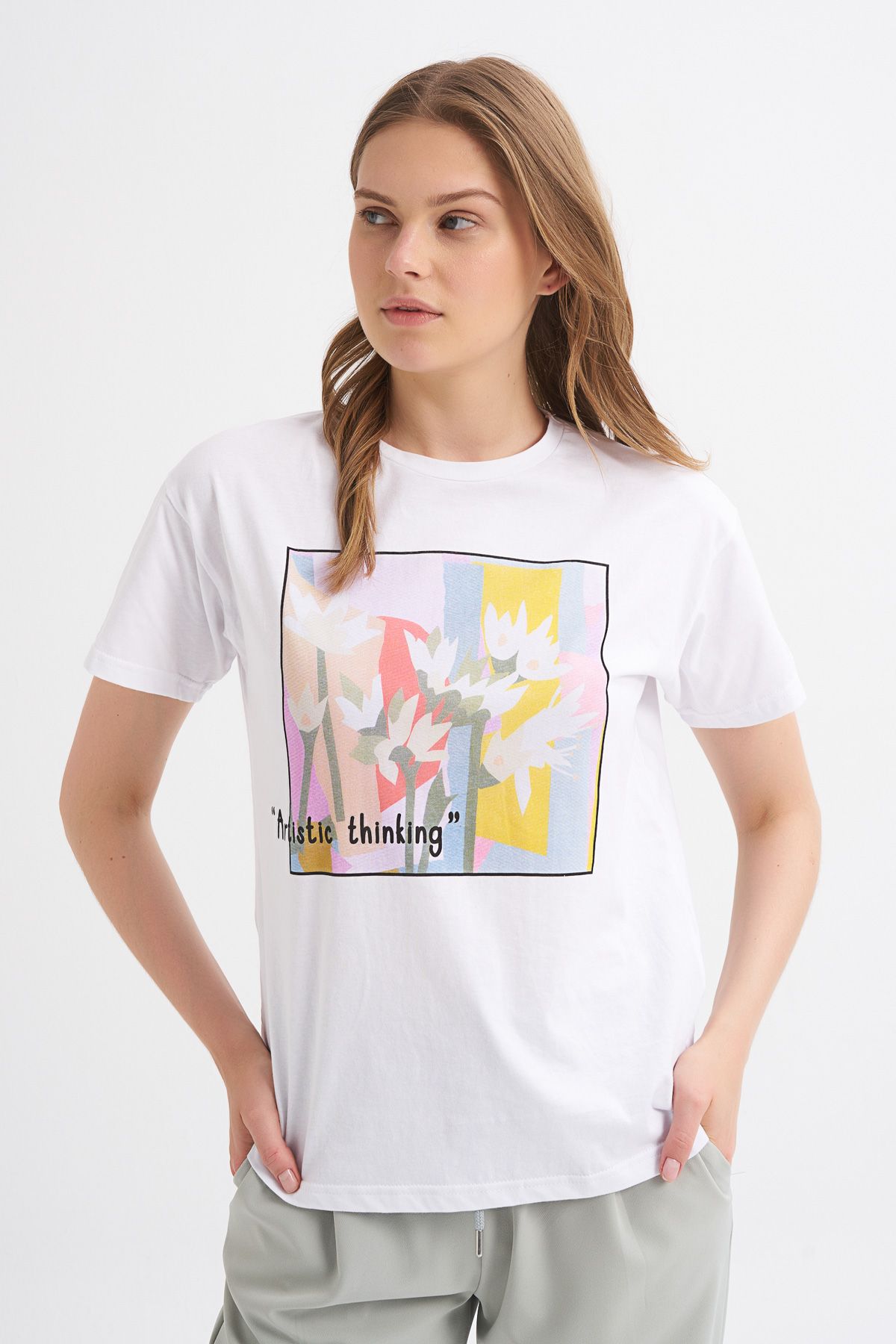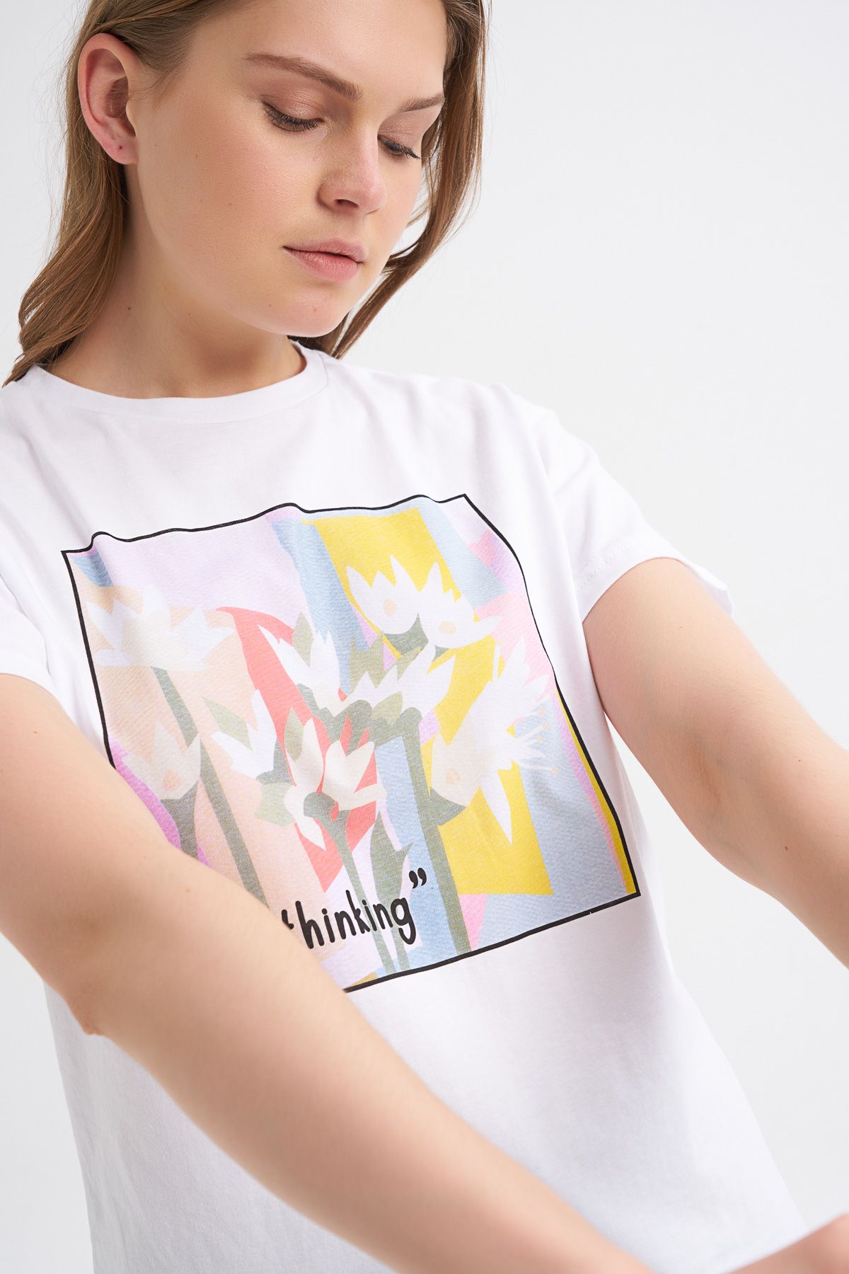 %100 pamuklu nefes alan formu, bir jean ile rahatlıkla kombinleyebileceğin yapısı ile baskılı tişört, günlük kombinlerinin favori parçası olacak.