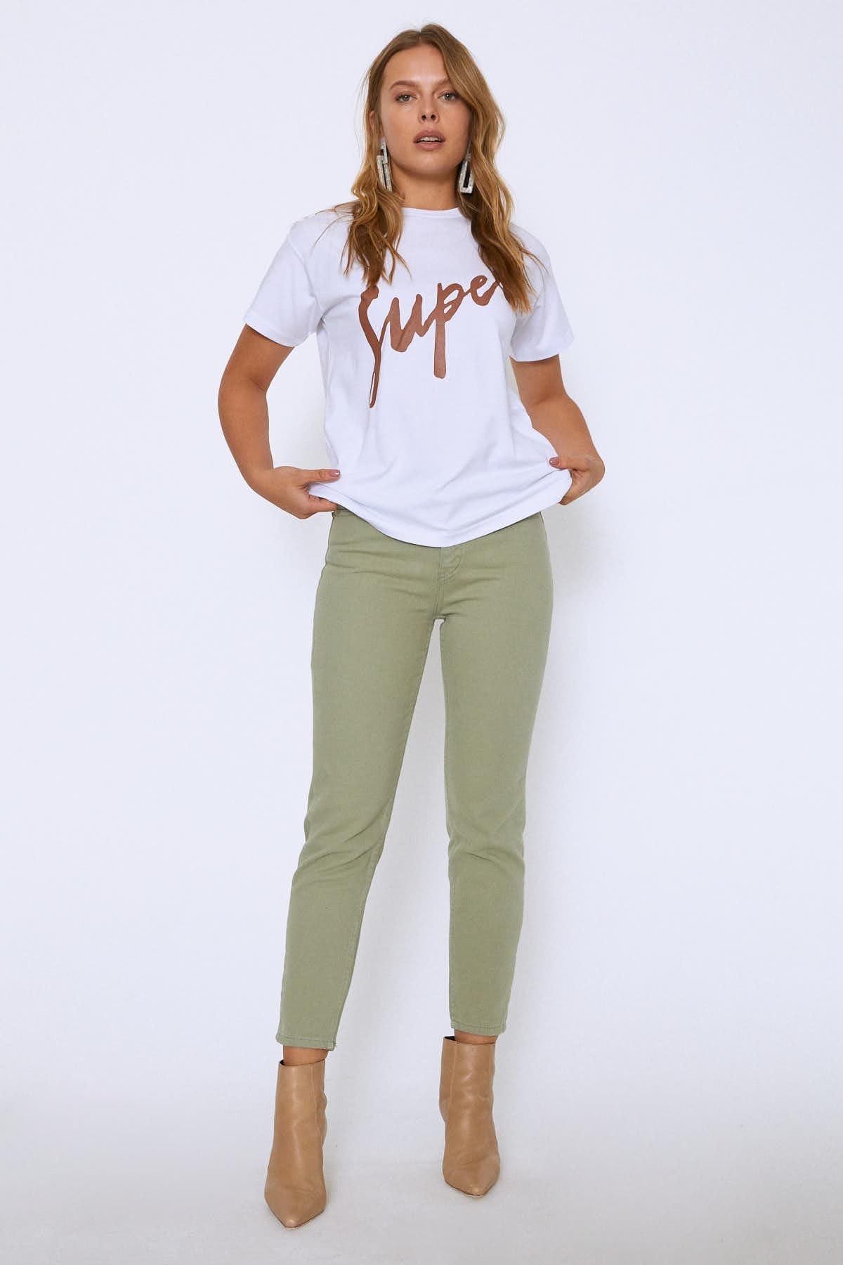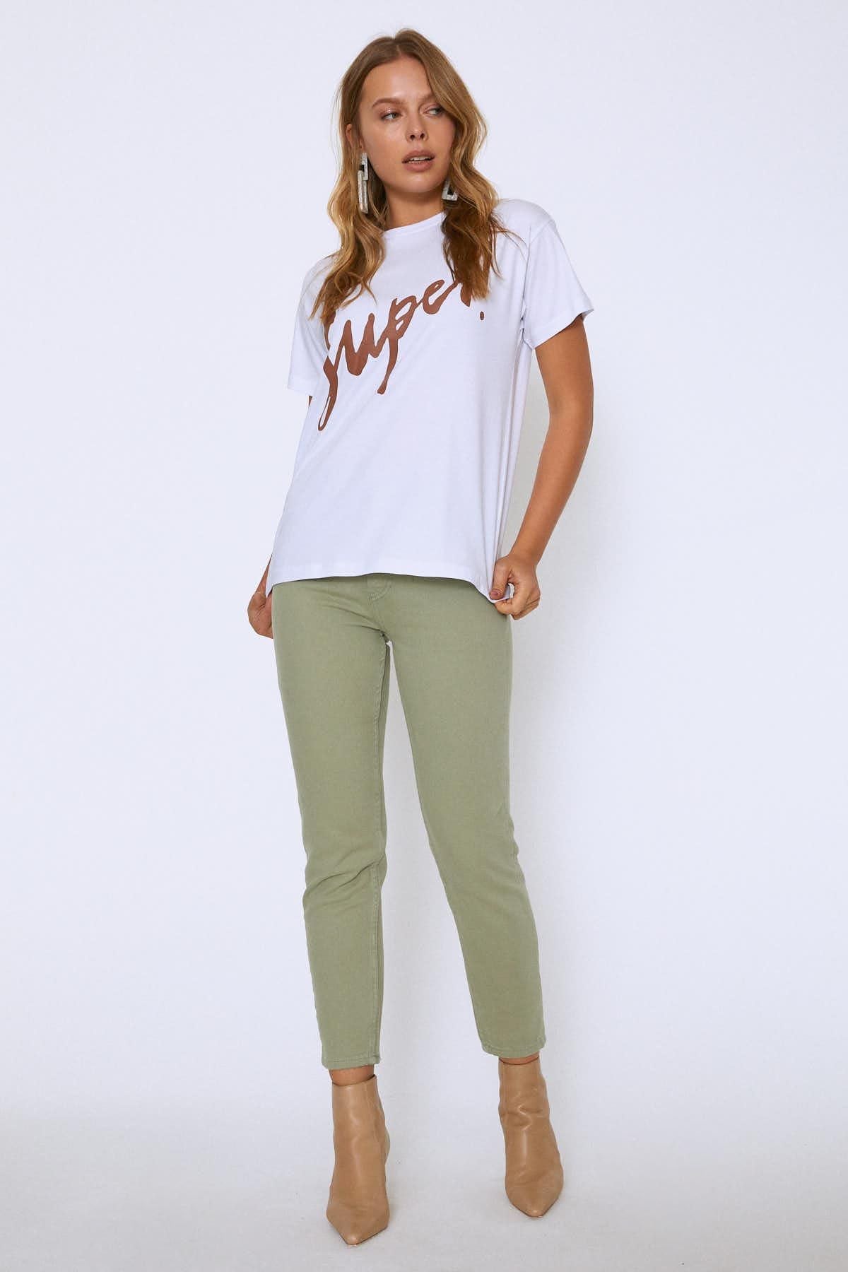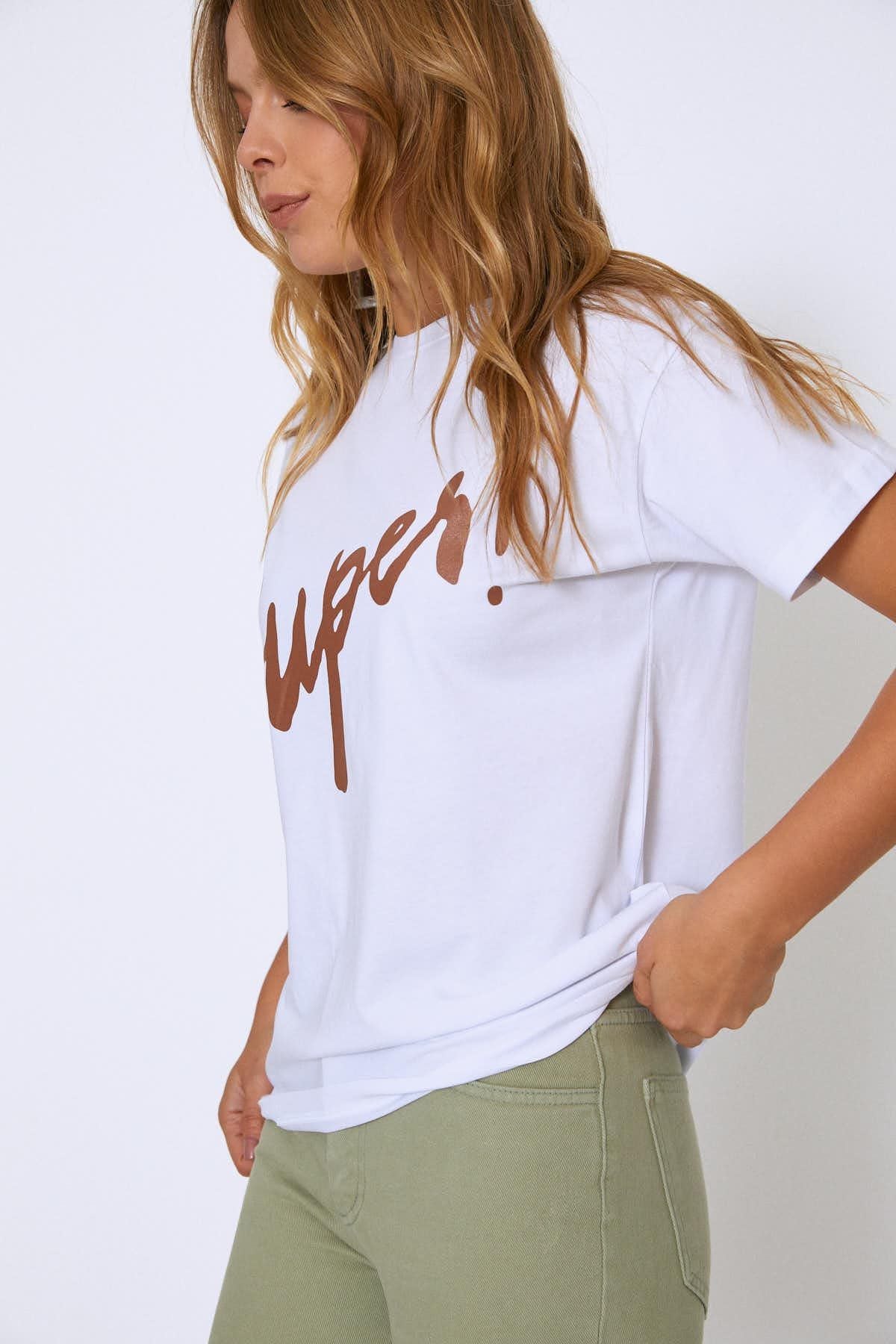 Önünde yer alan baskısı ile bacis üst grup tasarımlarına yeni bir hava getiren t-shirtünü skinny jeanlerle tamamlamak çok keyifli.