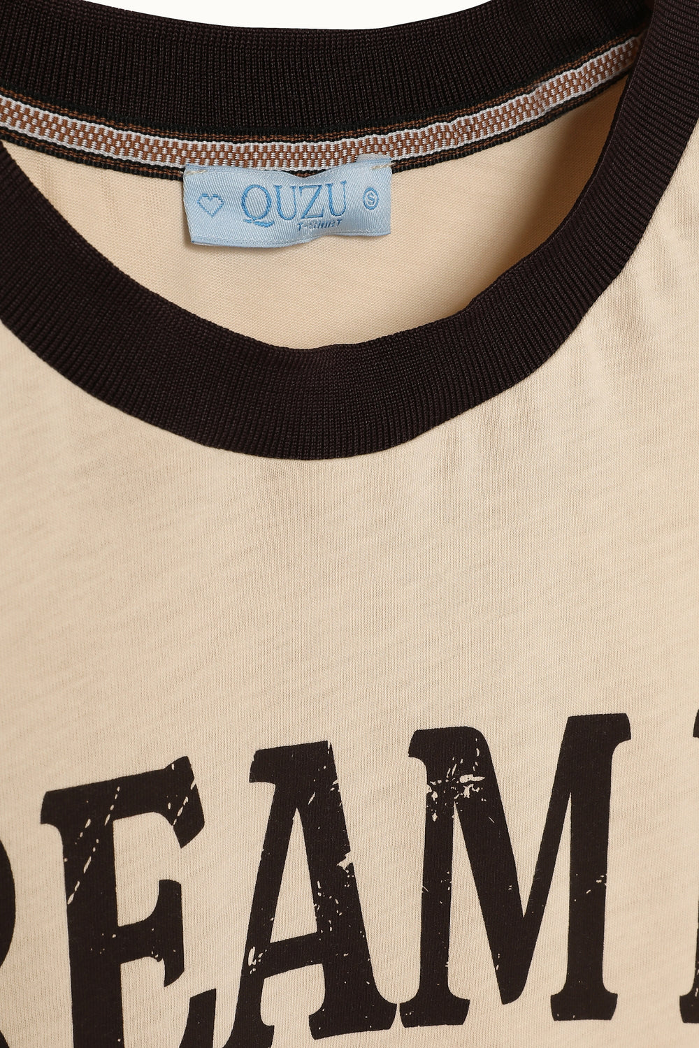 Bisiklet yaka, kısa kollu, kontrast renk biye detaylı, ön kısmı yazı ve çiçek baskılı, rahat kalıp, sportif görünüm sunan tişört.