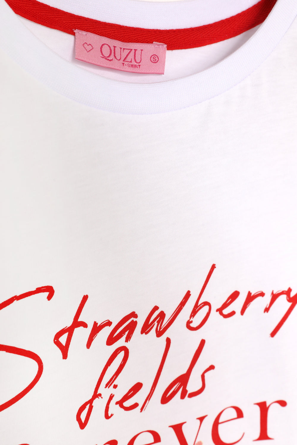Çilek Baskılı Yazı Nakışlı Tişört Beyaz