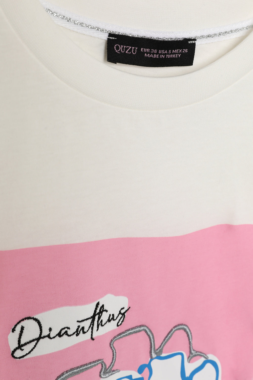 Ön kısmı çiçek desenli nakış baskılı, bisiklet yaka, kısa kollu, rahat kalıp, modern ve sportif görünümlü tişört.