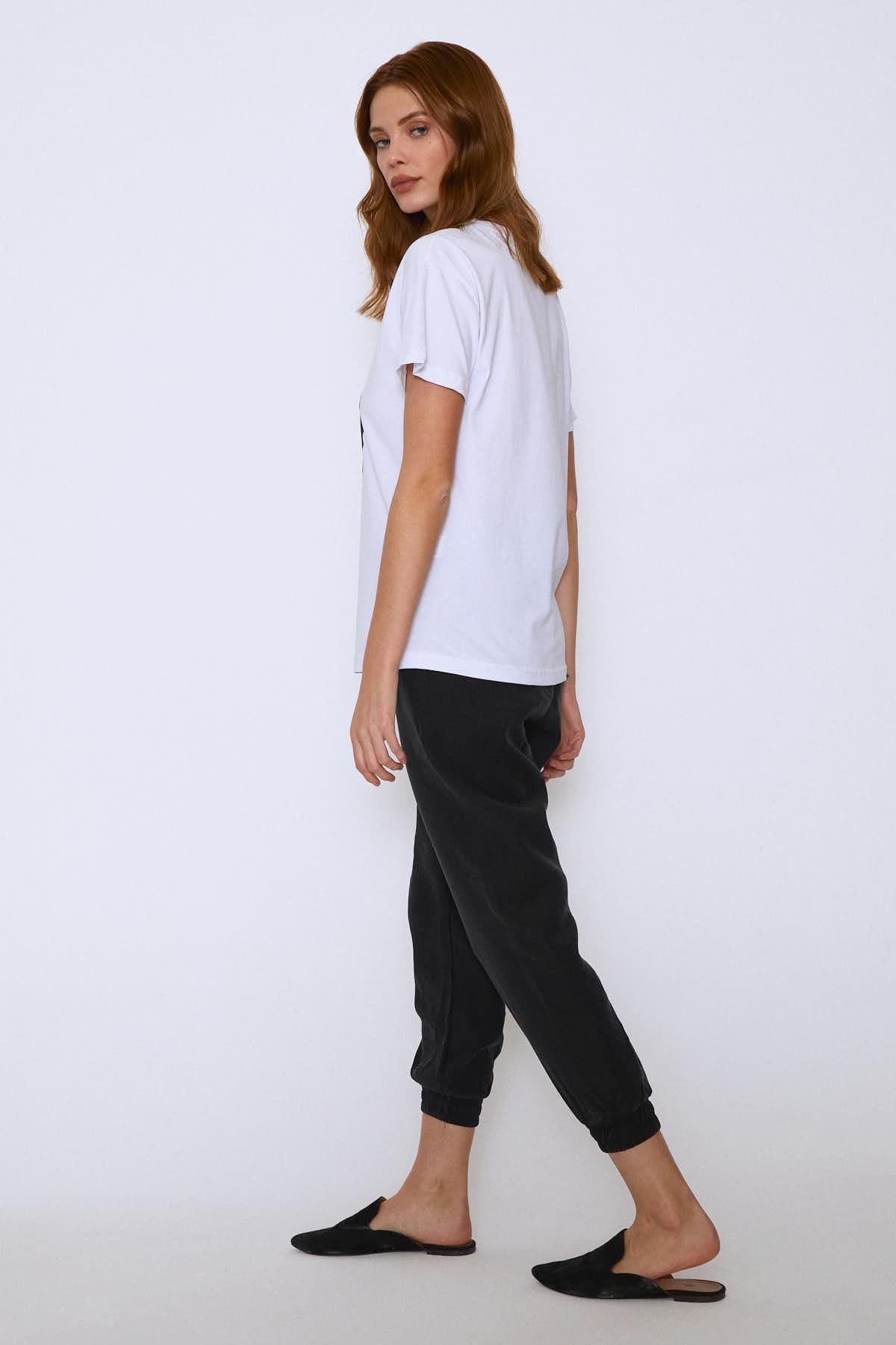 Sade zemin üzerinde oluşturulan etkileyeci baskı, t-shirtü daha göz alıcı hale getiriyor. Ön kısımda yer alan detayın eğlenceli havasını taşıyan t-shirtü salaş pantolonlarla kombinleyebilirsin.