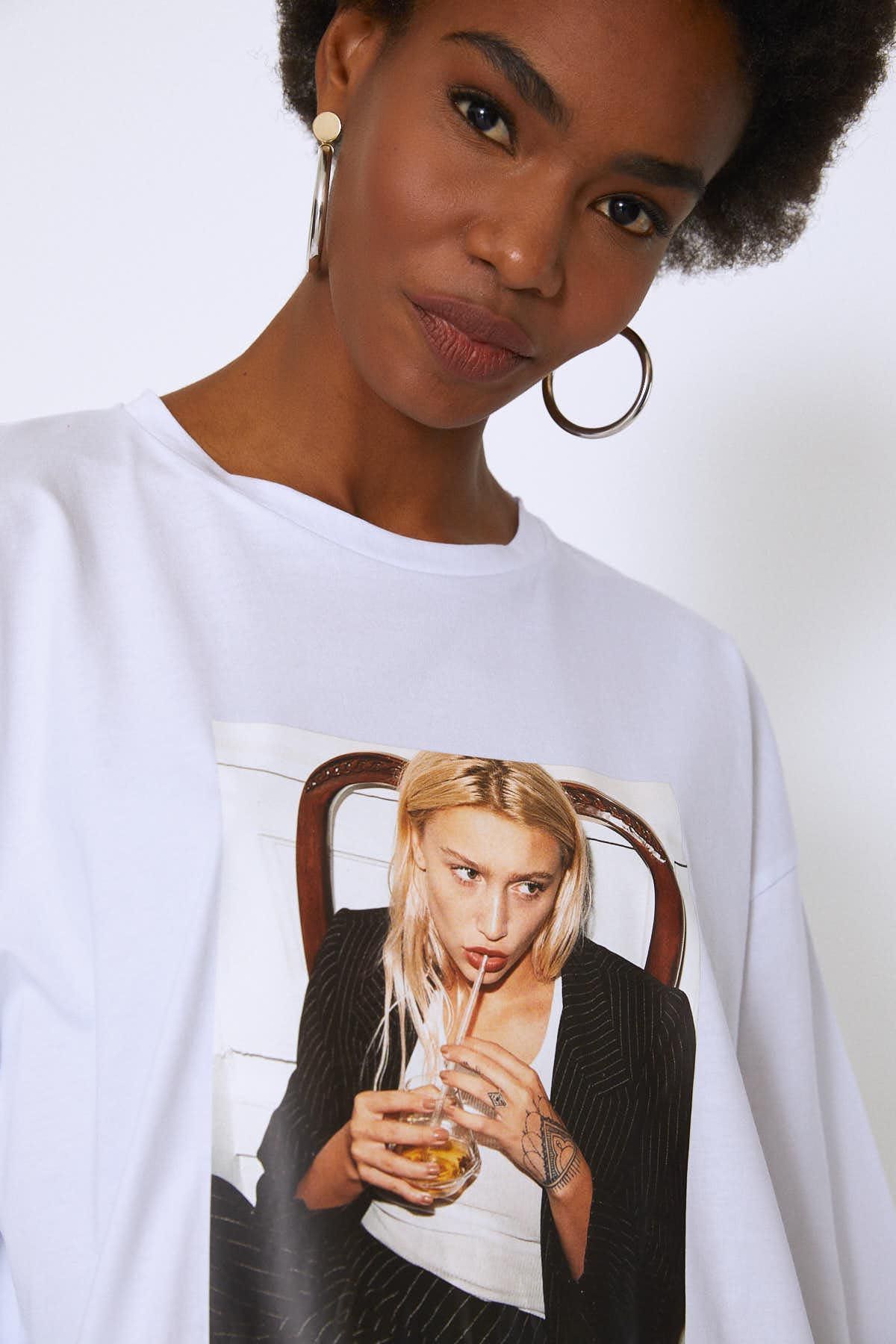 Oversize Baskılı Tişört Beyaz