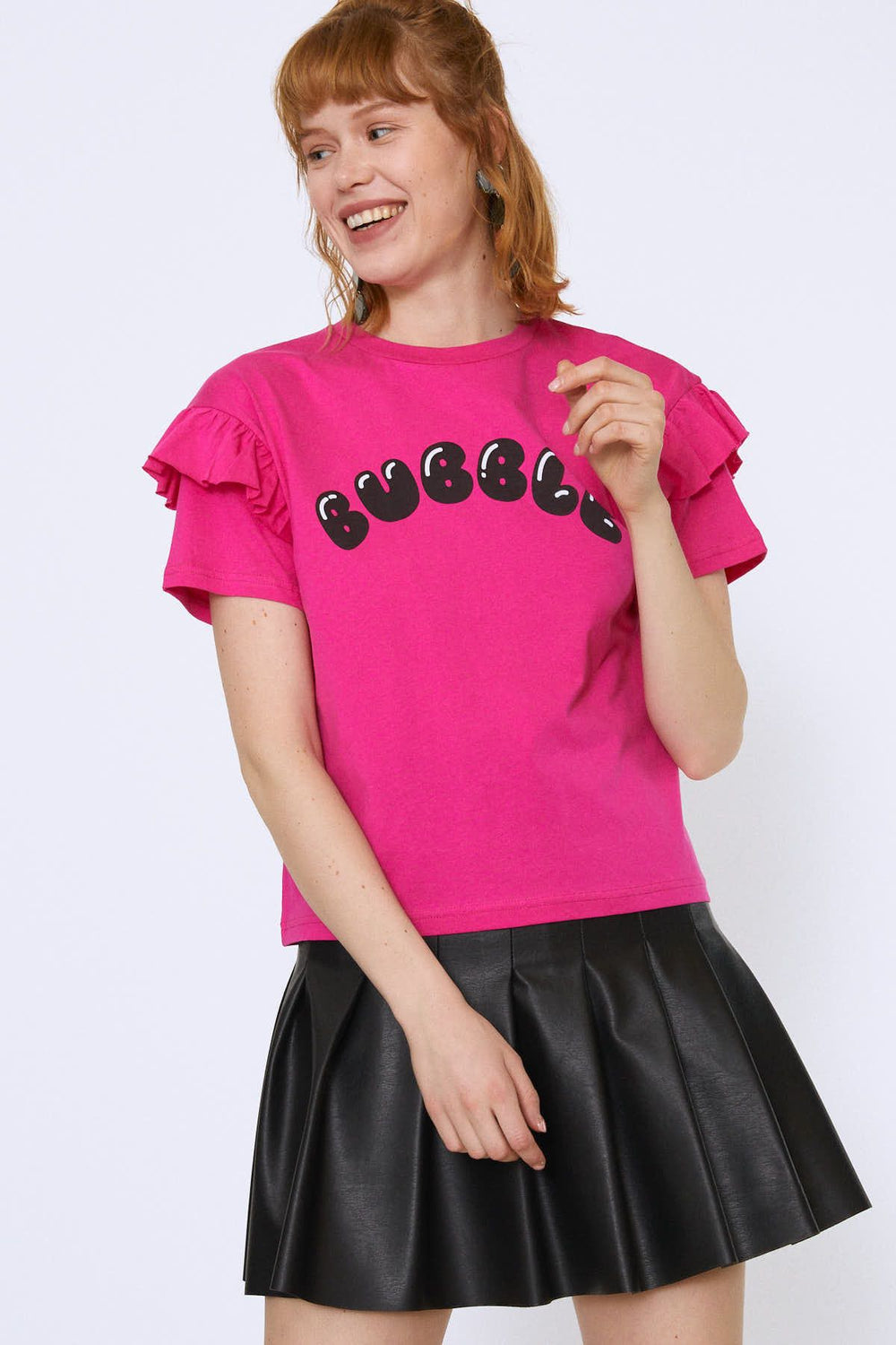 Kolları Fırfırlı Baskılı Tişört Fuşya