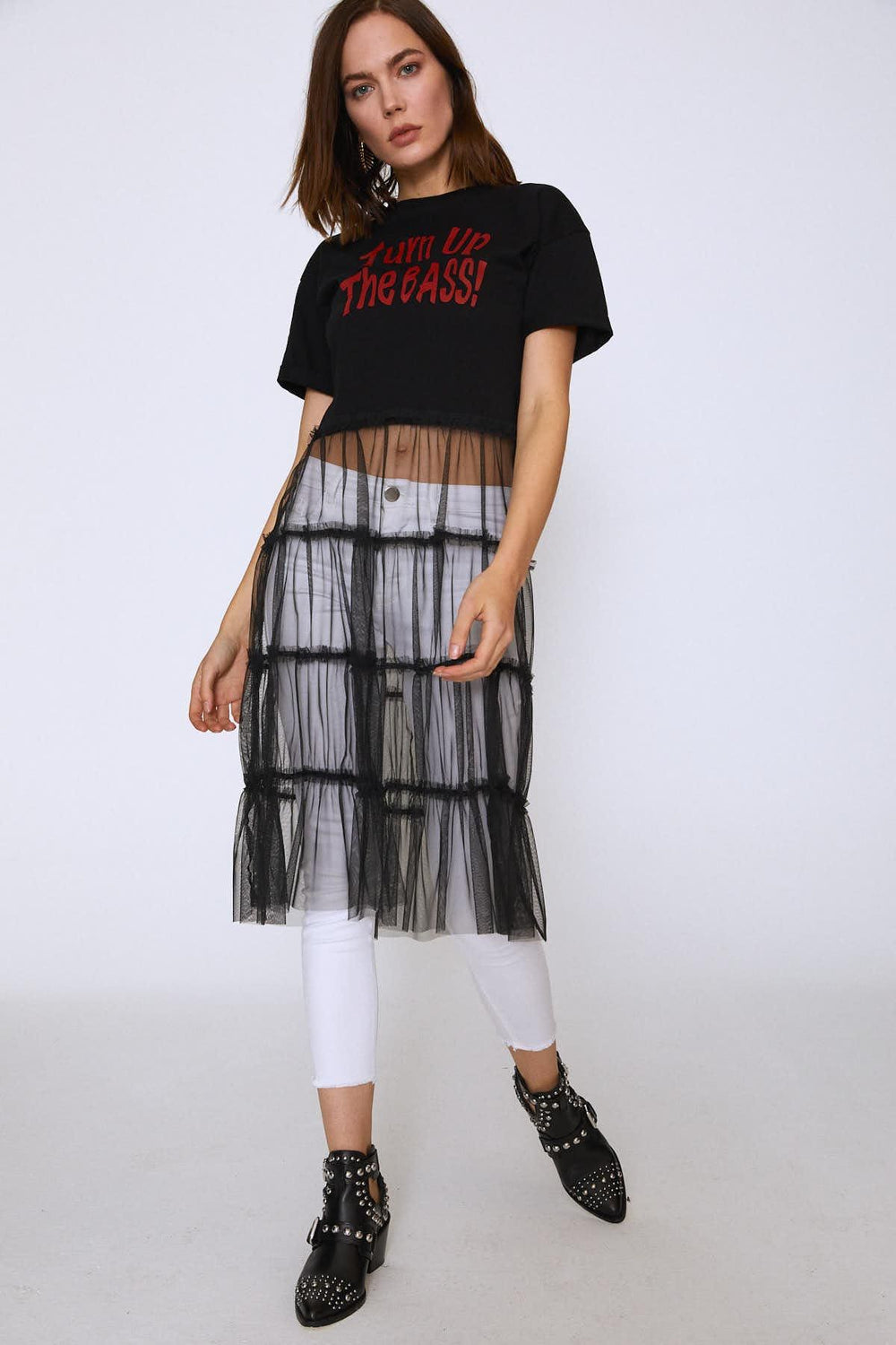Baskılı Tül Detaylı Tişört Siyah