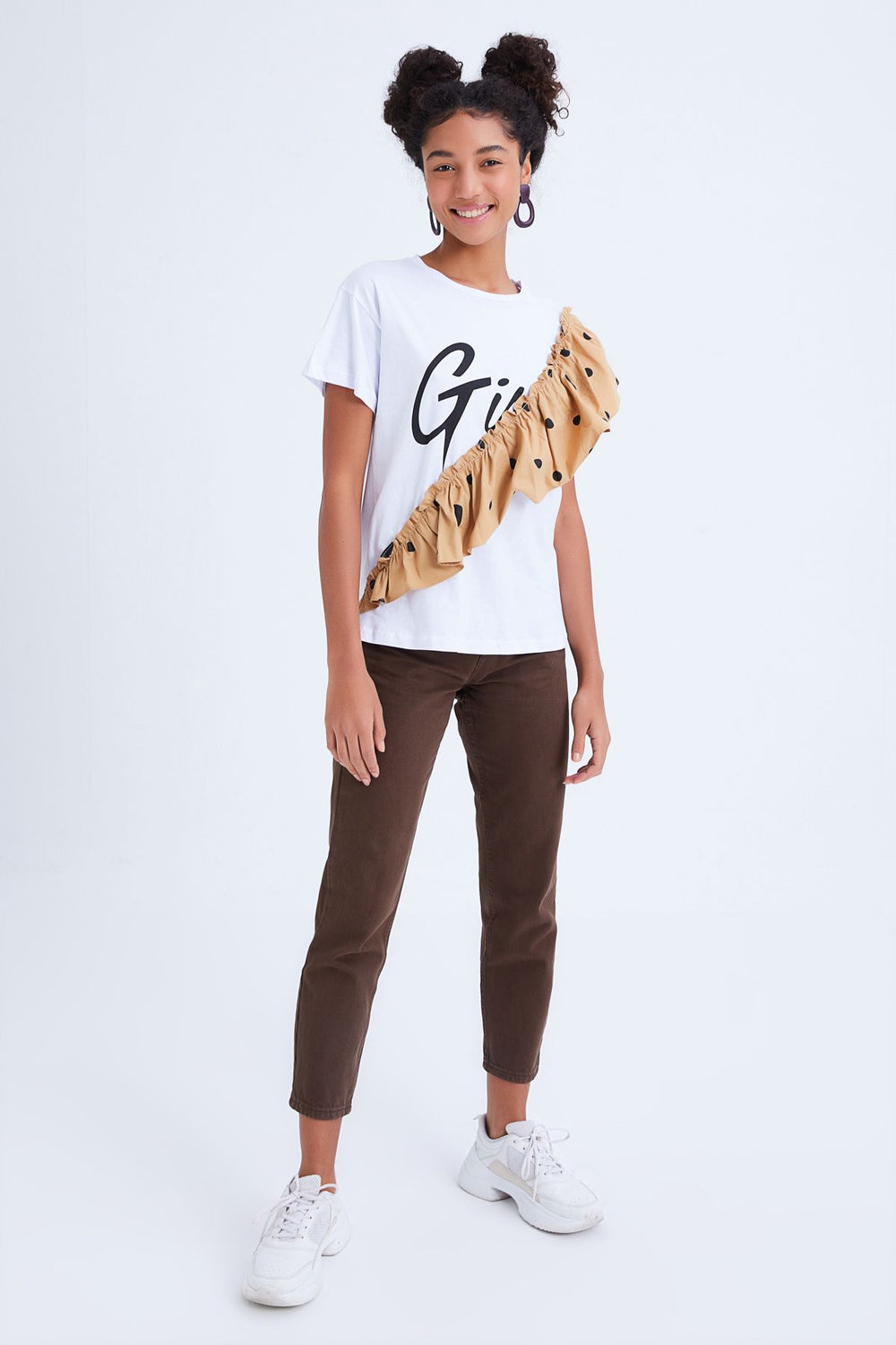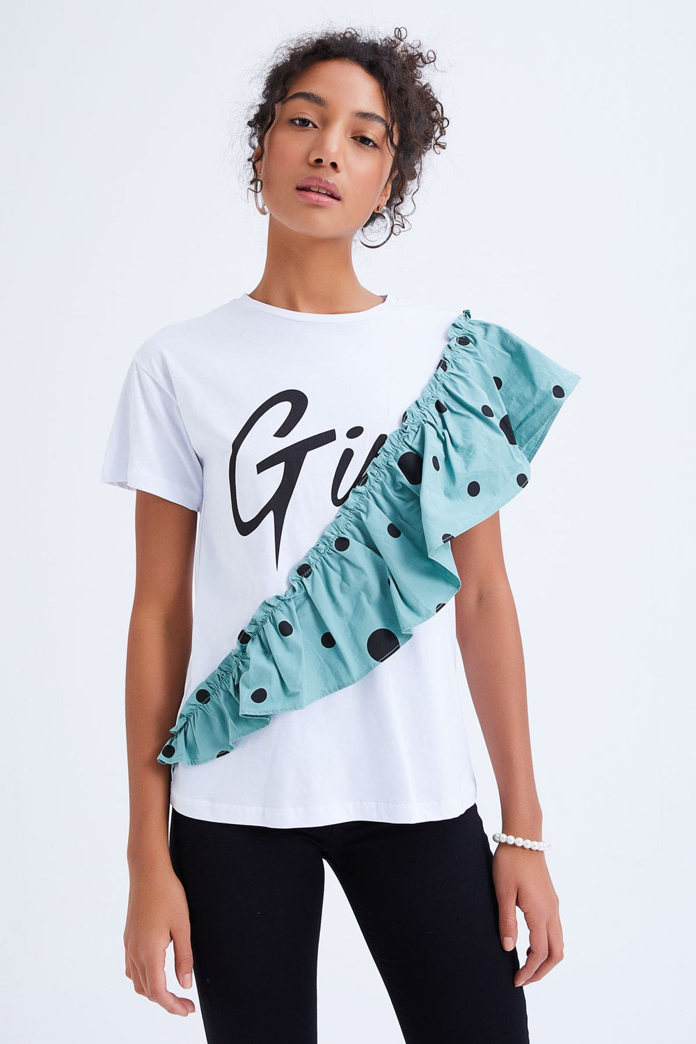 Önü Baskılı Kolları Fırfırlı Tişört Beyaz