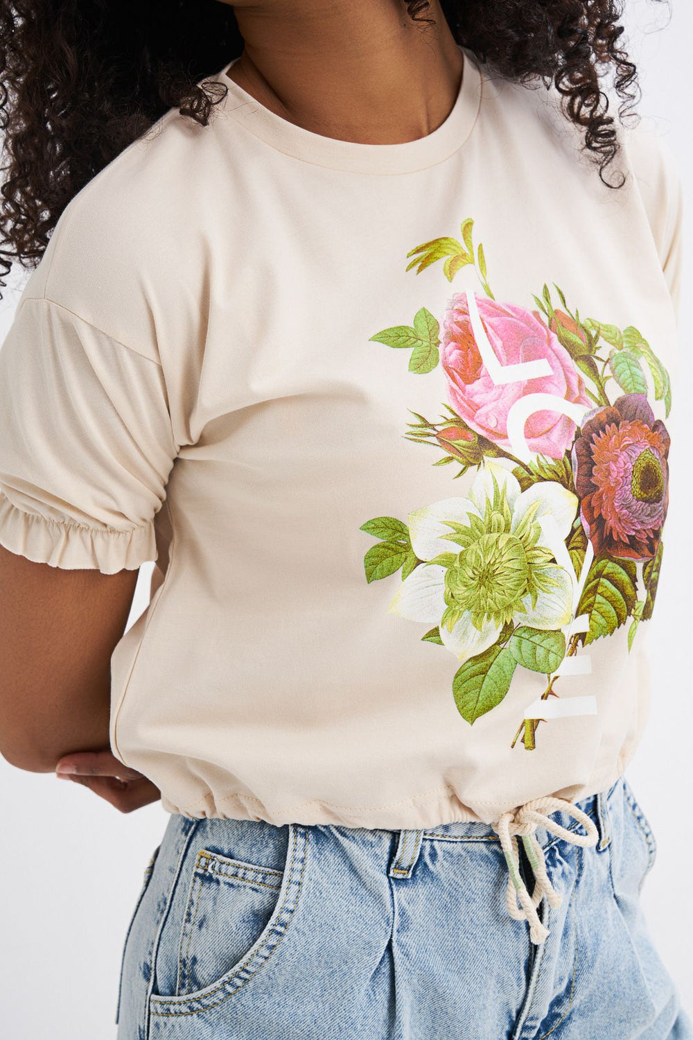 Önü Bağlamalı Kolları Fırfır Lastikli Tişört Açık Bej
