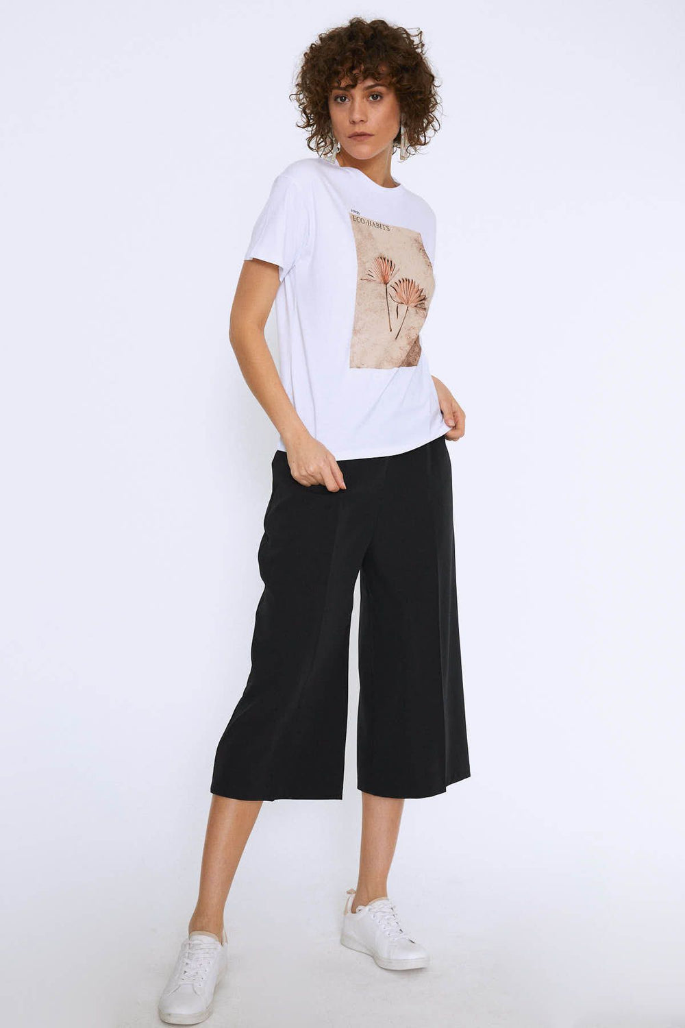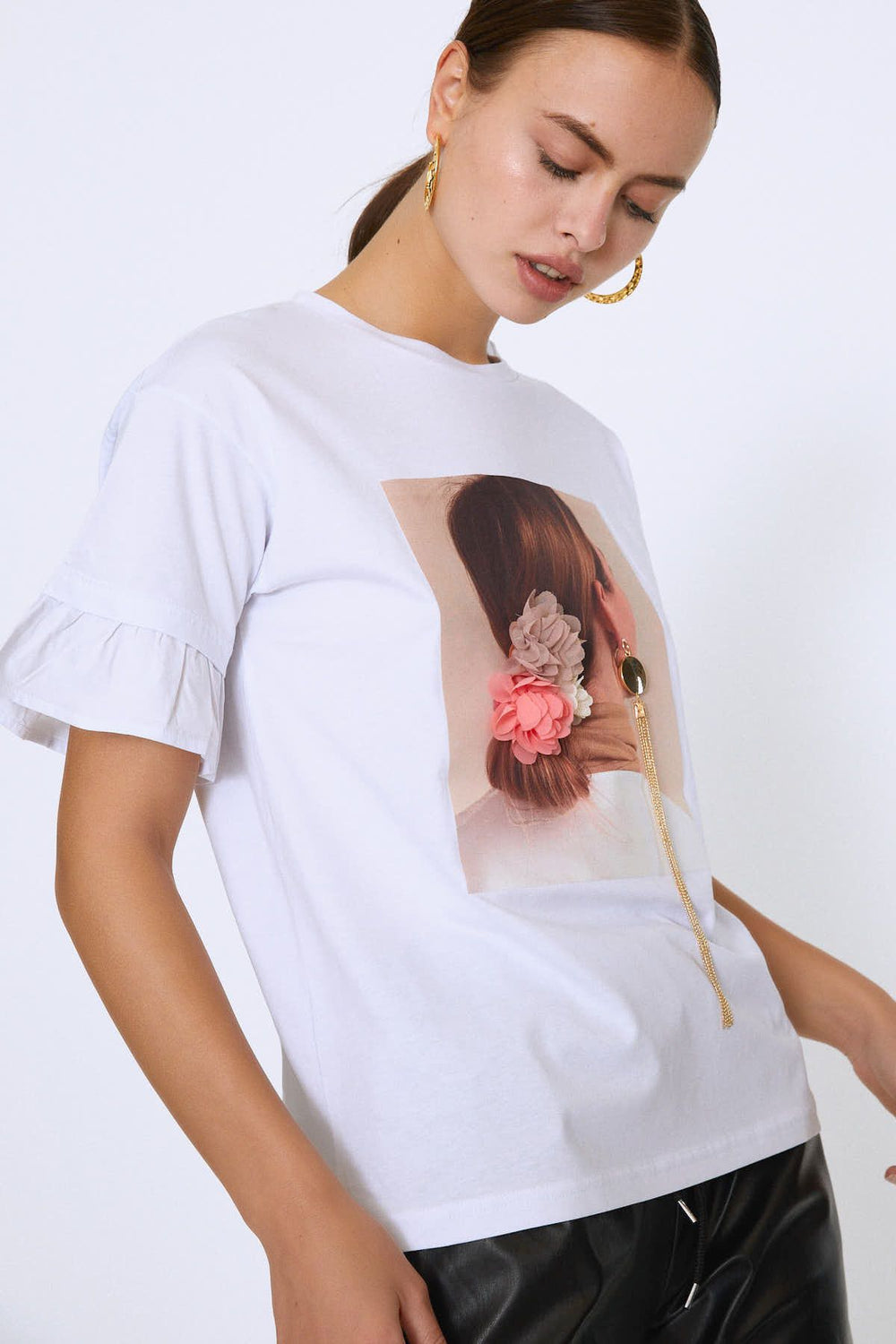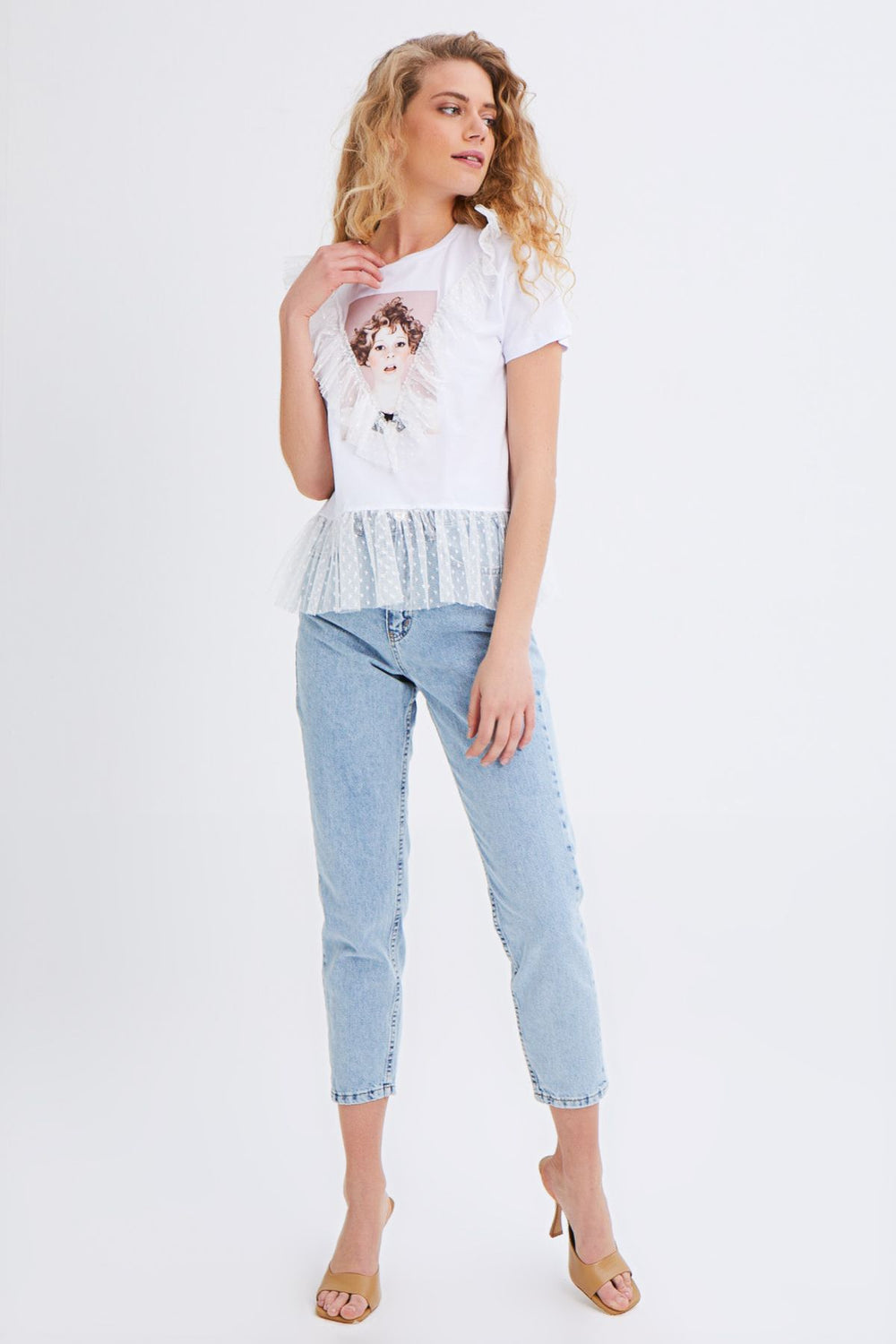 Kolları Fırfırlı Baskılı Tişört Beyaz