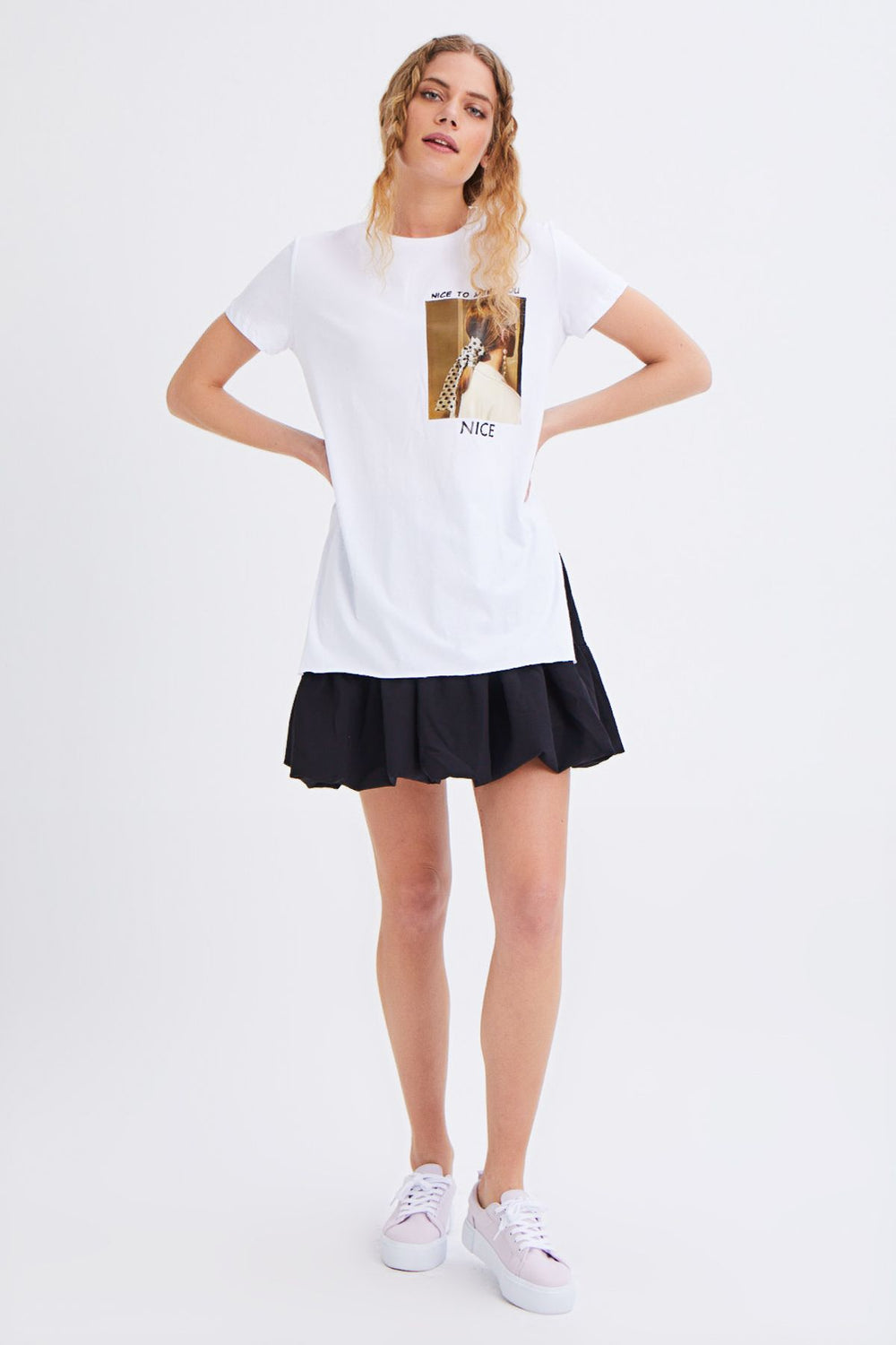 Yanı Yırtmaçlı Baskılı Tişört Beyaz