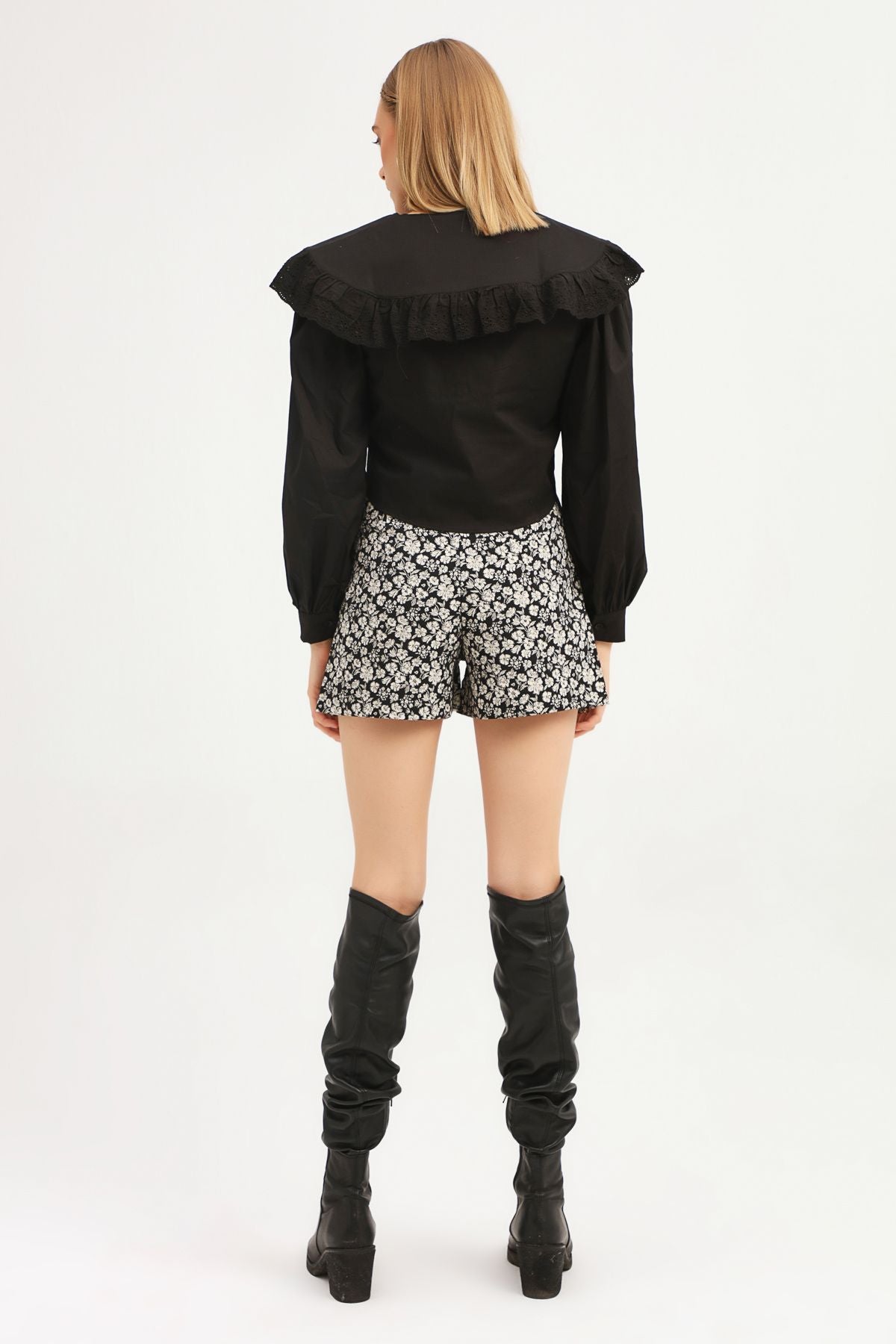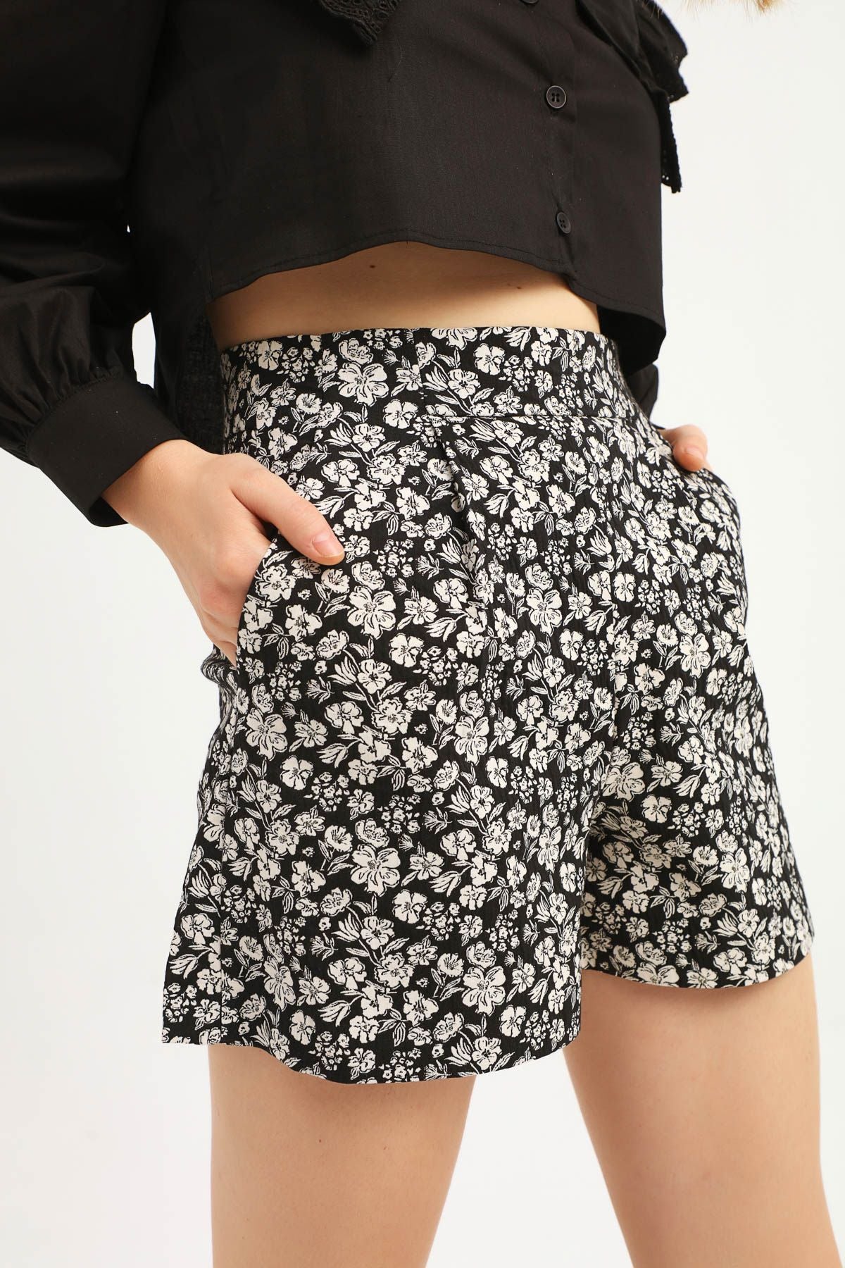 Çiçek Desenli Şort Siyah