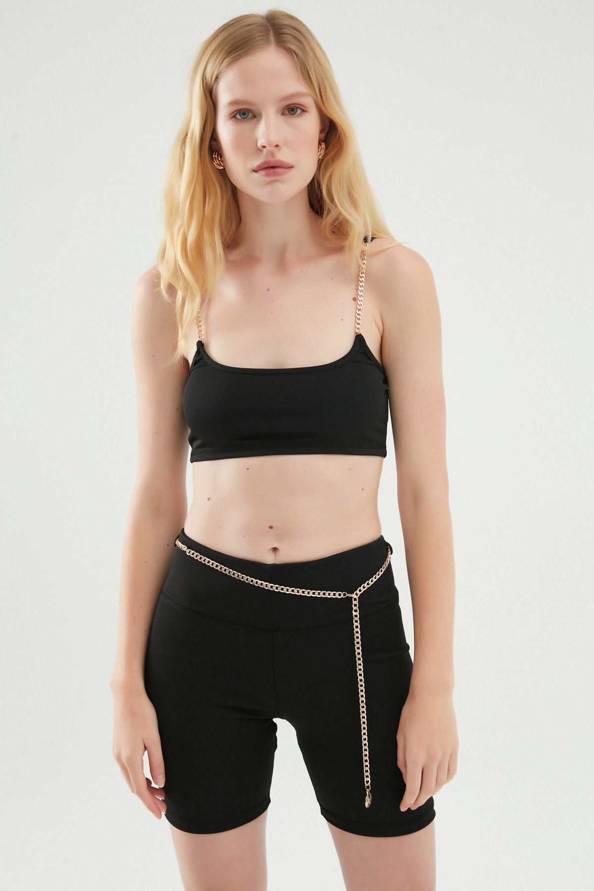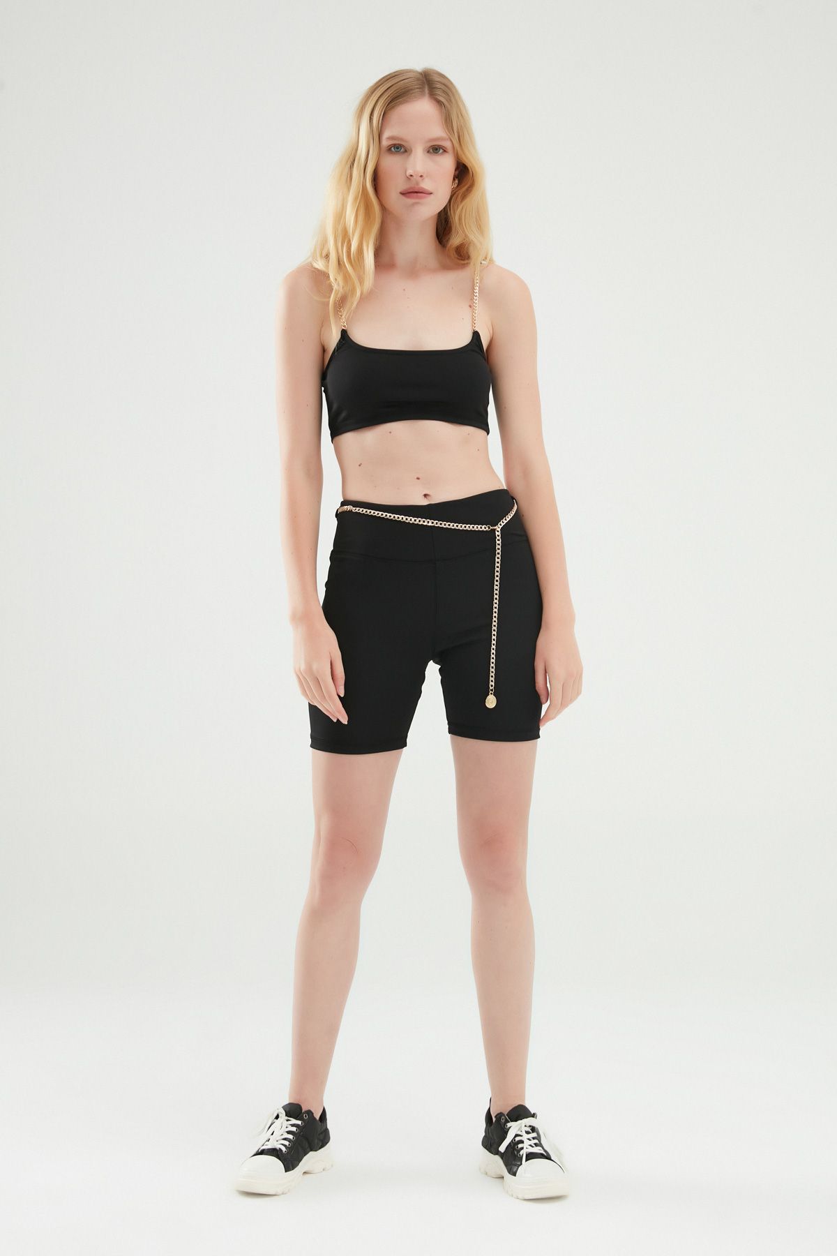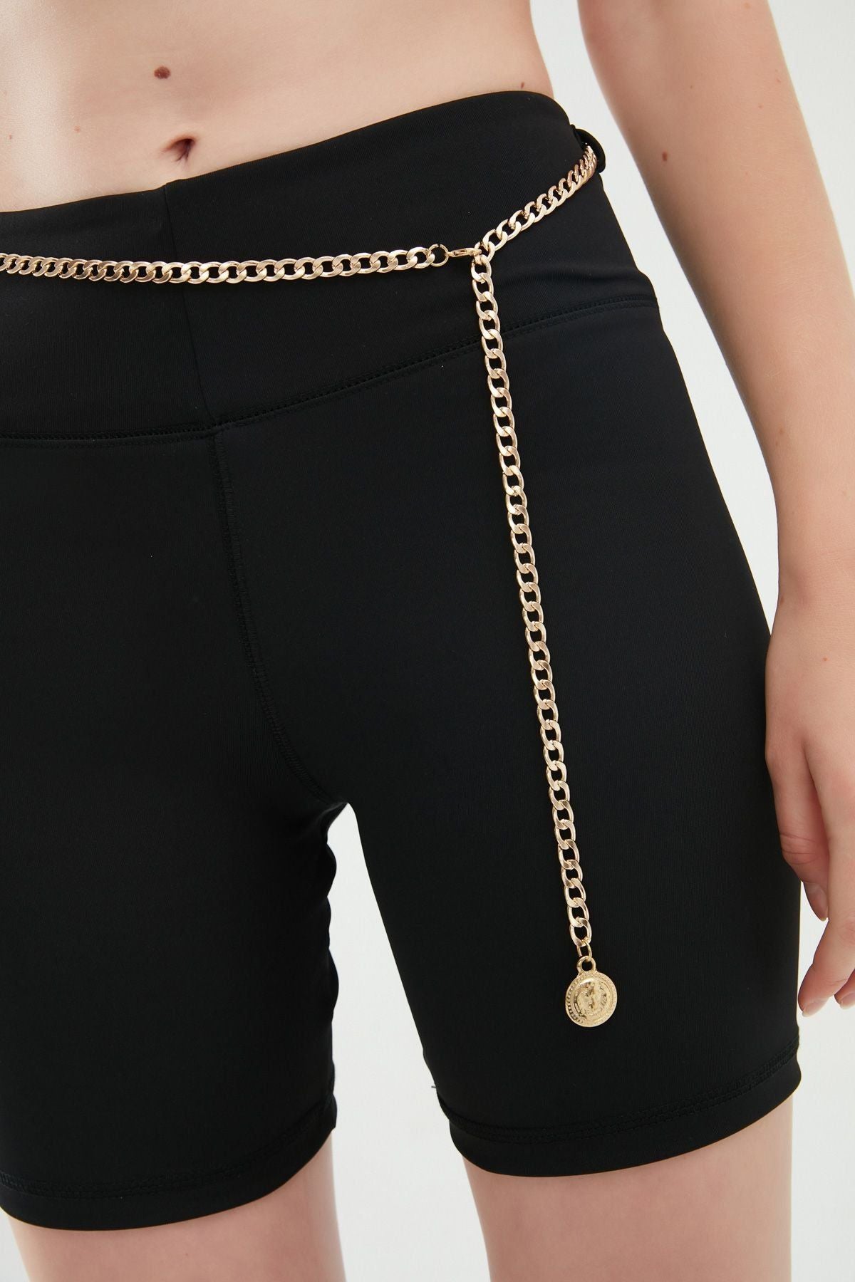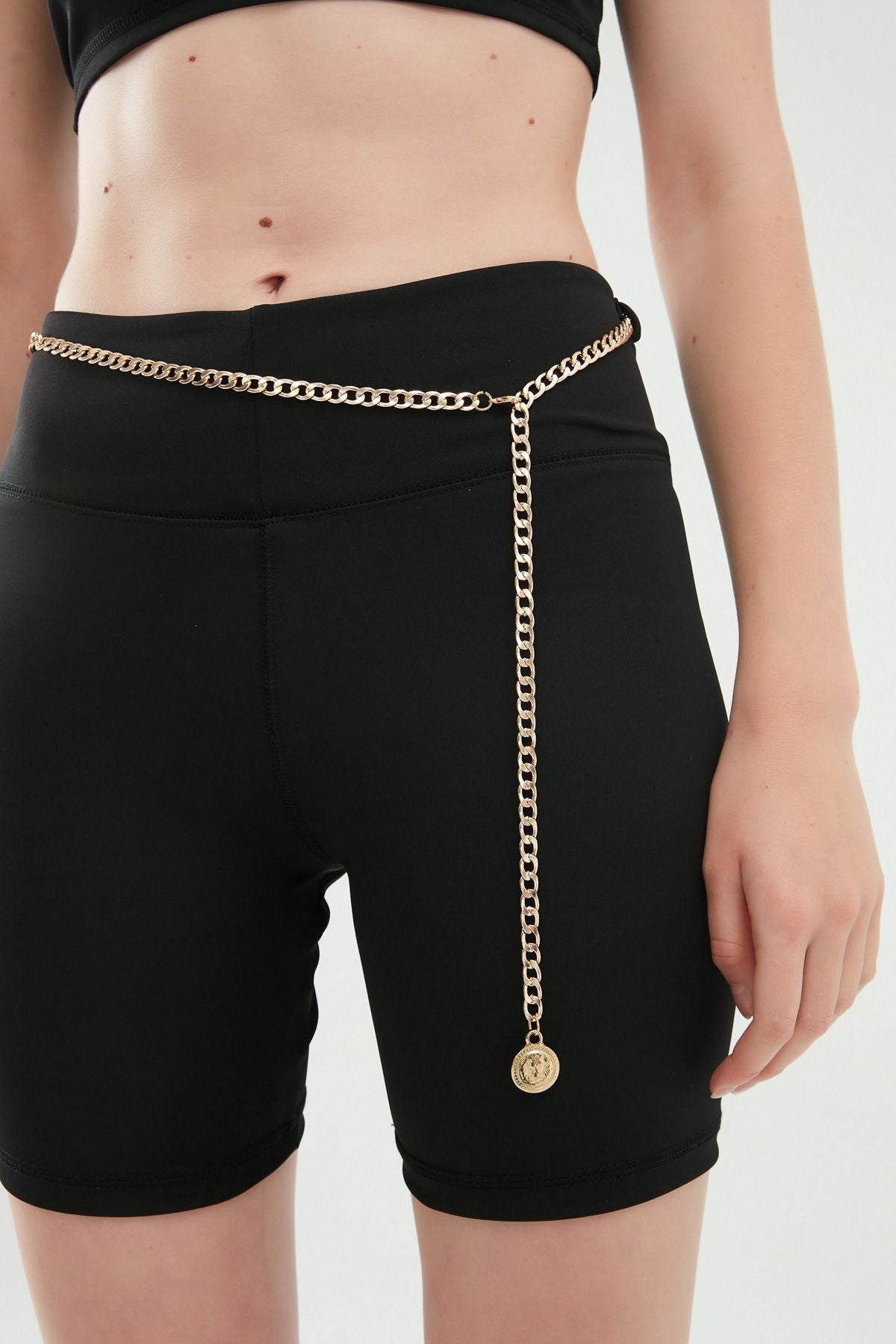 Bel kısmındaki zincir kemer aksesuarı ile biker tayta ayrı bir hava kattık! Hem zincir kemerle hem de zincir kemersiz kullanabileceğin yüksek bel biker tayt, vücudu saran skinny forma sahiptir.