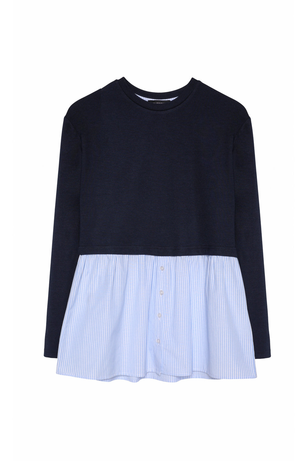 Alt kısmı gömlek detaylı, çizgili, bisiklet yaka, uzun kollu sweatshirt.