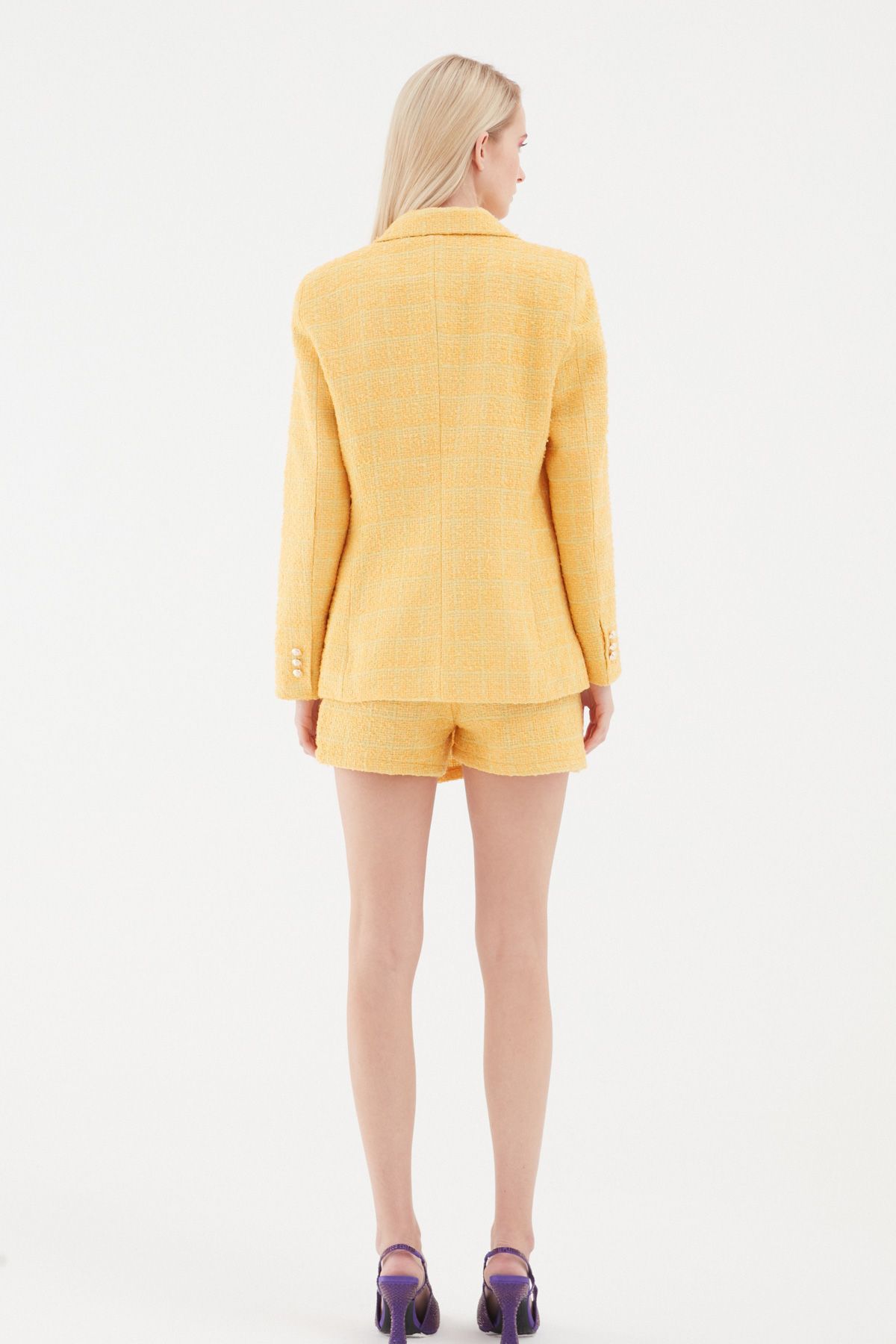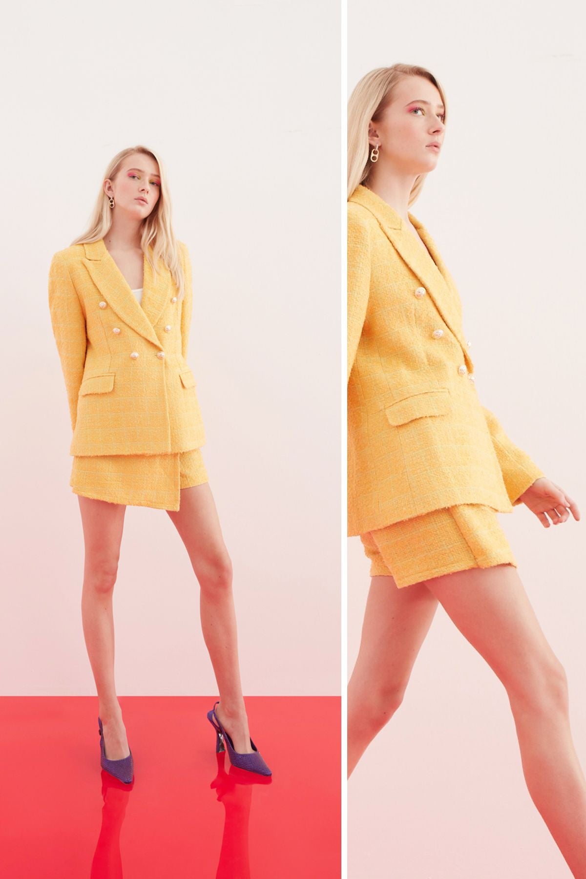 Elegan bir klasik olan blazer ve tüvit bir arada! Pamuk içerikli ve gold düğme detayları ile dikkat çeken tüvit blazer ceket modelini aynı renk ve dokuda etekler ile tamamlayarak etkileyici ve sofistike kombinler oluşturabilirsin. Etek modellerini etek koleksiyonumuzda görebilirsin. Çok yönlü olan cepli blazer ceket modeli her mevsim gardırobundaki anahtar parçalar arasında yerini alıyor.