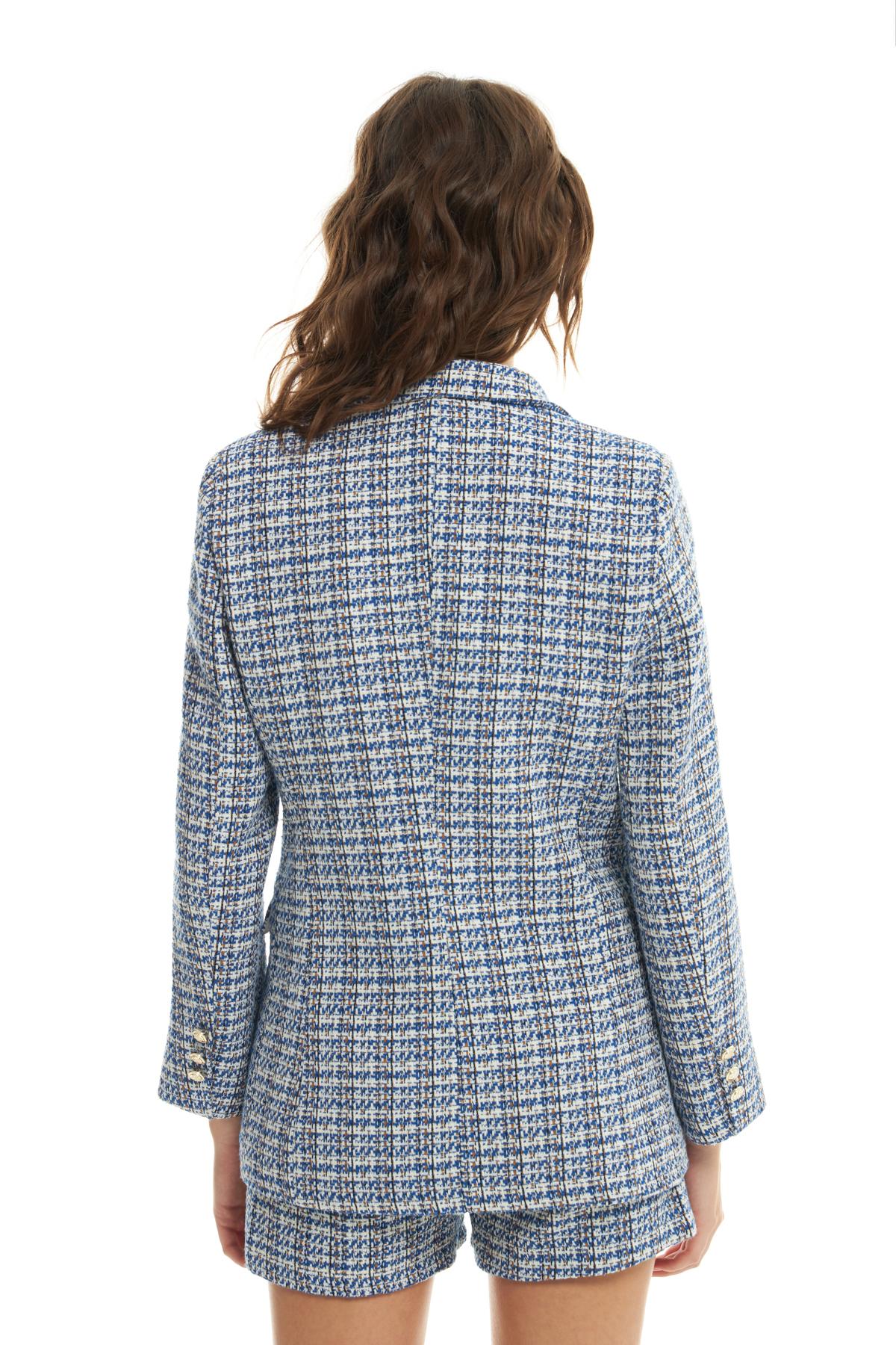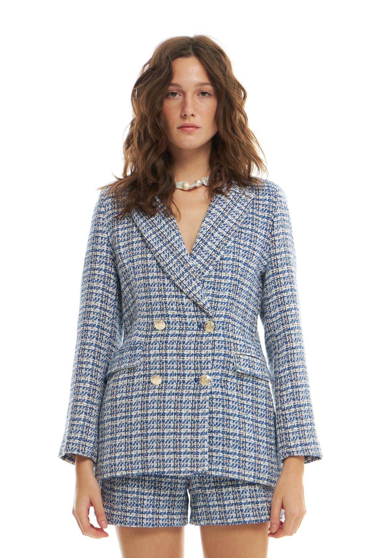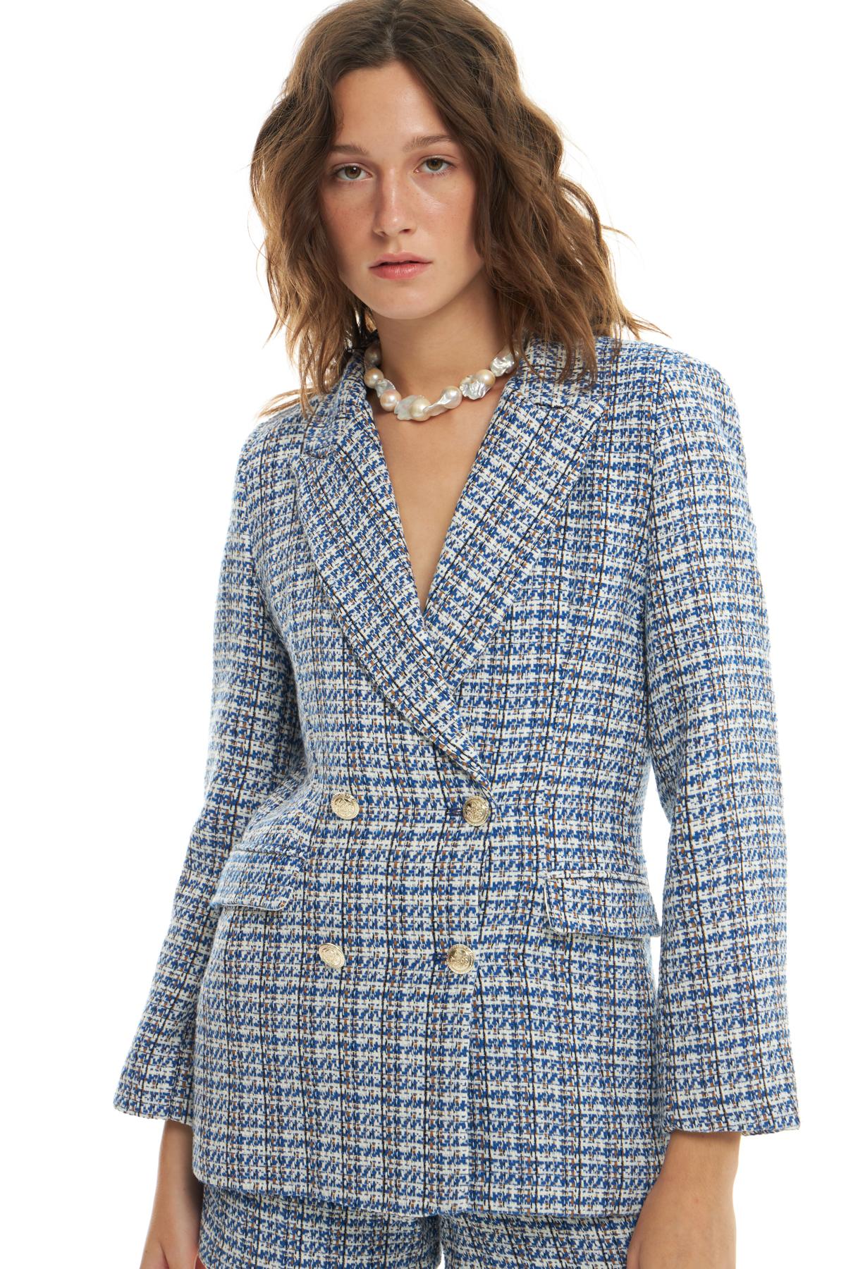 Kruvaze Yaka Düğme Detaylı Tüvit Blazer Ceket Sax