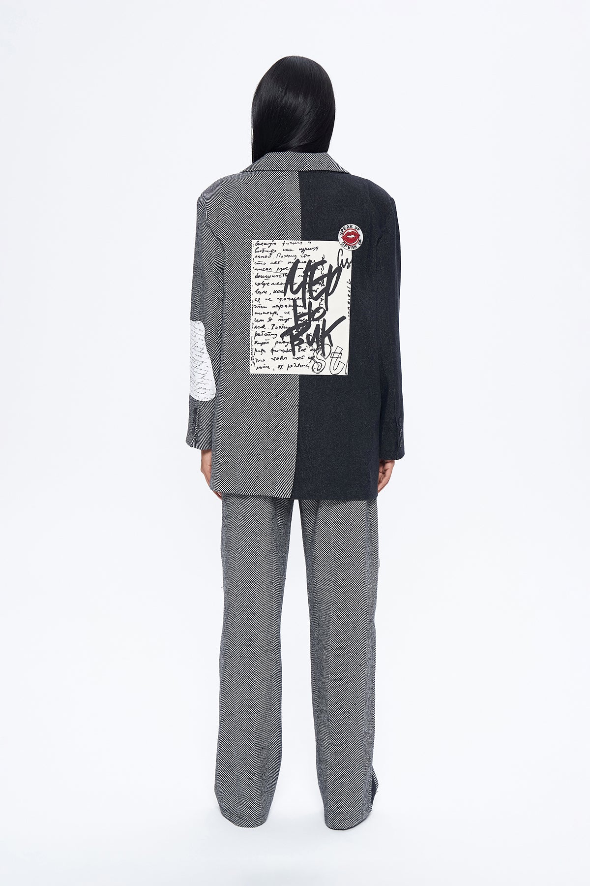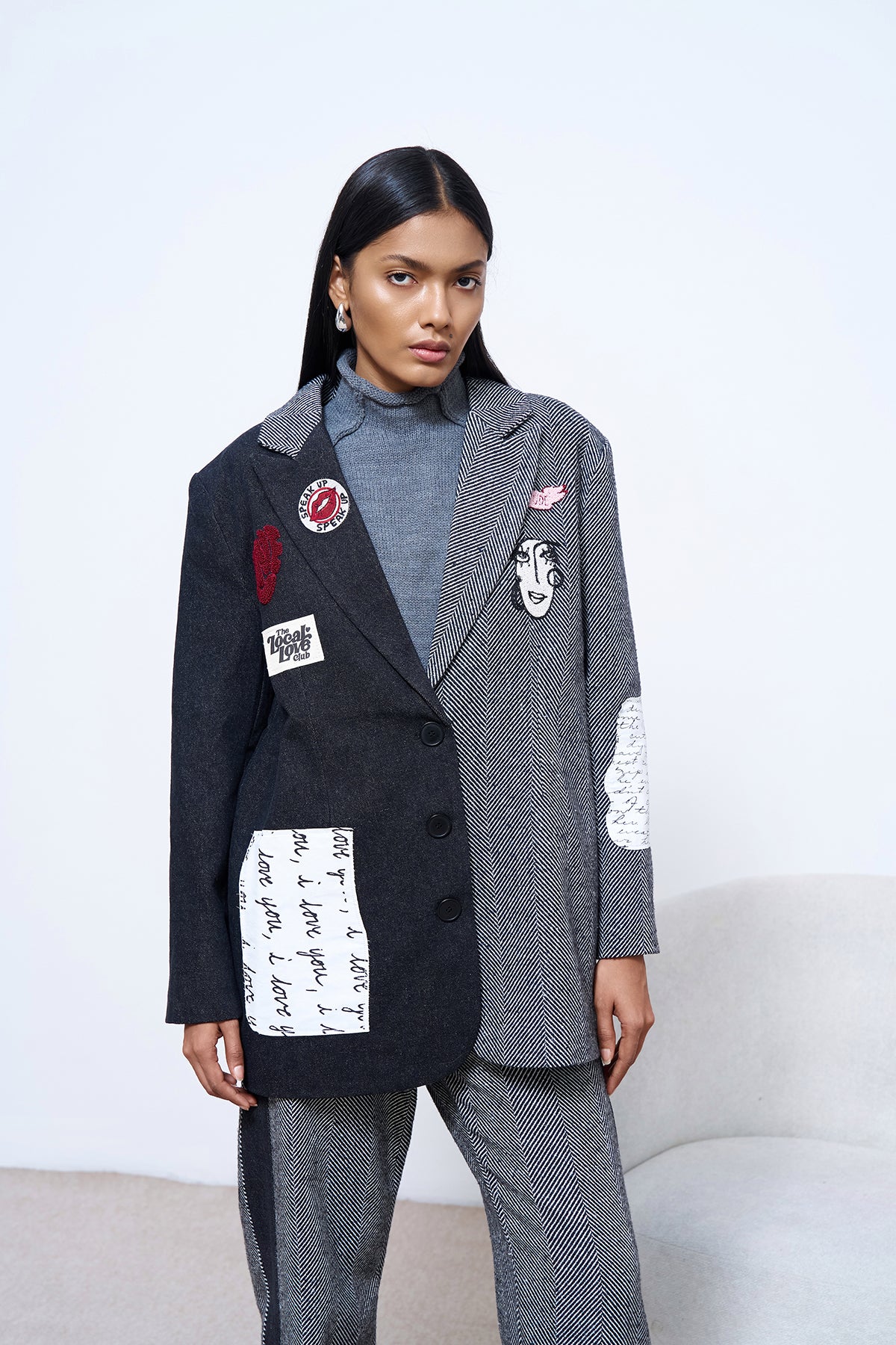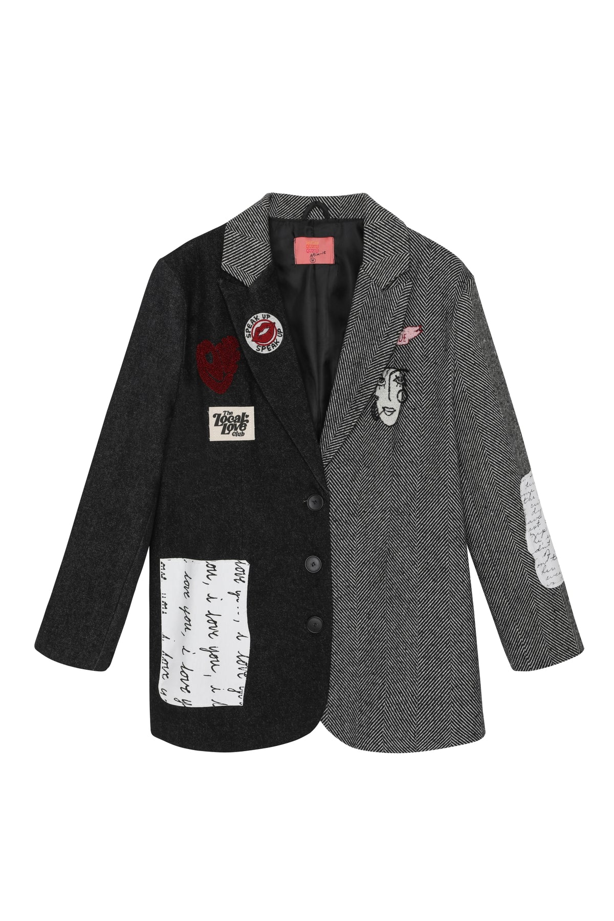 İçİ astarlı, çİft renklİ tasarımlı, nakış denİm matchlİ, düğme kapamalı, uzun kollu blazer ceket.
