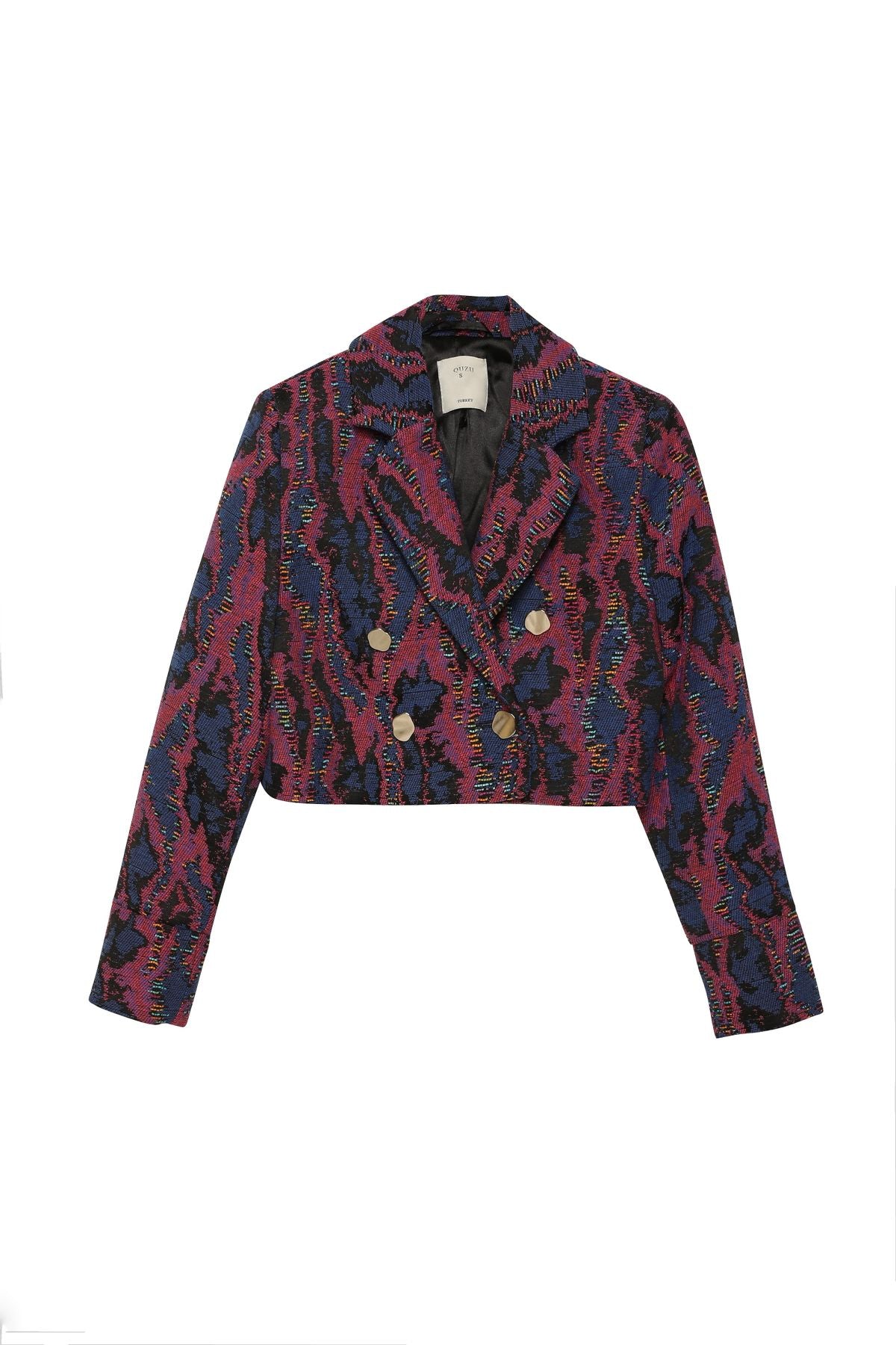 Kruvaze yaka, içi siyah renk astarlı, uzun kollu, çok renkli, yün ve pamuk içerikli, geometrik şekil gold düğme detaylı, vatkalı, crop blazer ceket.