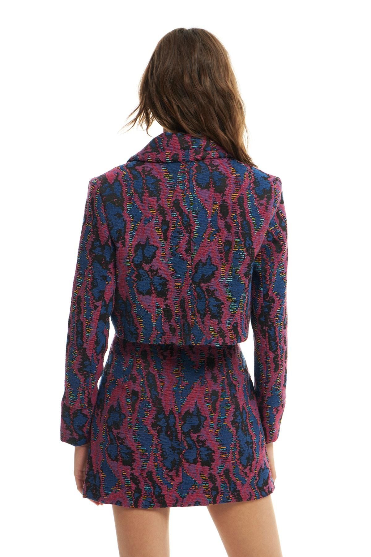 Renkli Desenli Crop Ceket Fuşya