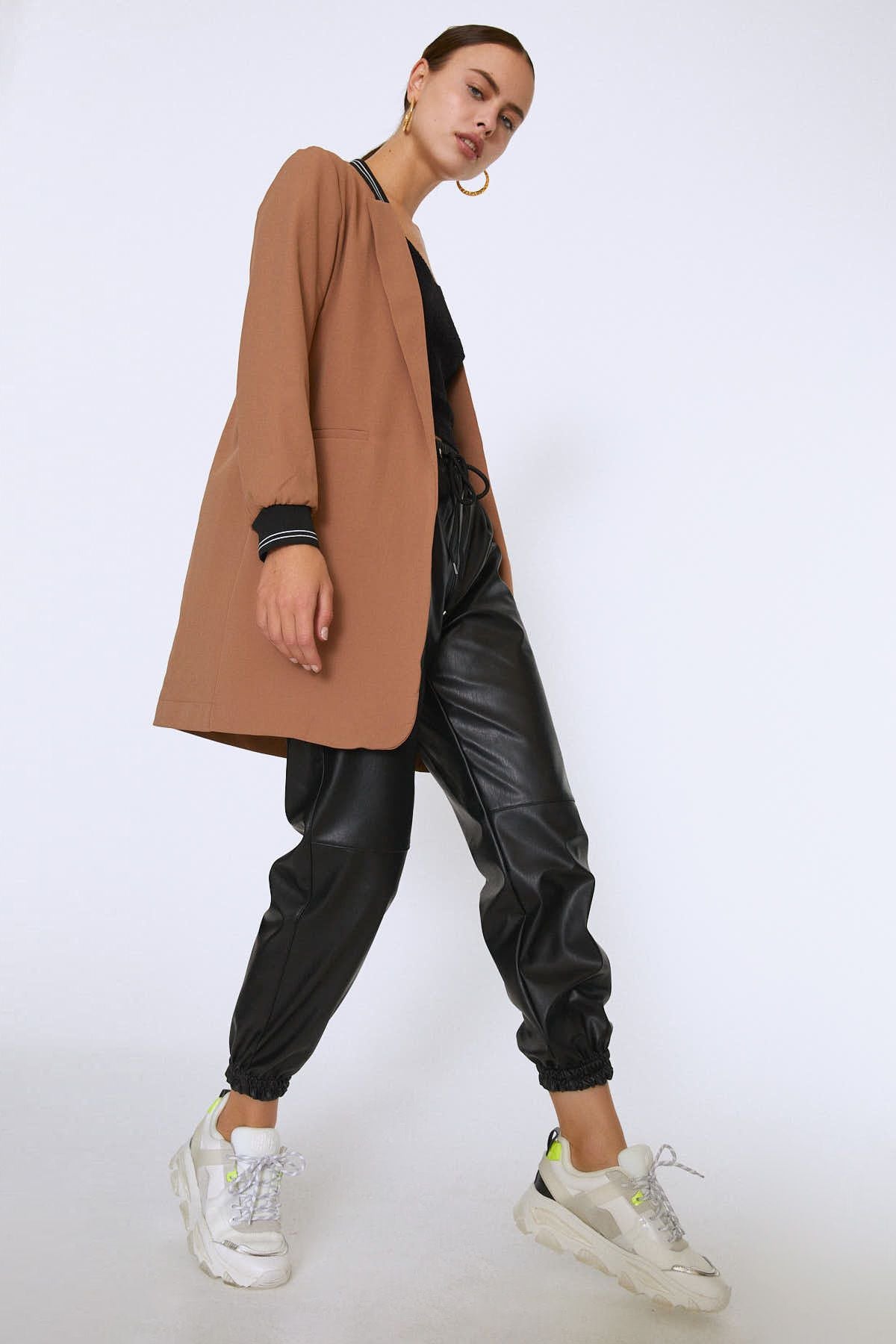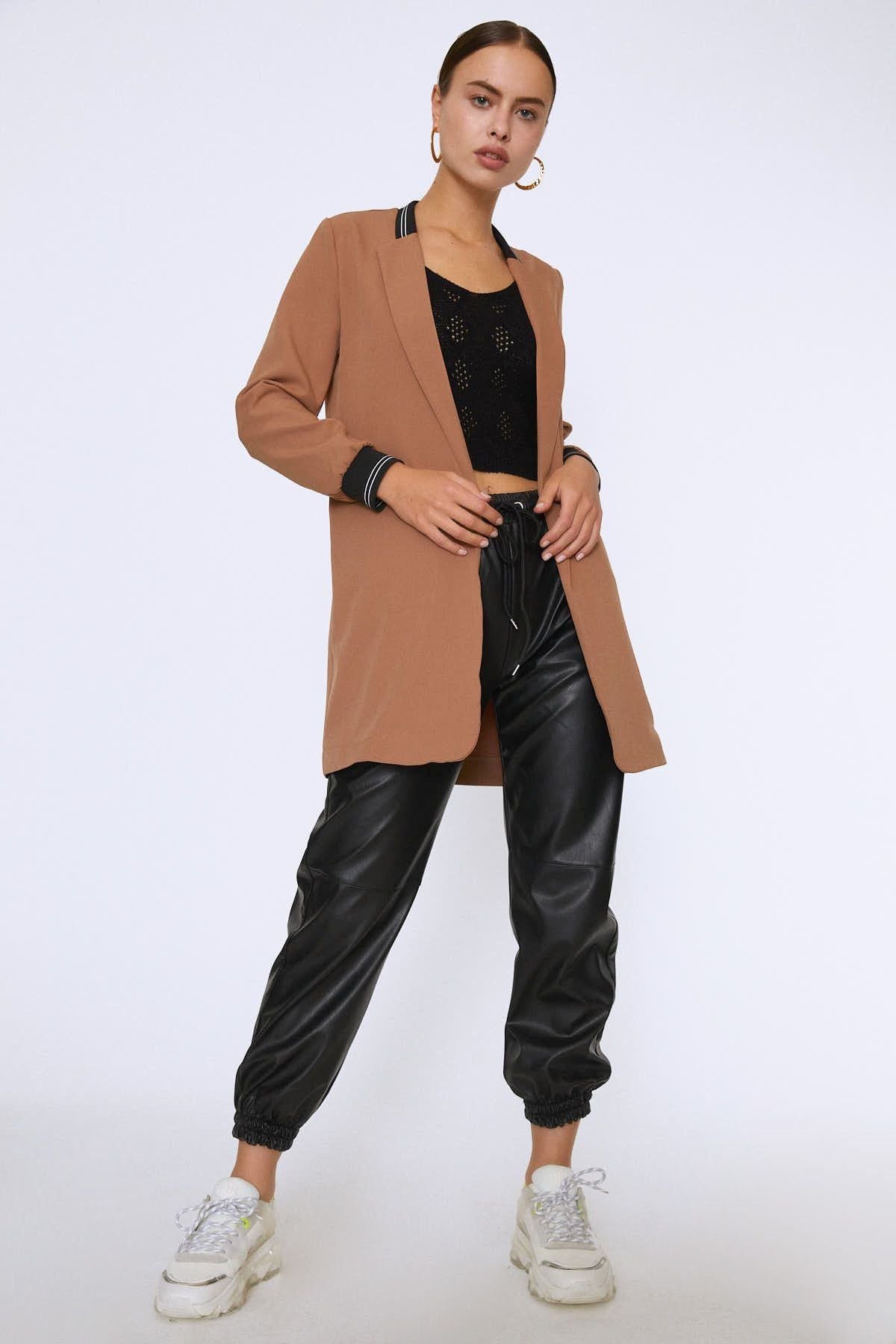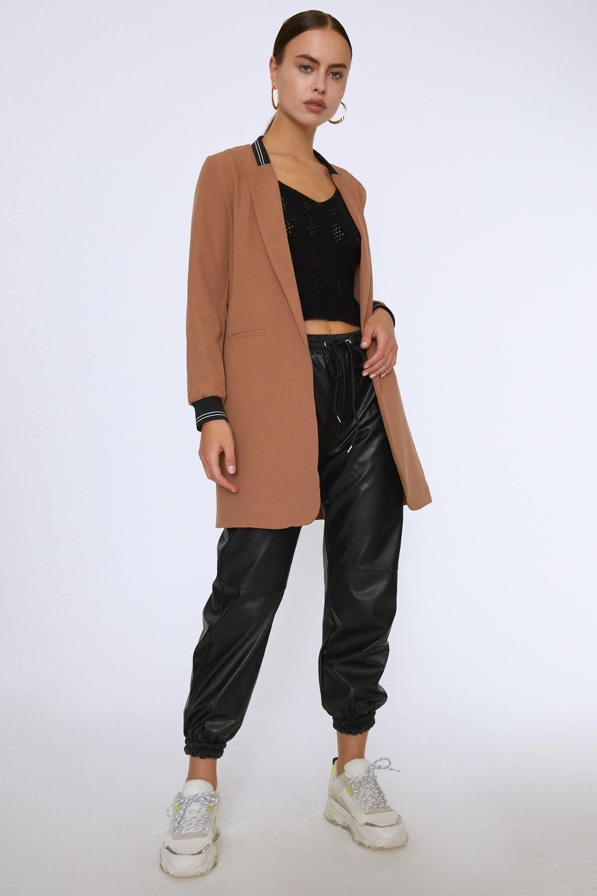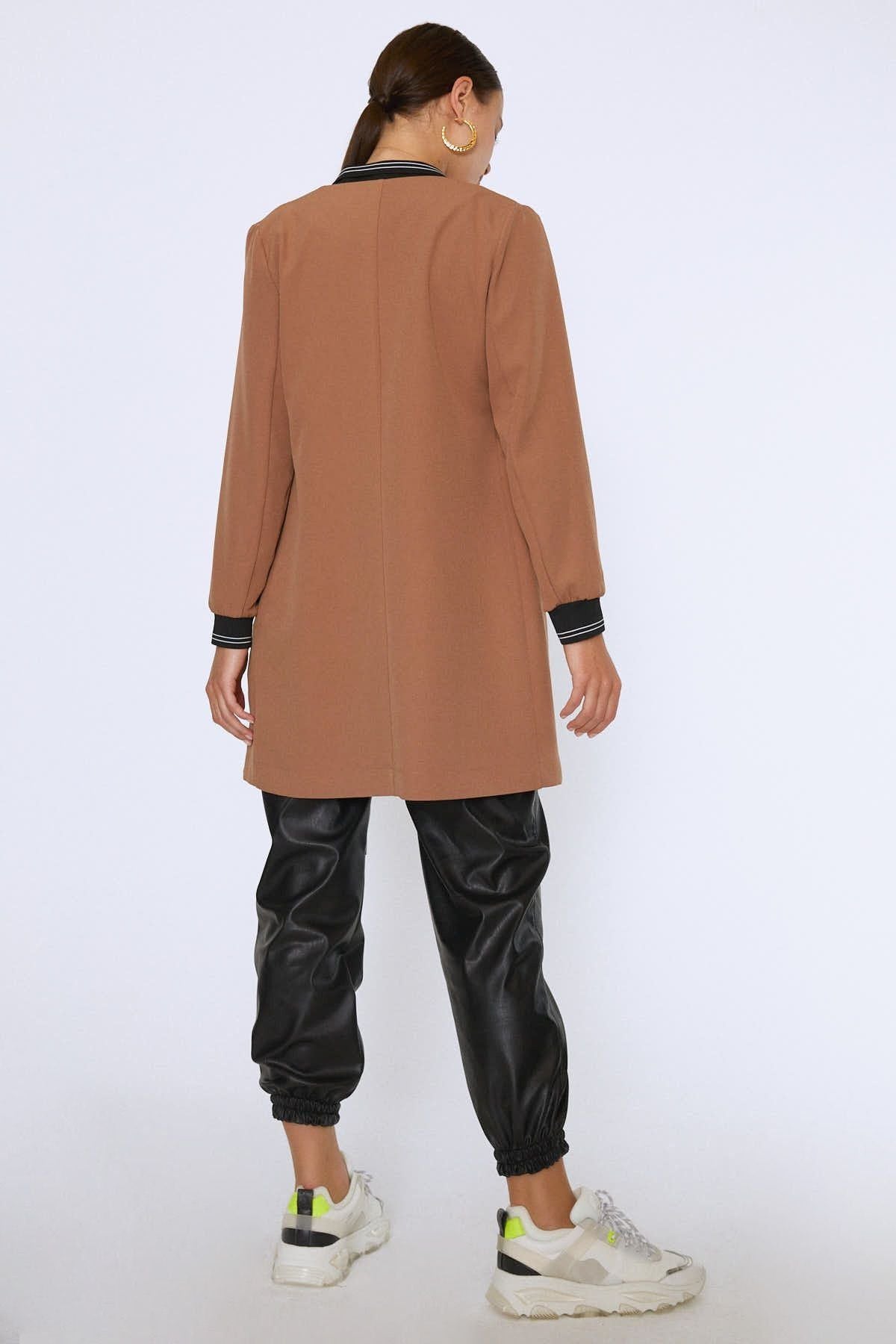 Ribanalı Fleto Cepli Uzun Ceket Camel