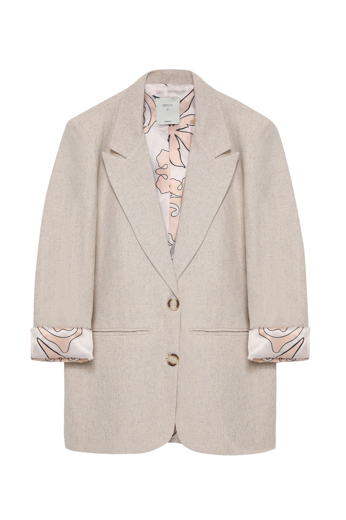 Keten karışımlı, içi desenli astarlı, önden gizli cepli, çift düğmeli, blazer ceket.