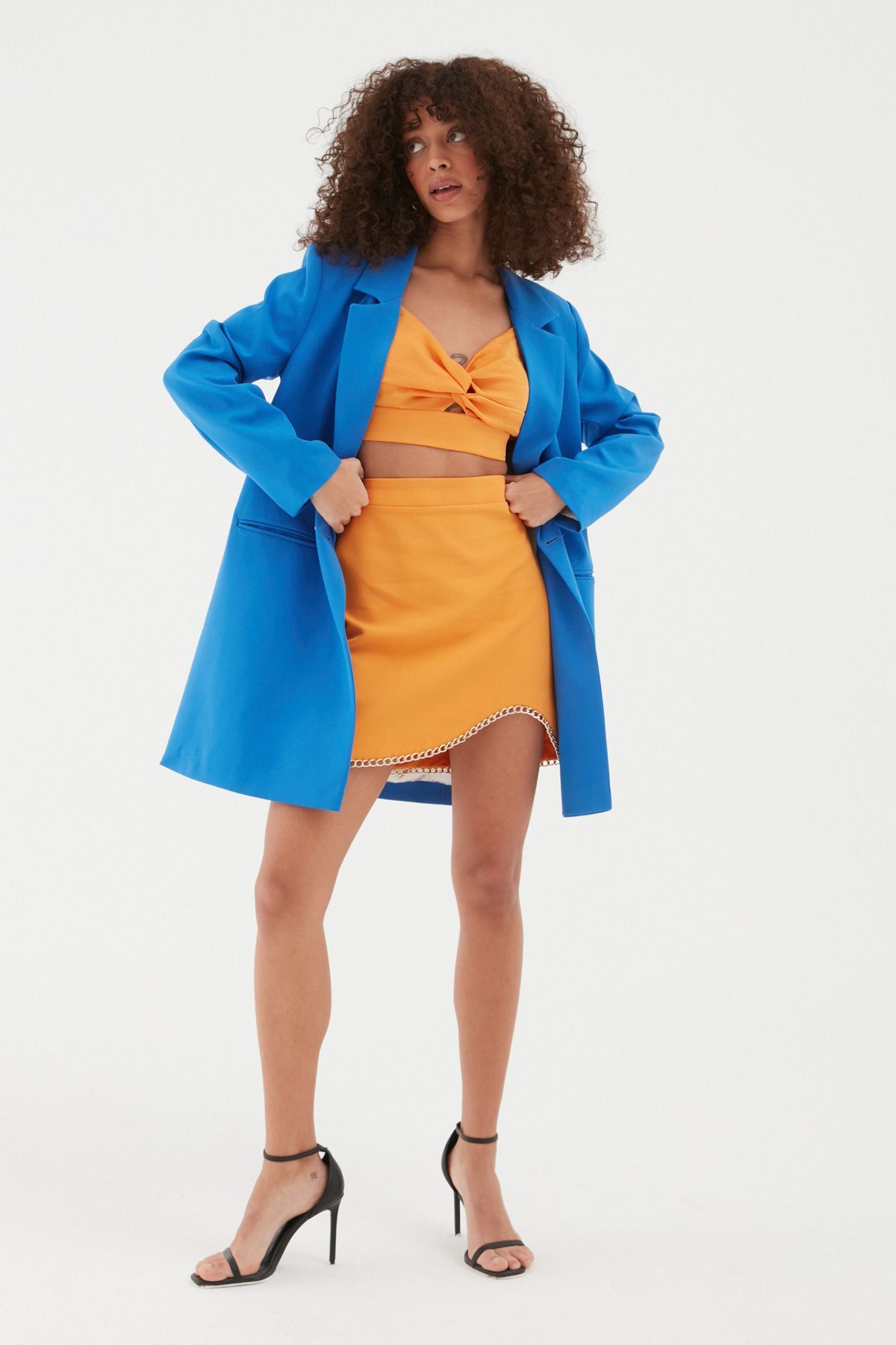 Ofis stli için kurtarıcı parça haline gelen blazer ceket modelleri güncellenerek uzun boy ve yanlarına yırtmaç tasarım dahil oldu! Dolabımızın anahtar parçası blazer ceket modeli geometrik gold düğmeleri ile daha çok dikkat çekiyor. Uzun blazer ceket modelini kemer ve stiletto ya da uzun çizme ile tamamlayarak zarif ve çarpıcı bir görünüm elde edebilirsin. Uzun ve yanlarının yırtmaç detayı farklı bir tasarım sunan blazer ceket modeli geleneksel blazer ceket modelinden uzaklaşıp kombinlerinde casual-smart görünüm sunuyor. Etek ya da yırtmaçlı pantolon ile kombinleyerek şıklığını zirveye taşıyabilirsin.
