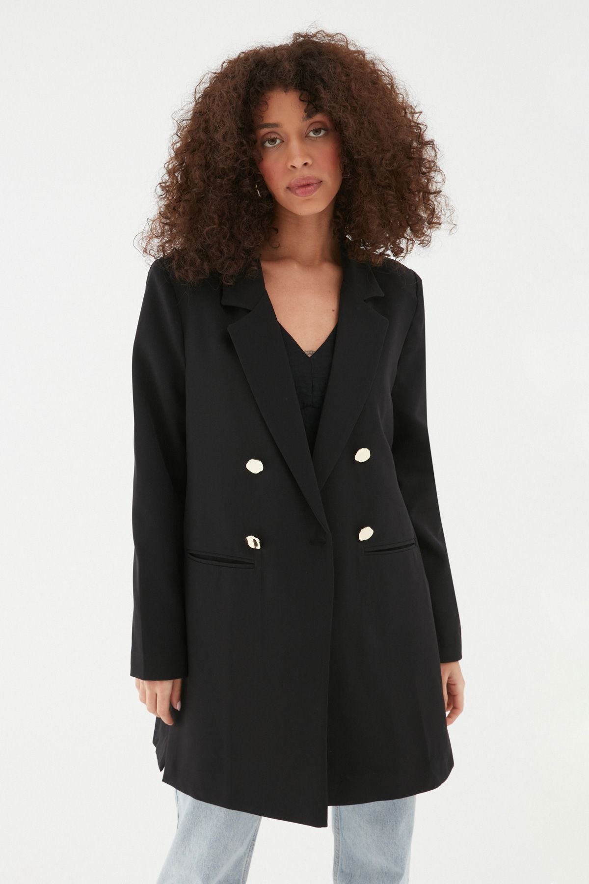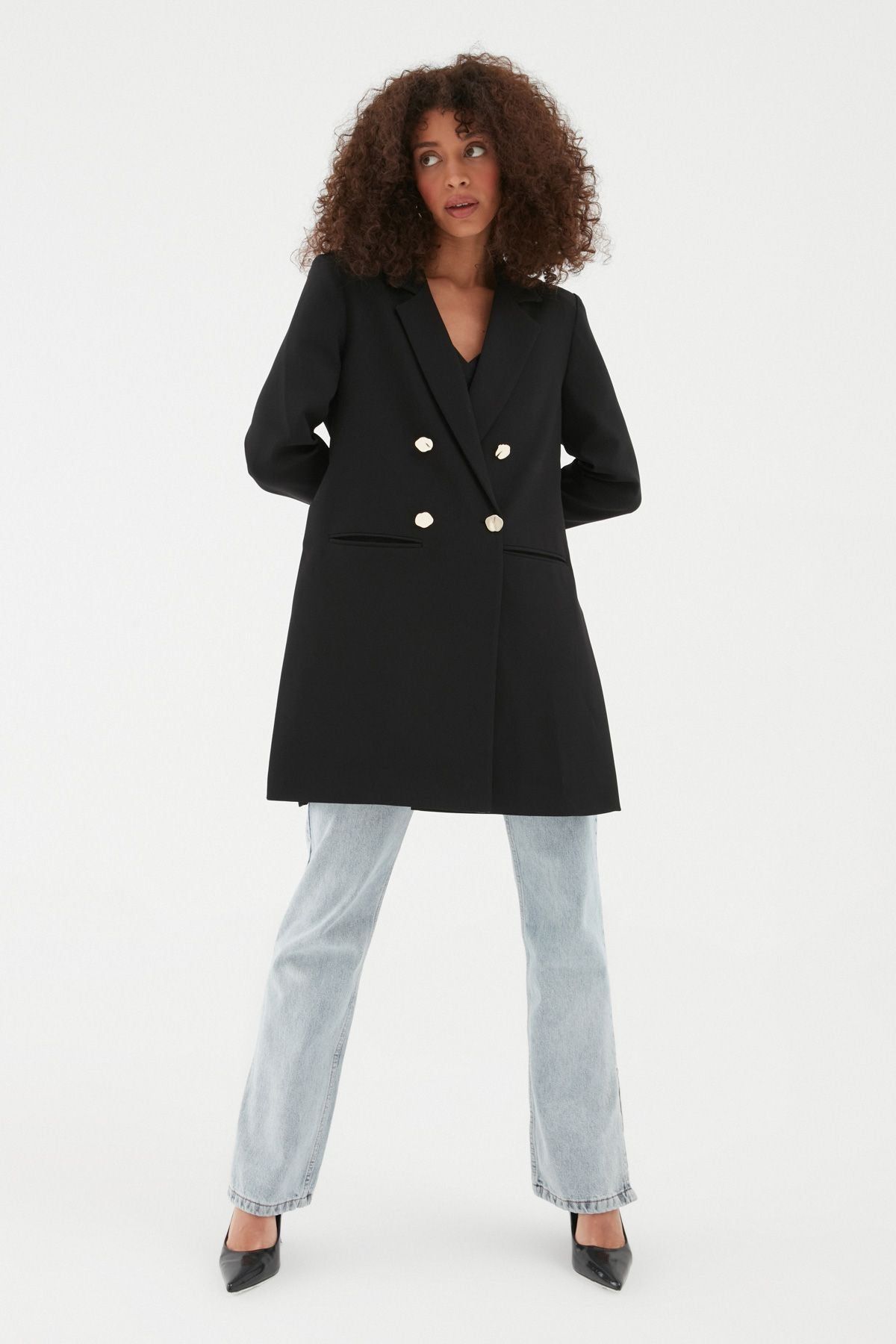 Ofis stli için kurtarıcı parça haline gelen blazer ceket modelleri güncellenerek uzun boy ve yanlarına yırtmaç tasarım dahil oldu! Dolabımızın anahtar parçası blazer ceket modeli geometrik gold düğmeleri ile daha çok dikkat çekiyor. Uzun blazer ceket modelini kemer ve stiletto ya da uzun çizme ile tamamlayarak zarif ve çarpıcı bir görünüm elde edebilirsin. Uzun ve yanlarının yırtmaç detayı farklı bir tasarım sunan blazer ceket modeli geleneksel blazer ceket modelinden uzaklaşıp kombinlerinde casual-smart görünüm sunuyor. Etek ya da yırtmaçlı pantolon ile kombinleyerek şıklığını zirveye taşıyabilirsin.