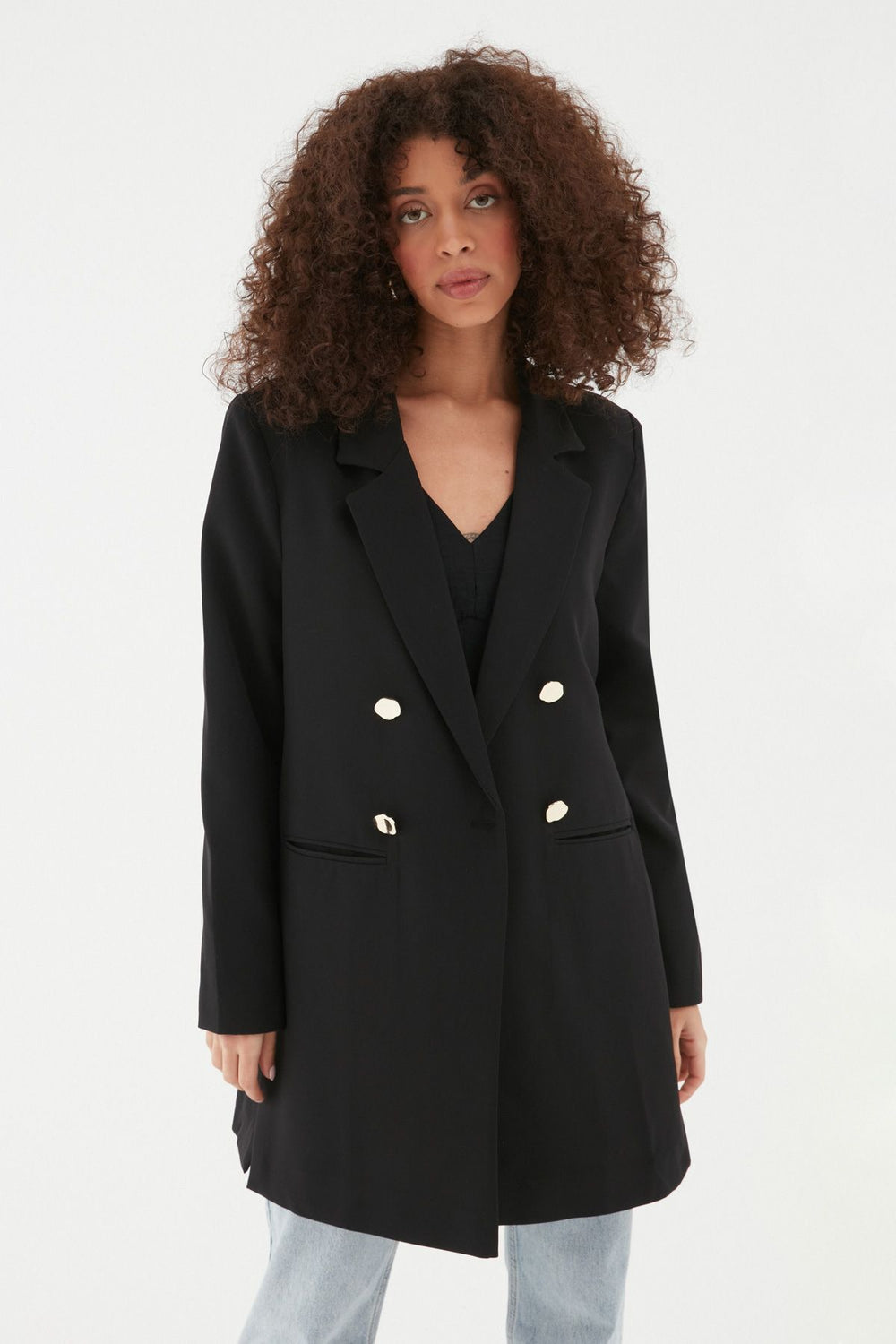 Kruvaze Yaka Düğme Detaylı Tüvit Blazer Ceket Siyah