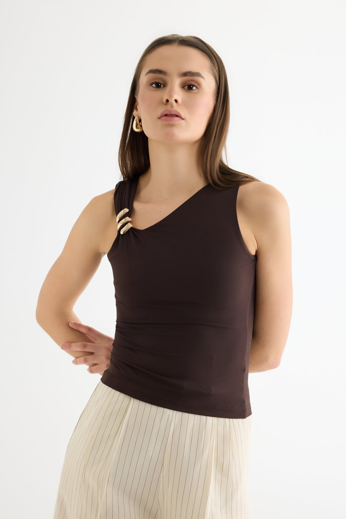 Asimetrik Yaka Metal Aksesuarlı Bluz Kahverengi
