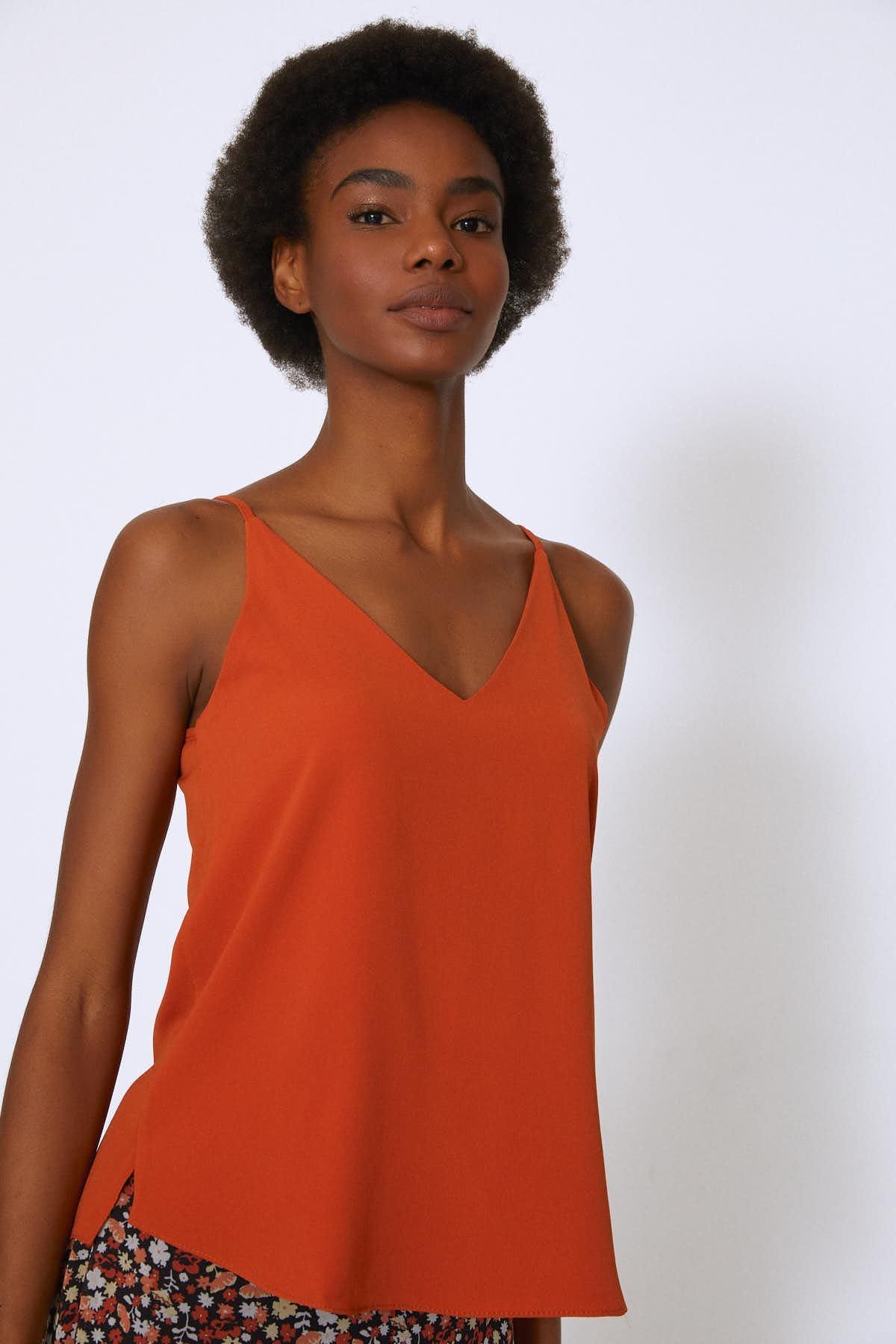 İp Askılı V Yaka Bluz Kiremit