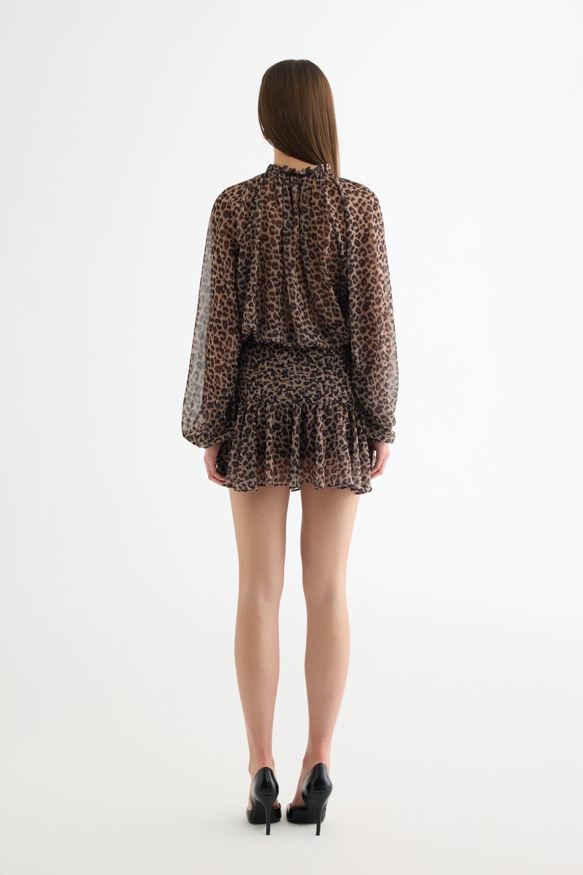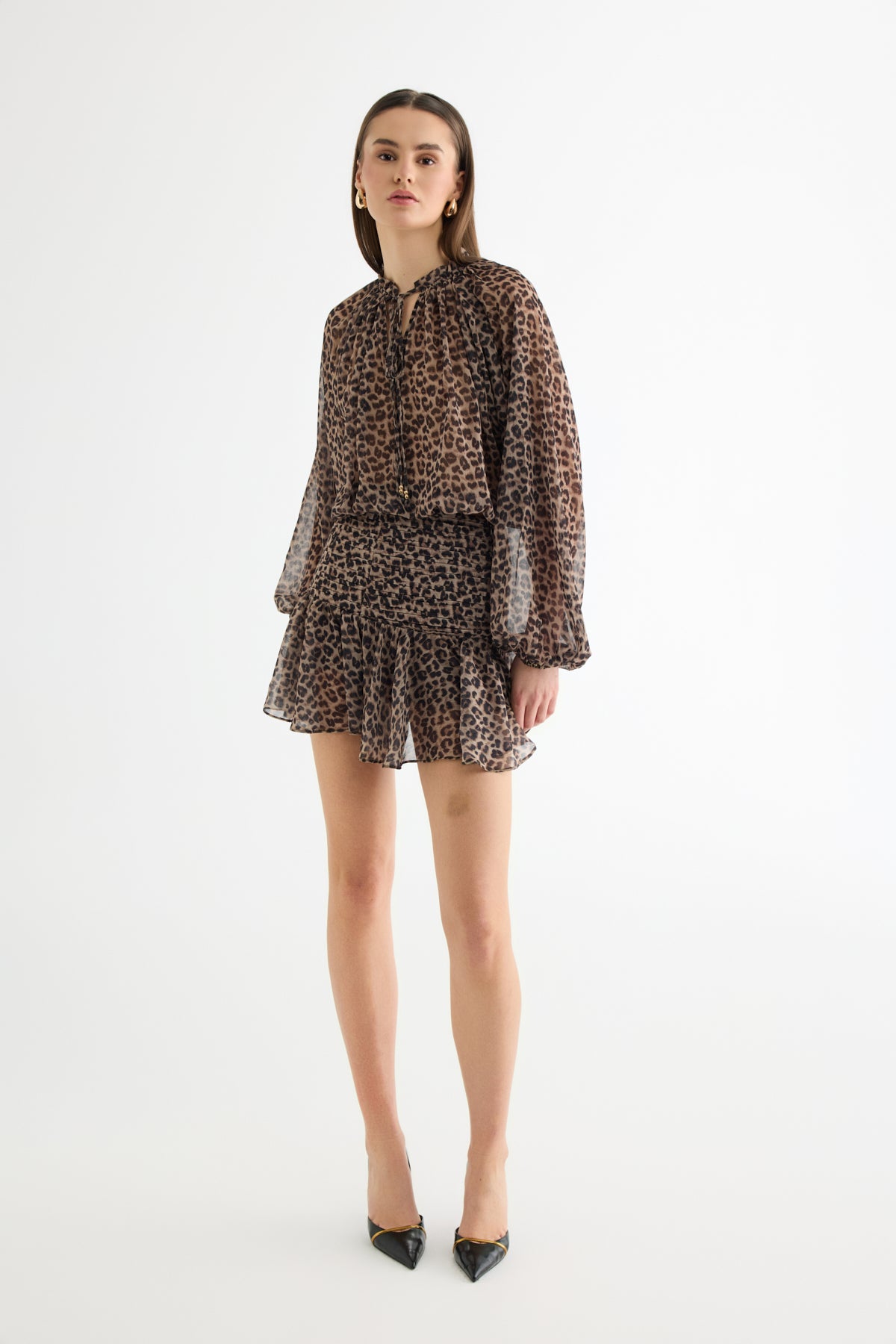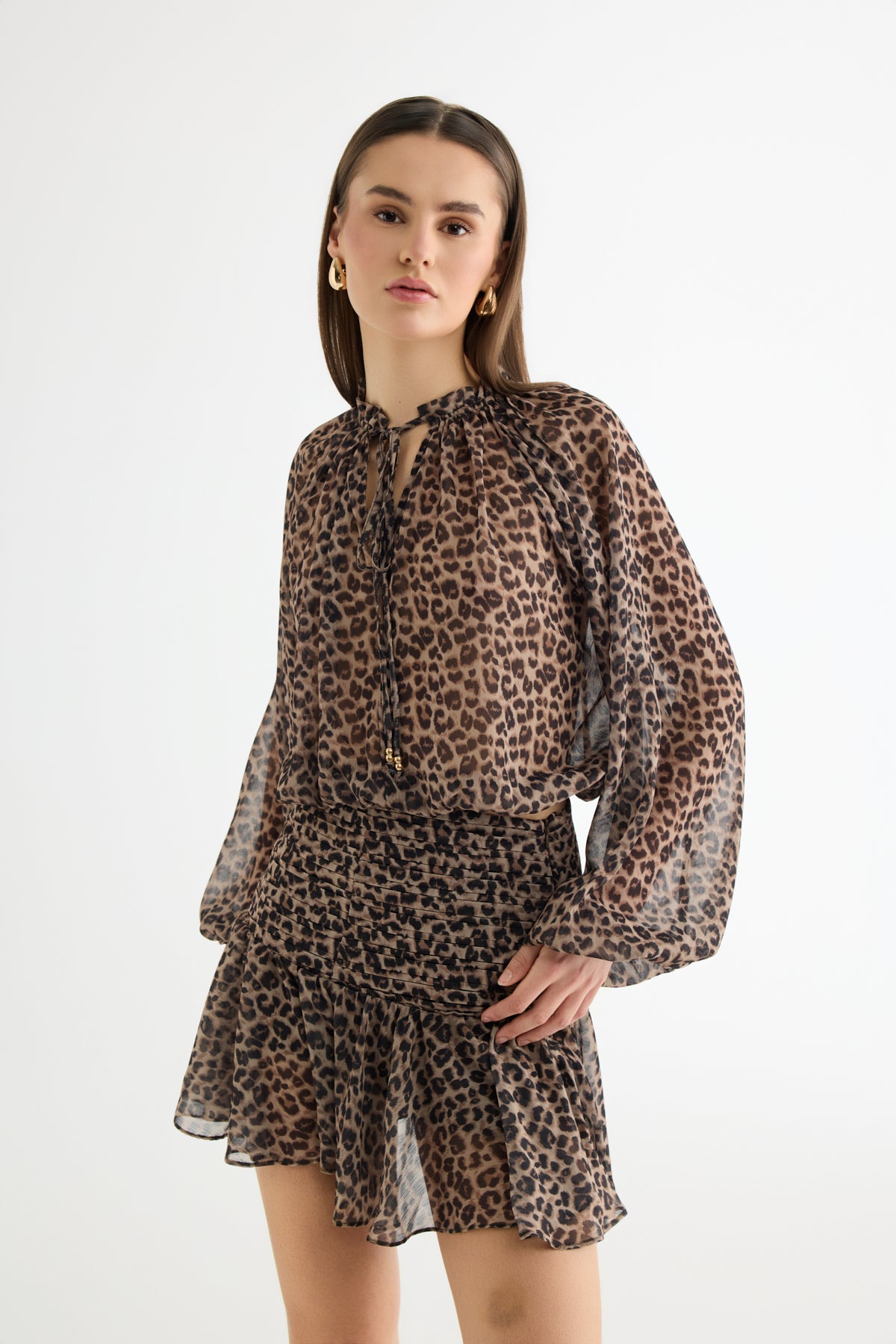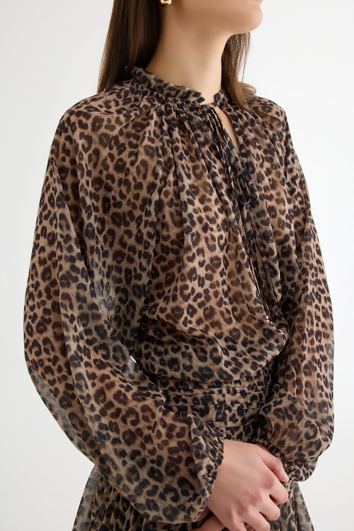 Leopar Desenli Bağcıklı Şifon Bluz Kahverengi