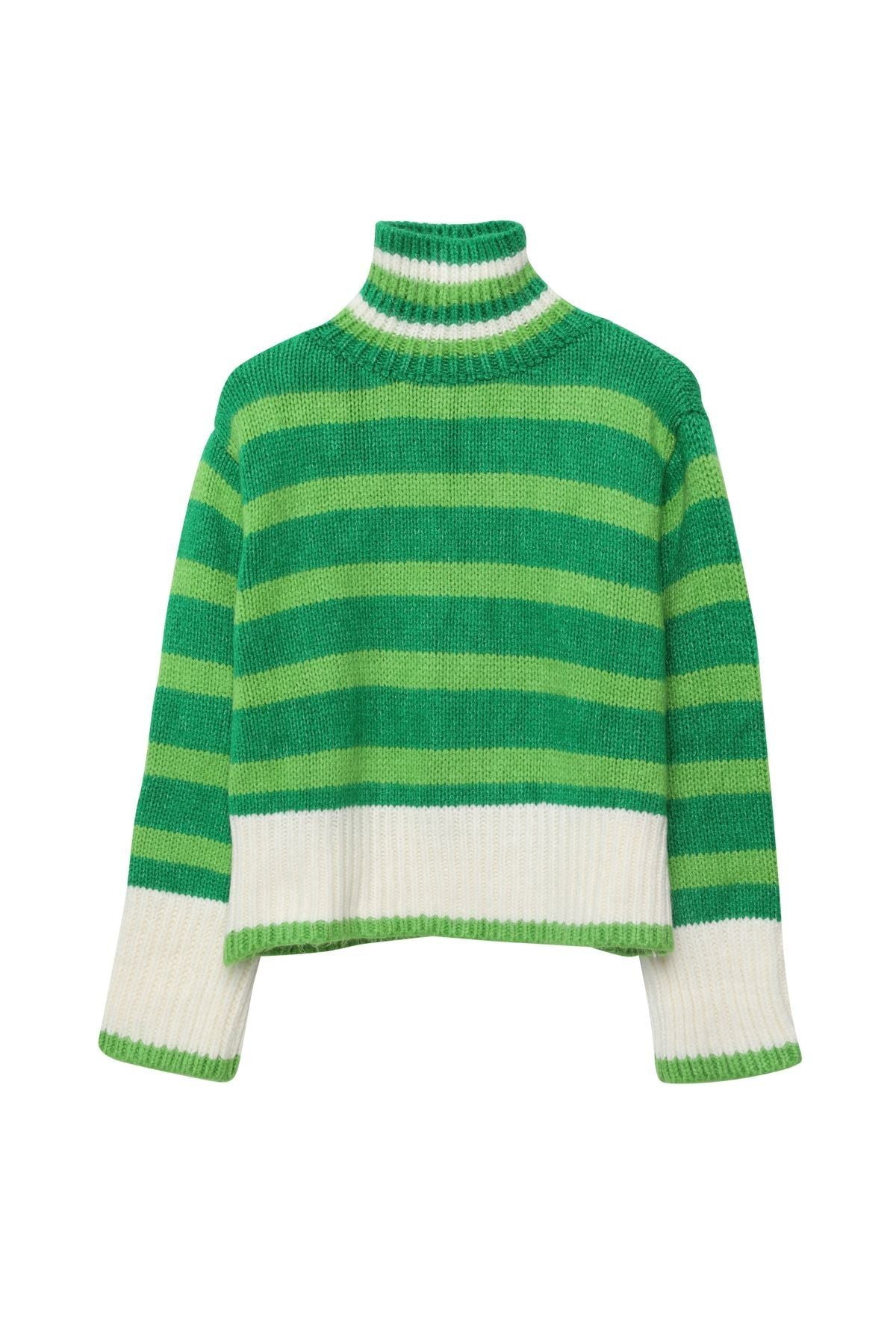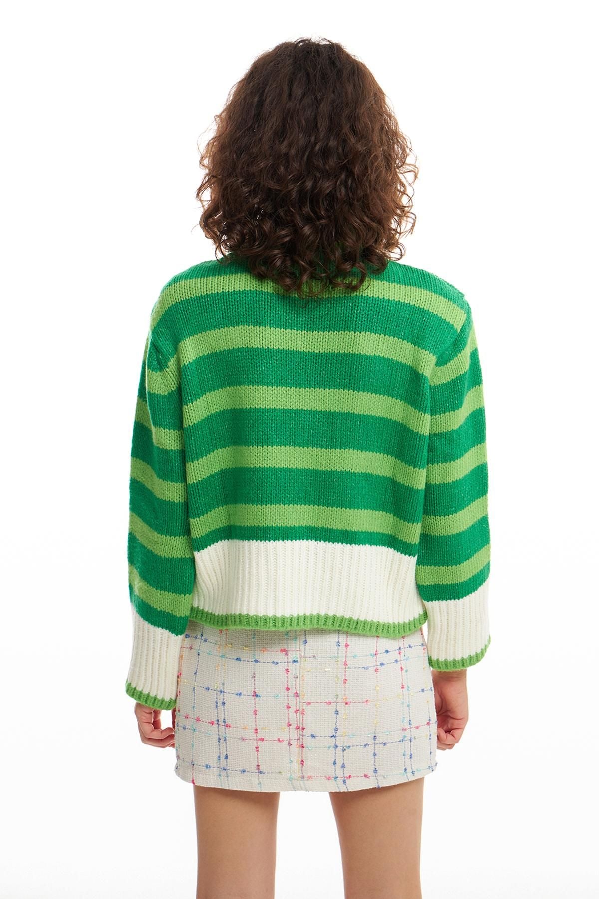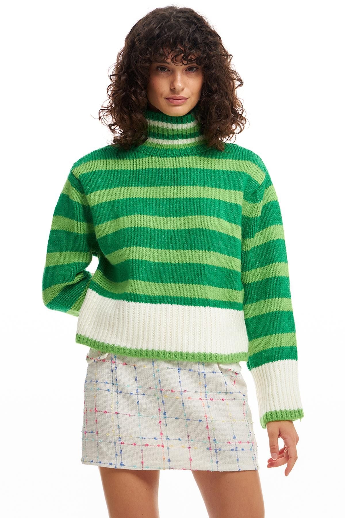 Uzun kollu, kısa boy, rahat kesim, çizgili, boğazlı kazak.
