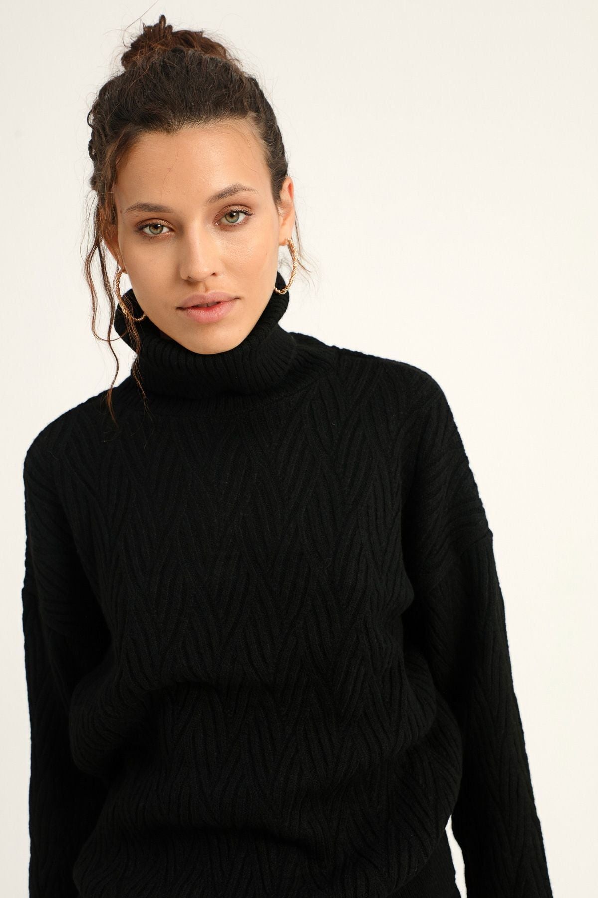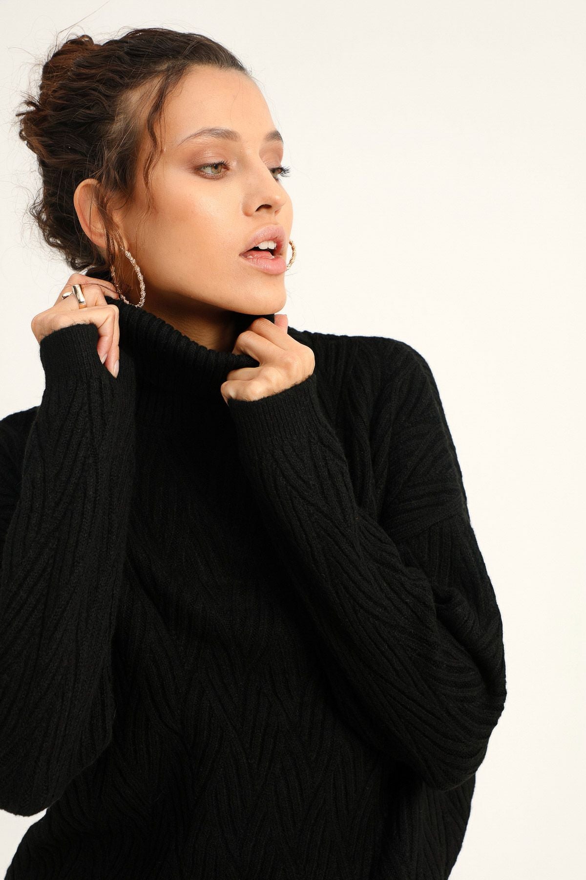 Hipnotik etkiye kendini kaptırmaya ne dersin? Geometrik örgü detaylı boğazlı kazak, sezonun trend renkleriyle içini ısıtarak seni hipnotize etmeye hazırlanıyor! Düşük omuzlu, bedenden uzak formu ile hareketlerine özgürlük katacak boğazlı kazak modeli, kombinini birleştireceğin parçalara da mucizevi dokunuşlar yapacak! Piliseli eteklerini, deri pantolonları ya da jeanlerini şimdiden hazırla, seçim yapmak zorlaşacak!