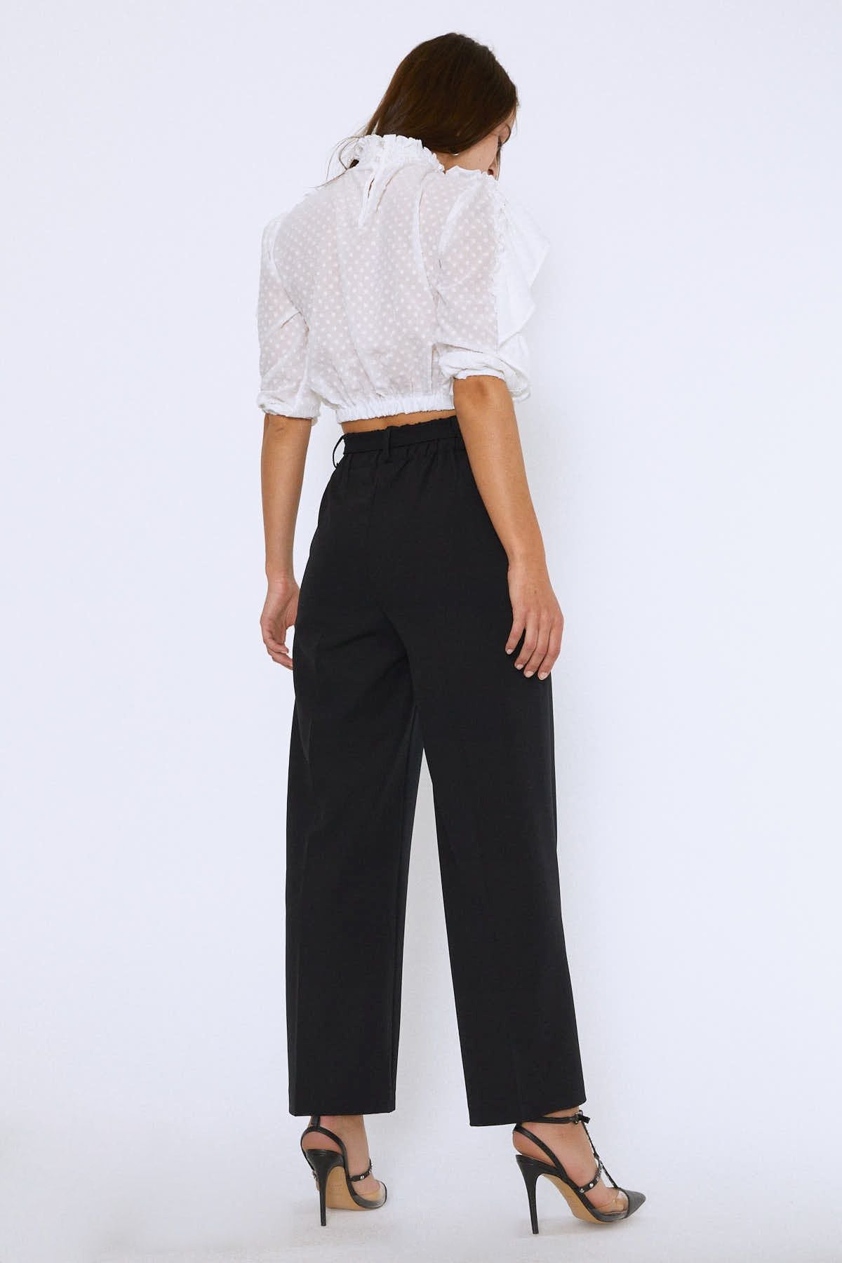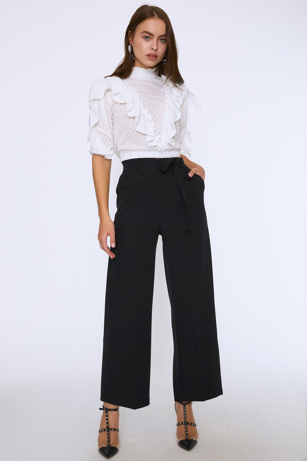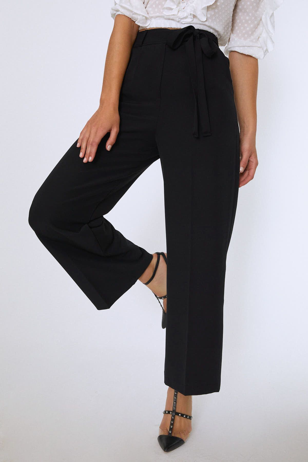 Beli Bağlamalı Geniş Paça Pantolon Siyah