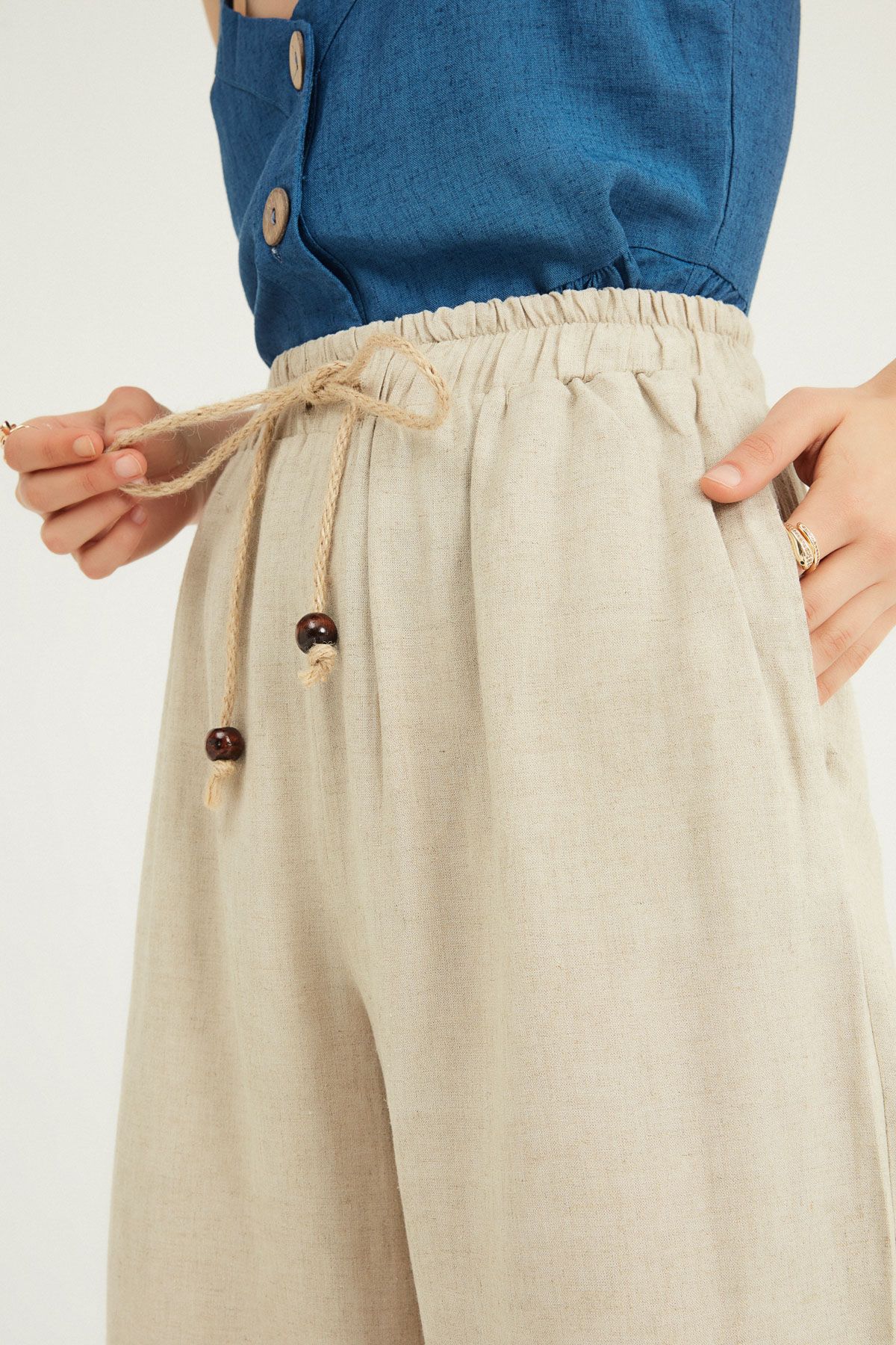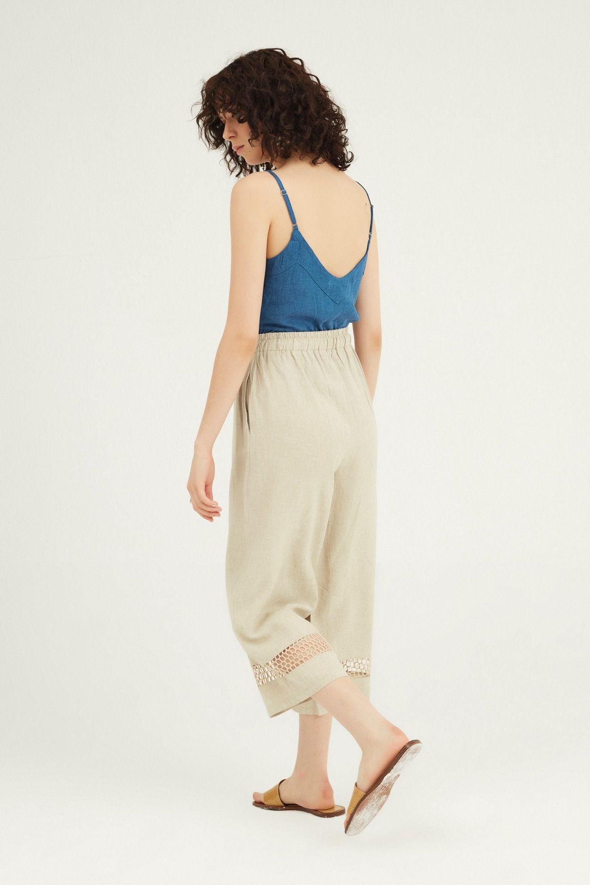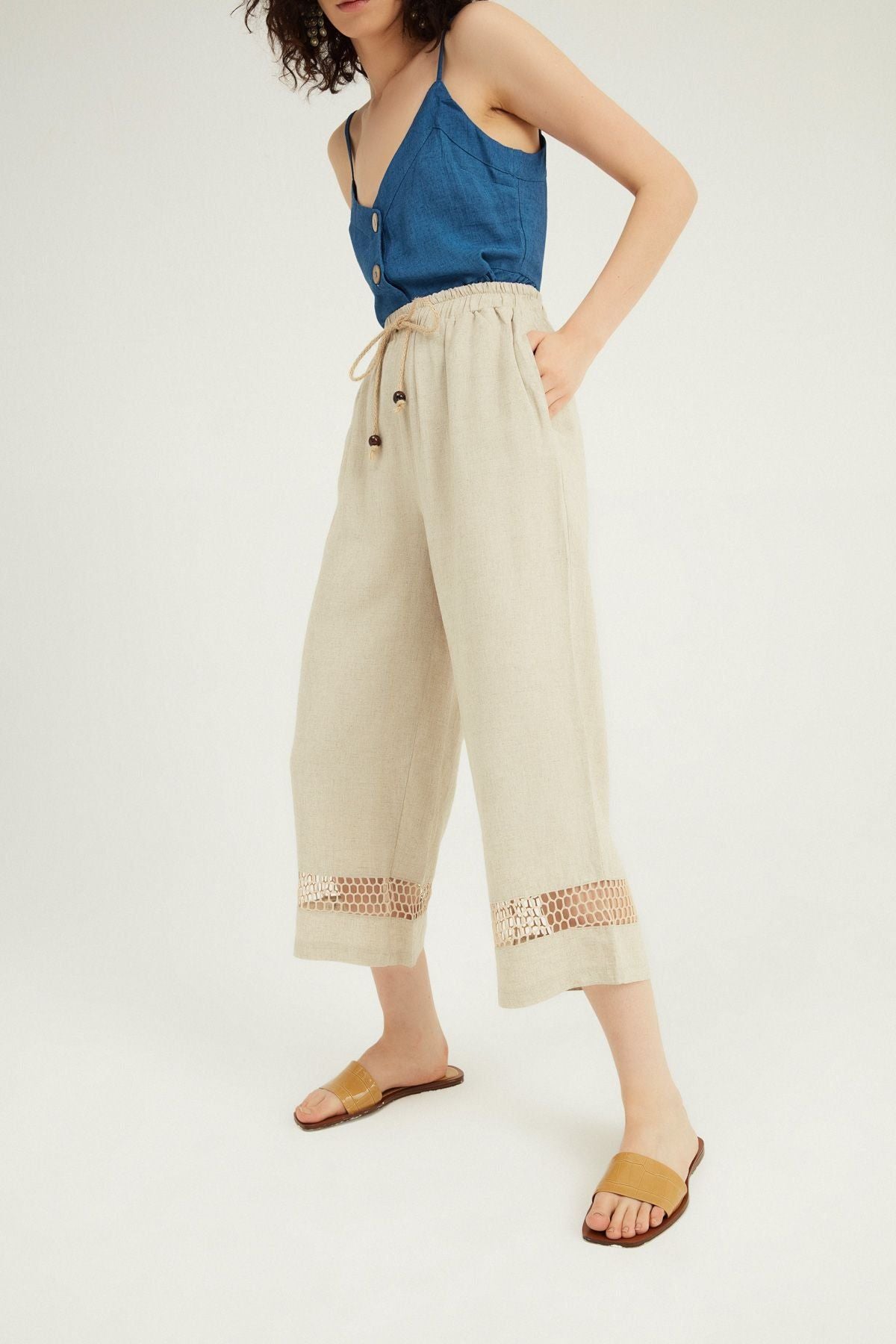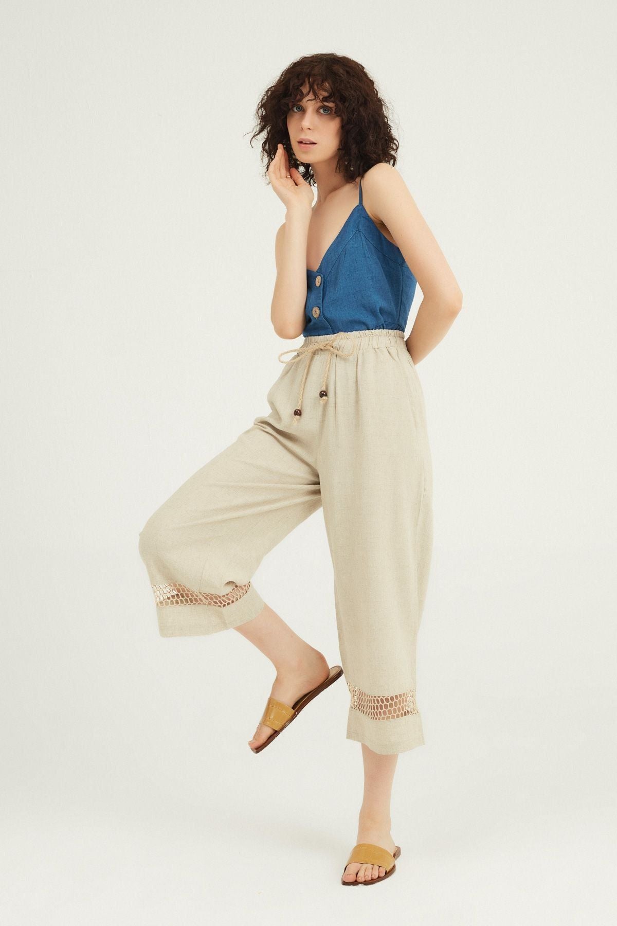 Pamuk keten karışımı ve rahat kesimi ile file detaylı hasır kemerli pantolon rahatndan ödün vermeyen kadınların kombinlerinin vazgeçimez bir parçası.