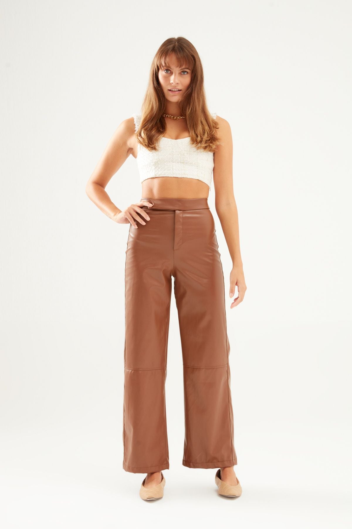 Gündüz ve gece tercih edebileceğin deri pantolon modeline harika bir kalıp ekledik! Sonbahar ve kış aylarında kullanabileceğin, parlak deri dokulu ve geniş paça deri pantolon modelini uzun hırka, salaş kazak ve şık bluz ile kombinleyebilirsin. Yüksel bel model deri pantolonu crop bluz ile kombinleyerek ayrı bir şıklık yaratabilirsin.