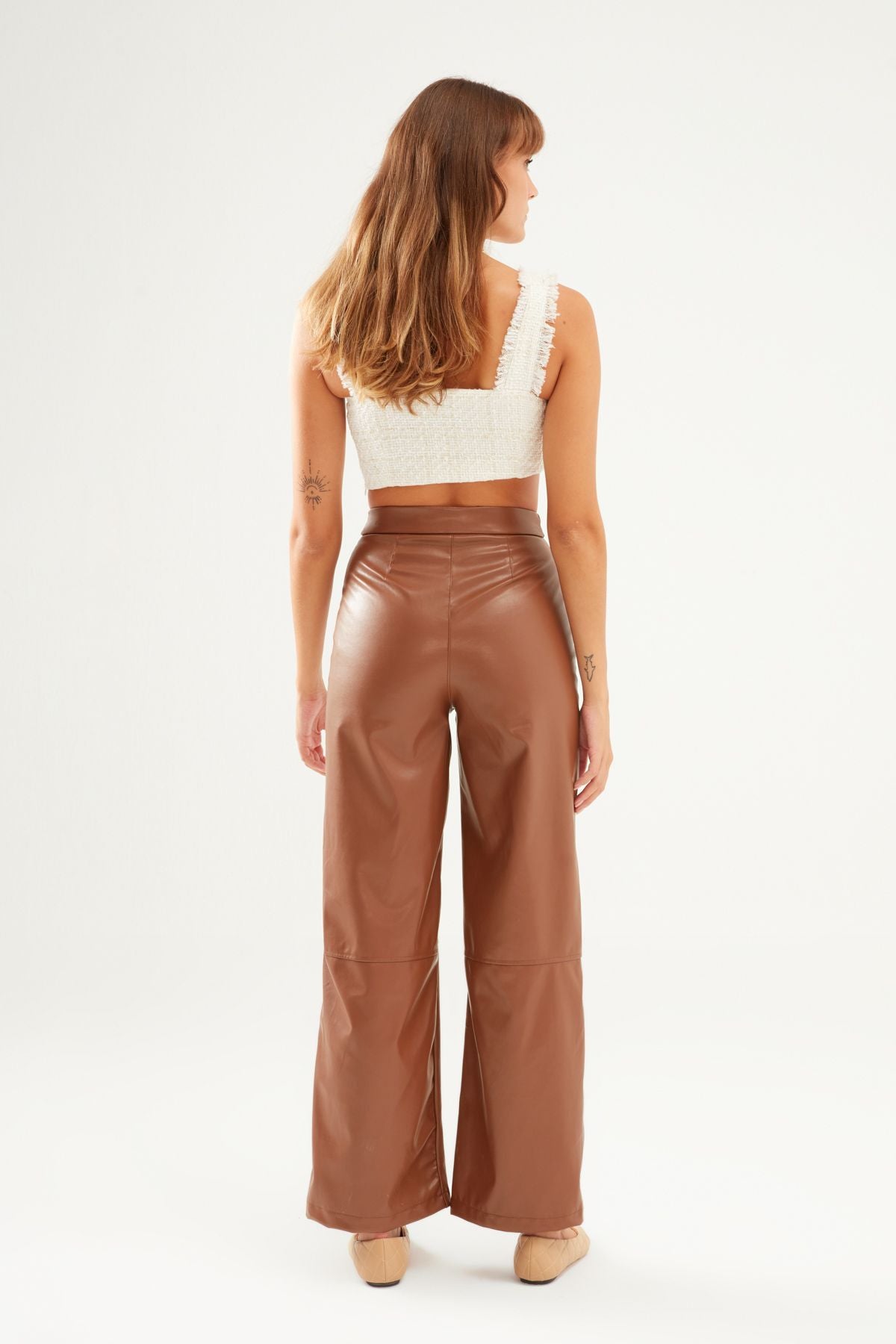 Geniş Paça Deri Pantolon Camel